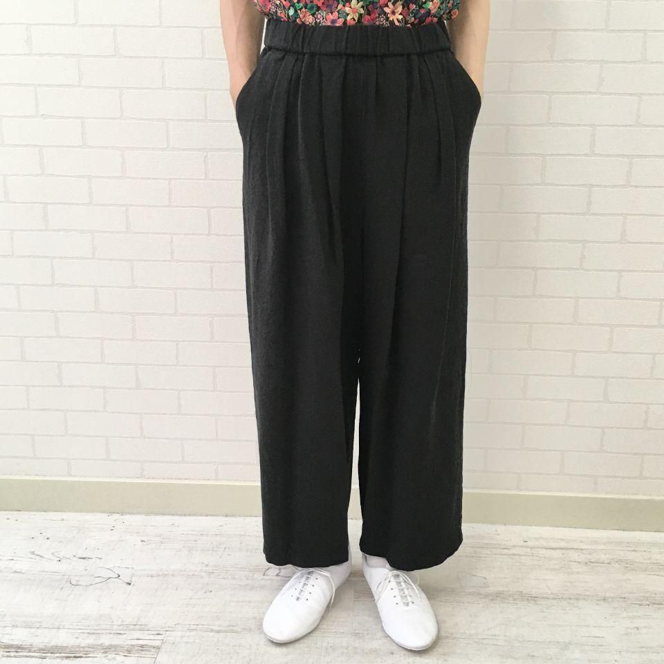 腰回りにゆったり、リラックスを感じて頂ける分量を持たせ、そこから裾に向かって、ストン!と落としたシルエットでワイドパンツと表現していますが、すっきりストレートのシルエット。
