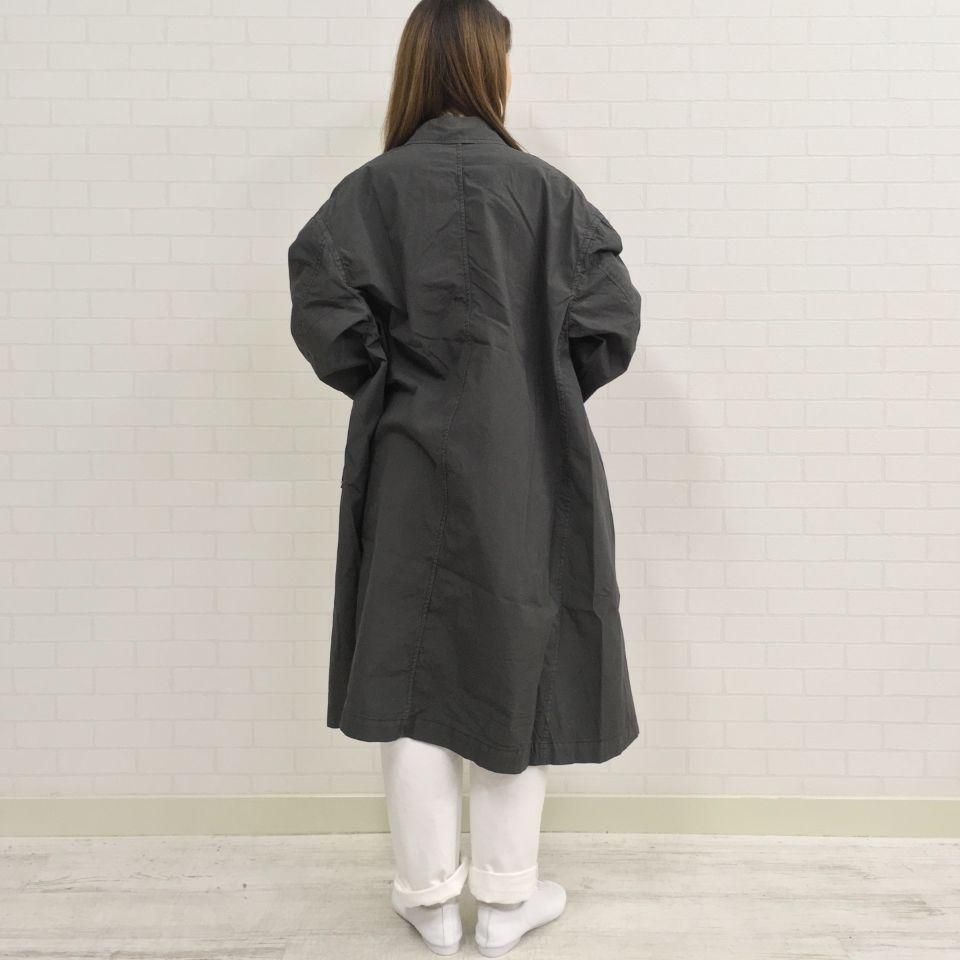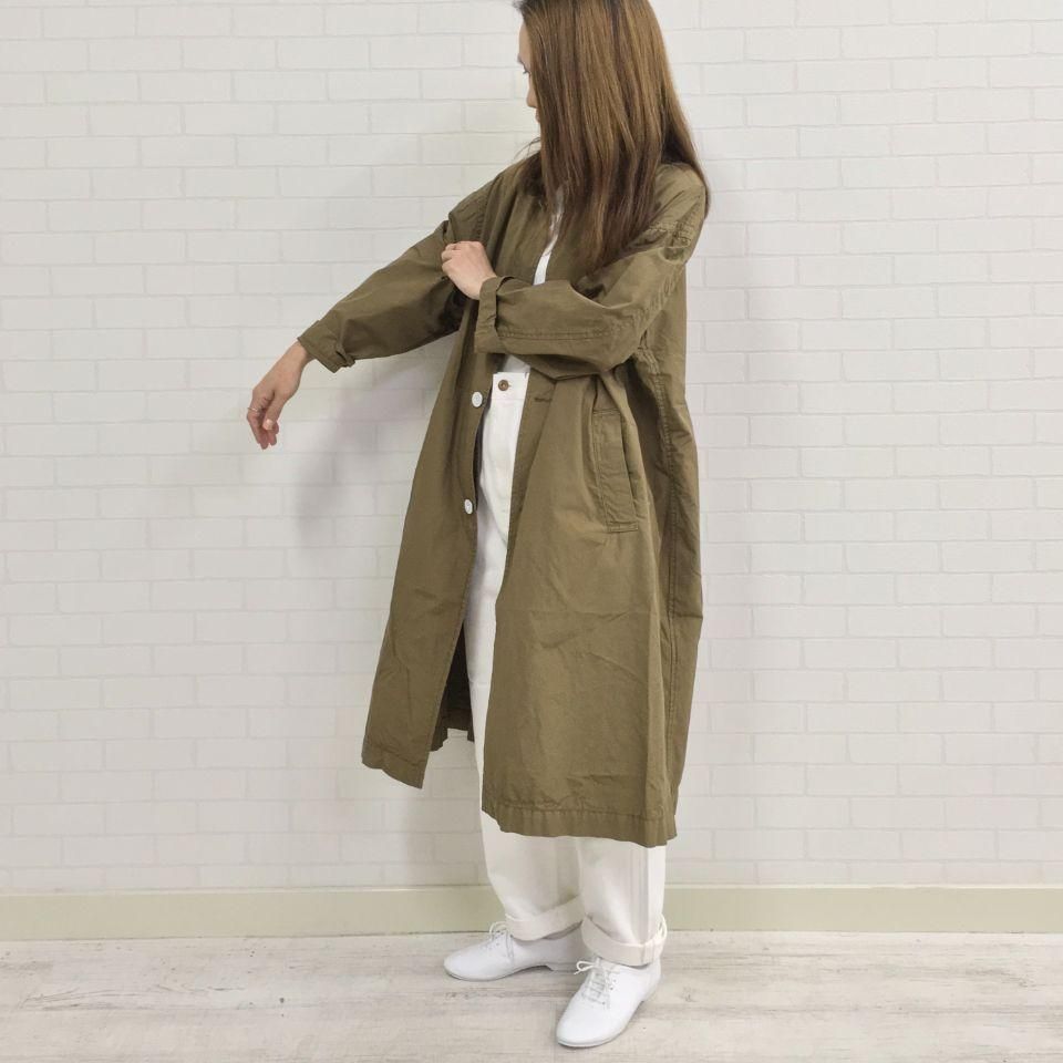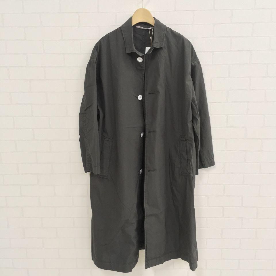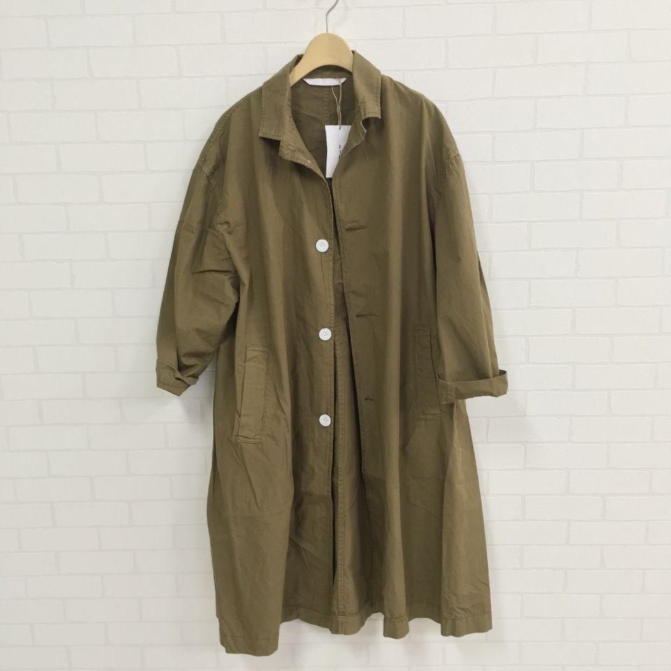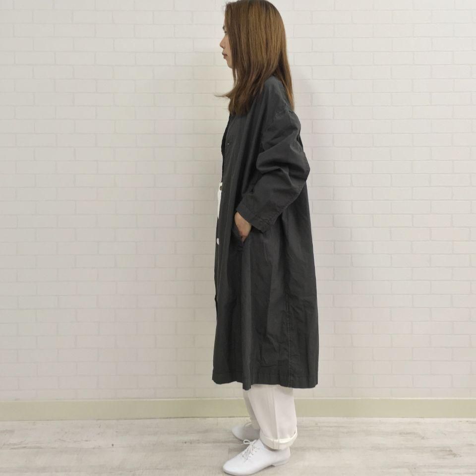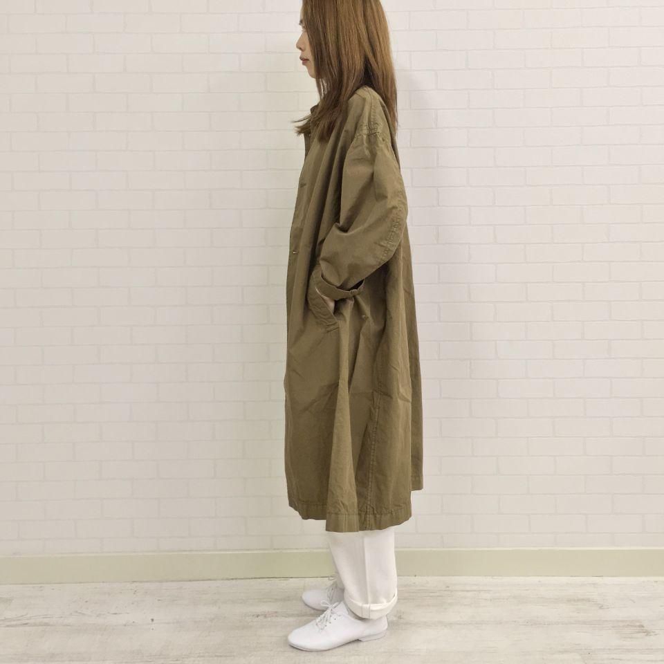 そんなハードになりがちな素材をFURALIが使うと、こんなすっきりした、綺麗目なステンカラーコートに成ります!