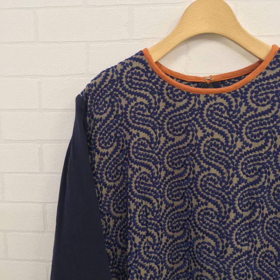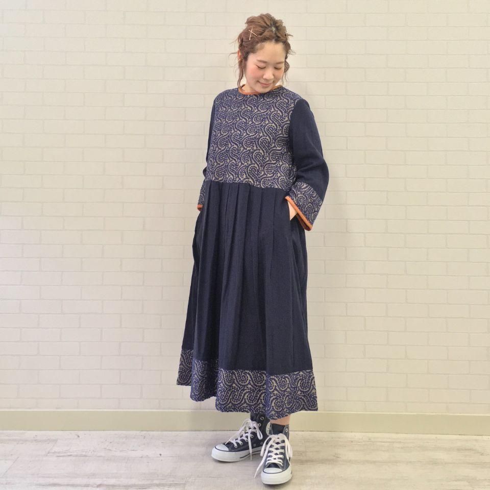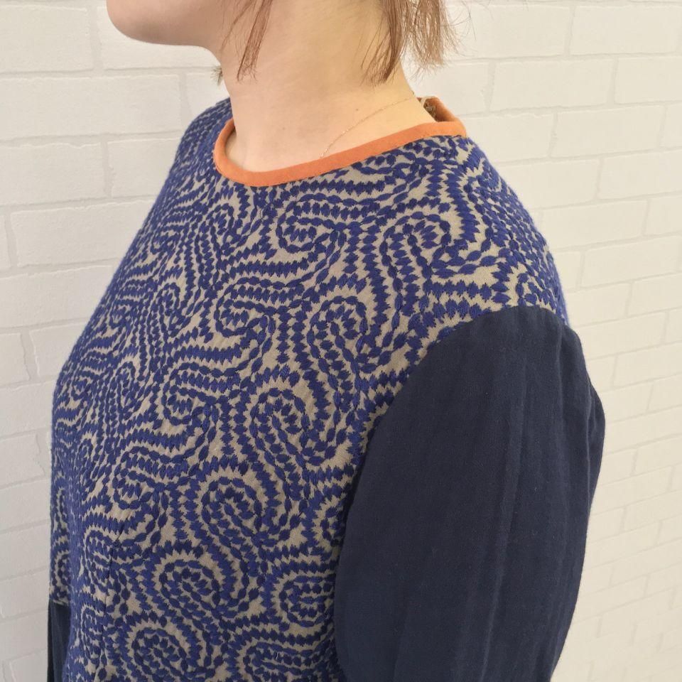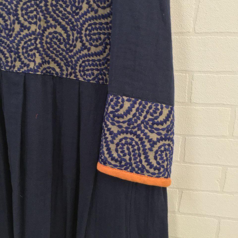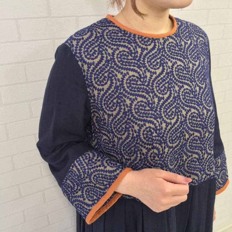 シックなネイビーと、大柄の刺繍の生地を組み合わせ。