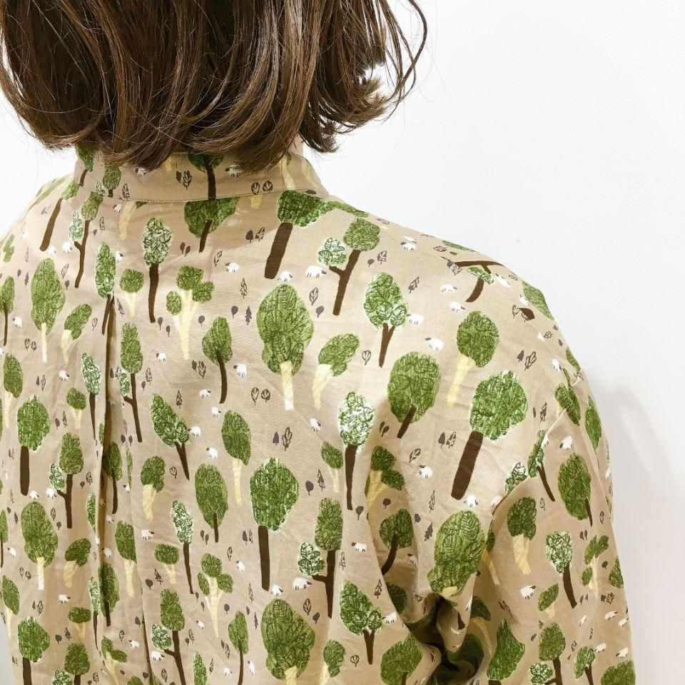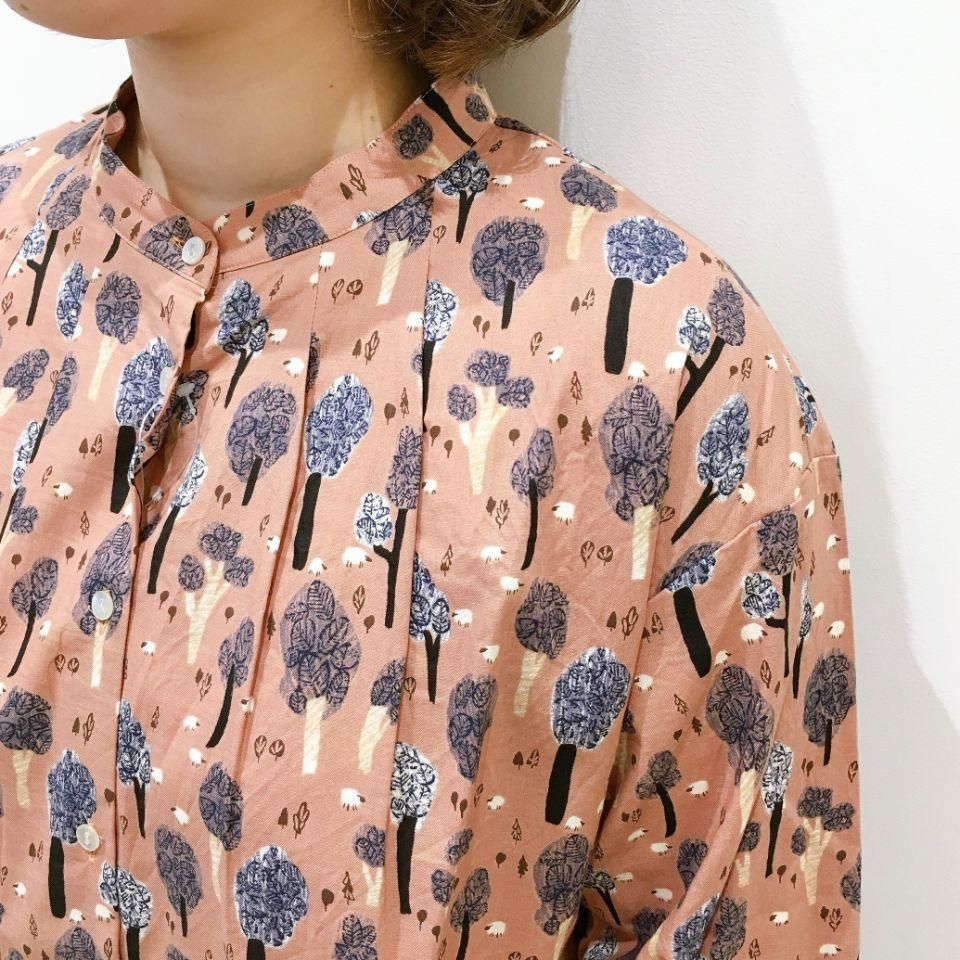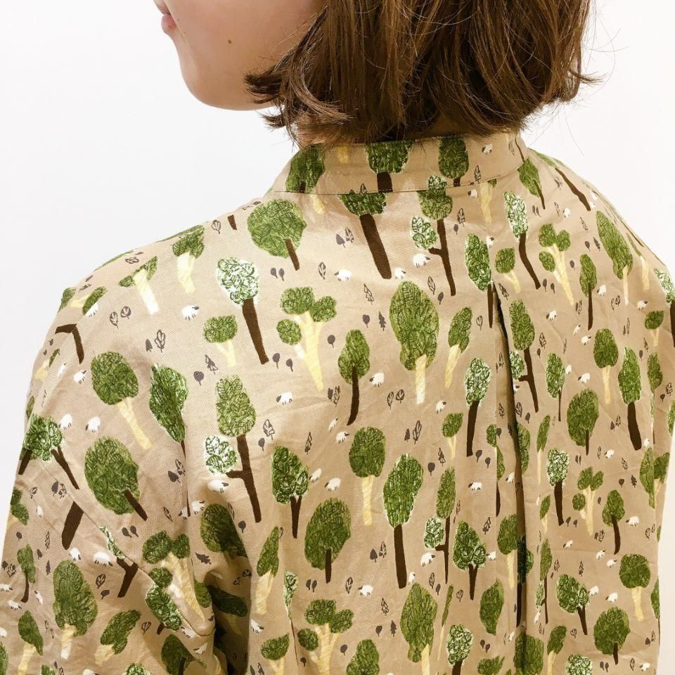 30スケア 羊と森柄 バンドカラーのタックシャツ