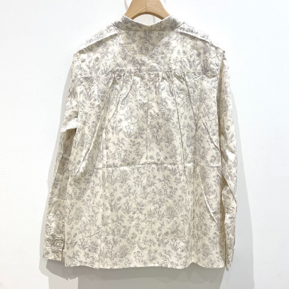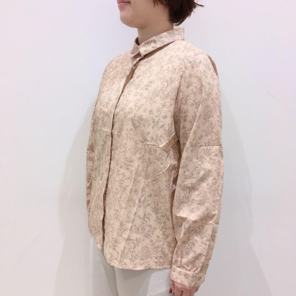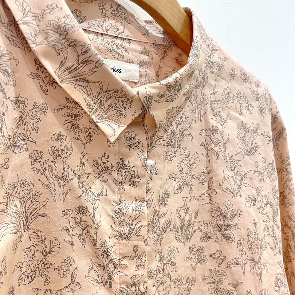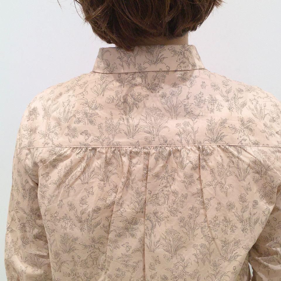 草花や野山に棲む動物たちがプリントされた優しい色味の比翼シャツ。