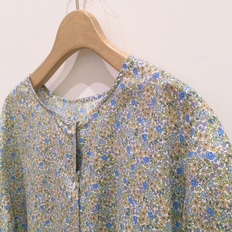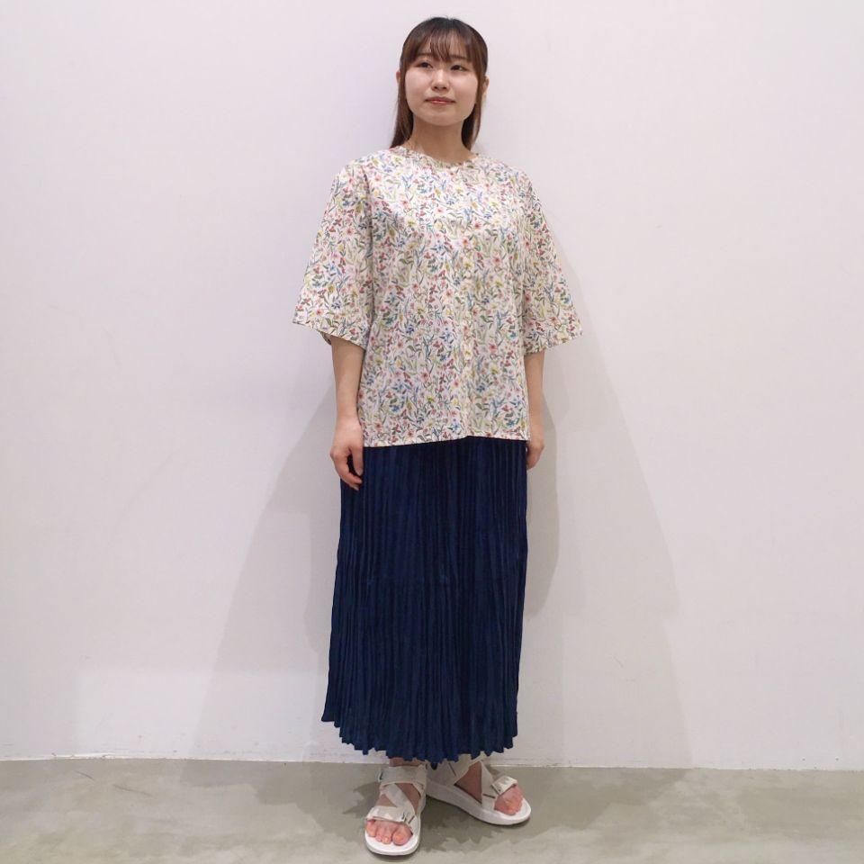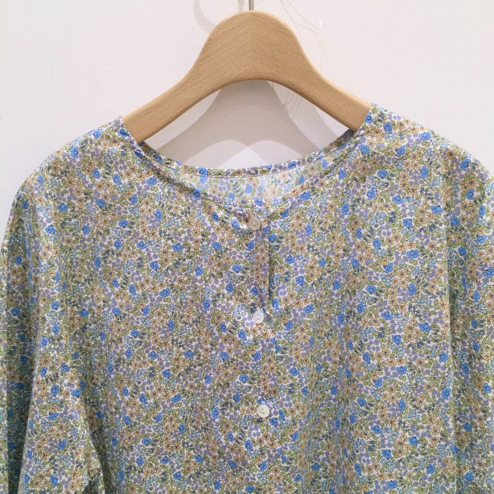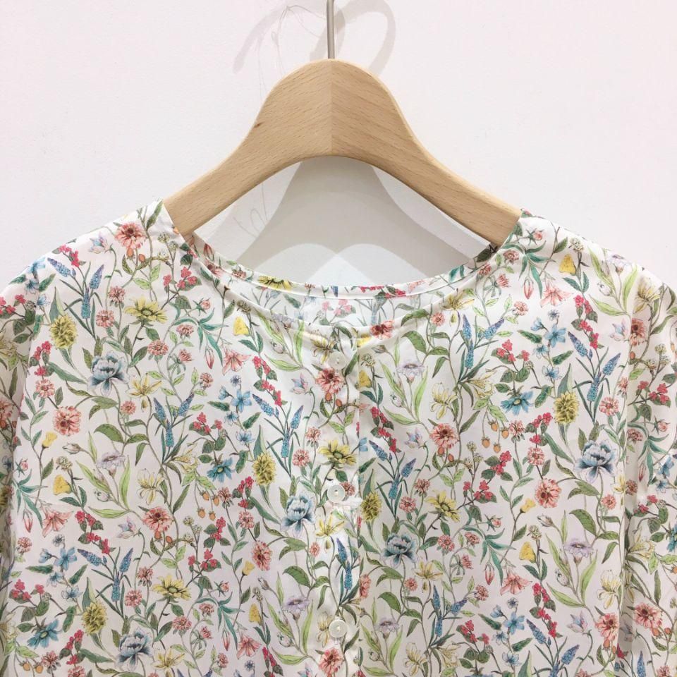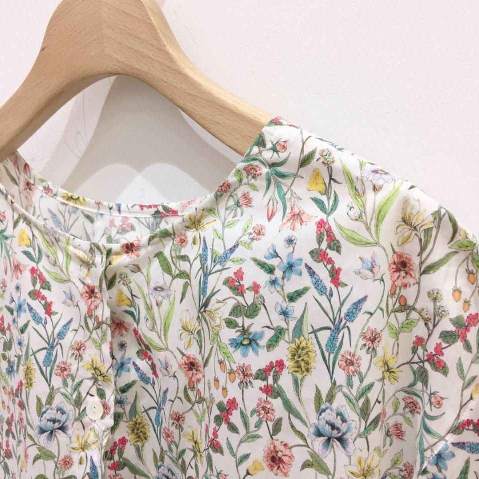 女性らしい華やかなリバティープリントの5分袖ブラウス。