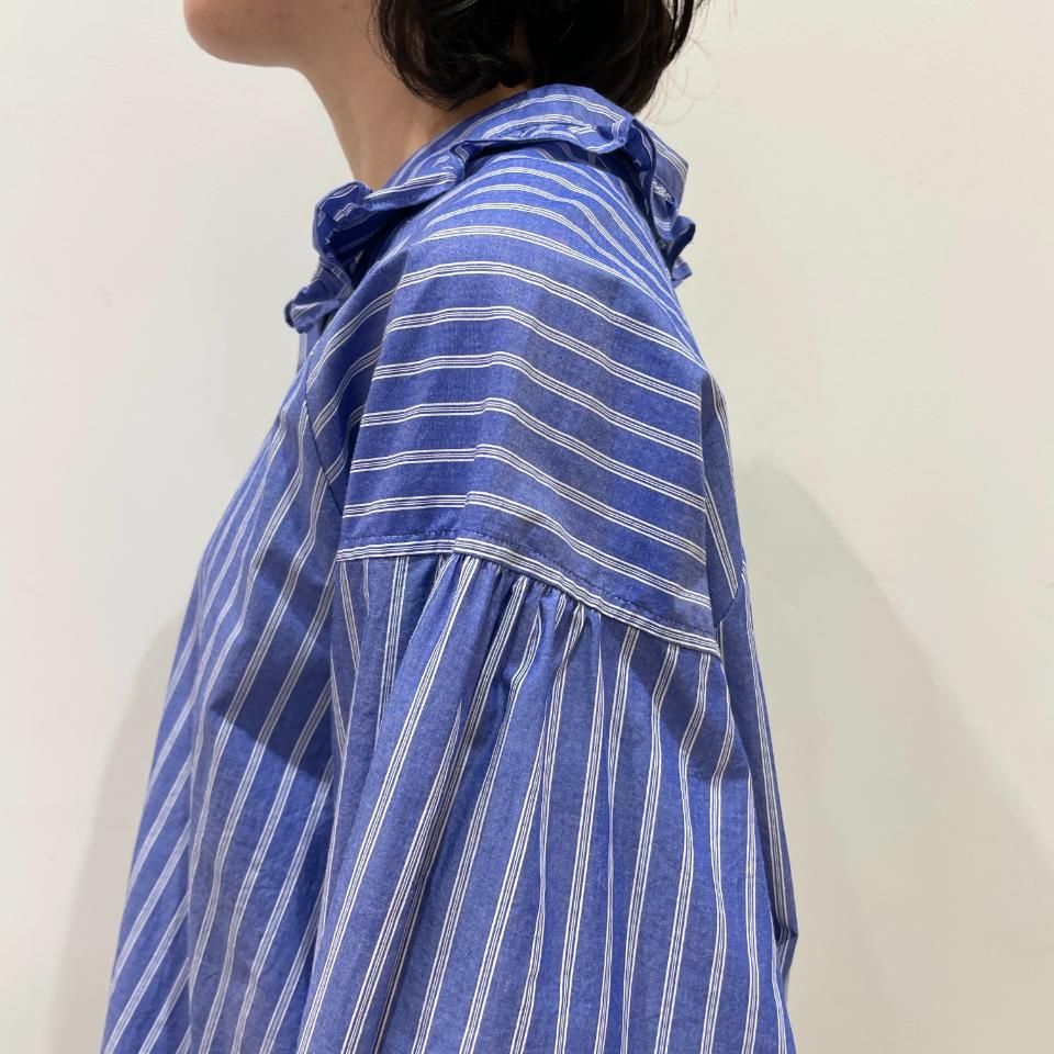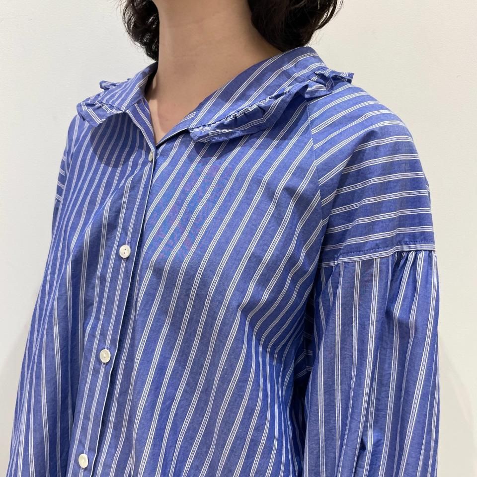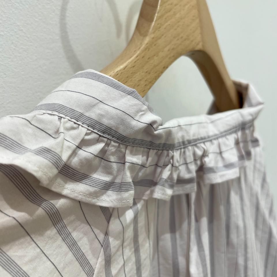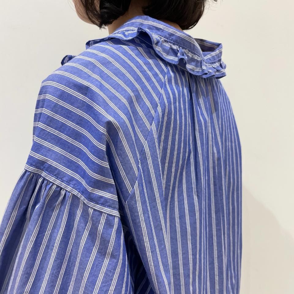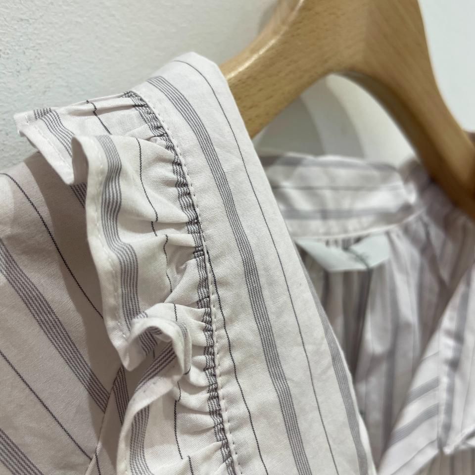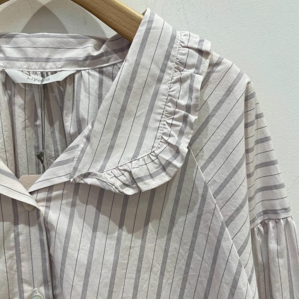 スタイリングを爽やかに演出するストライプ柄のフリルシャツ。