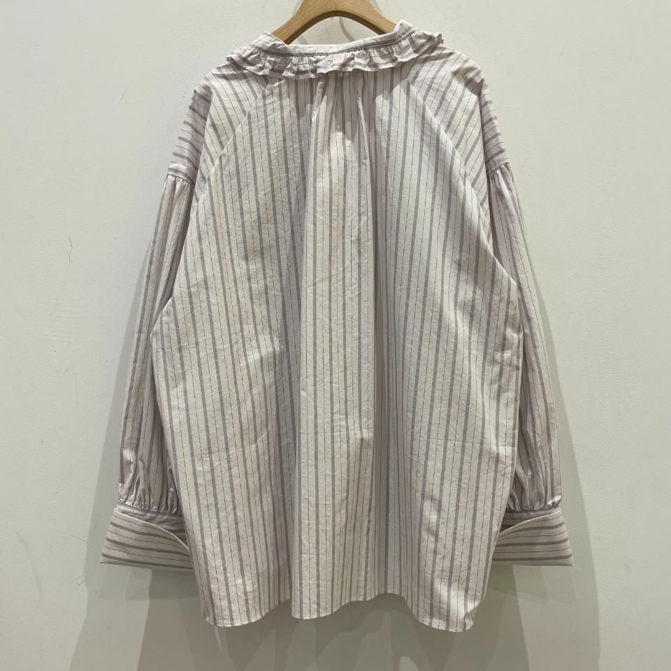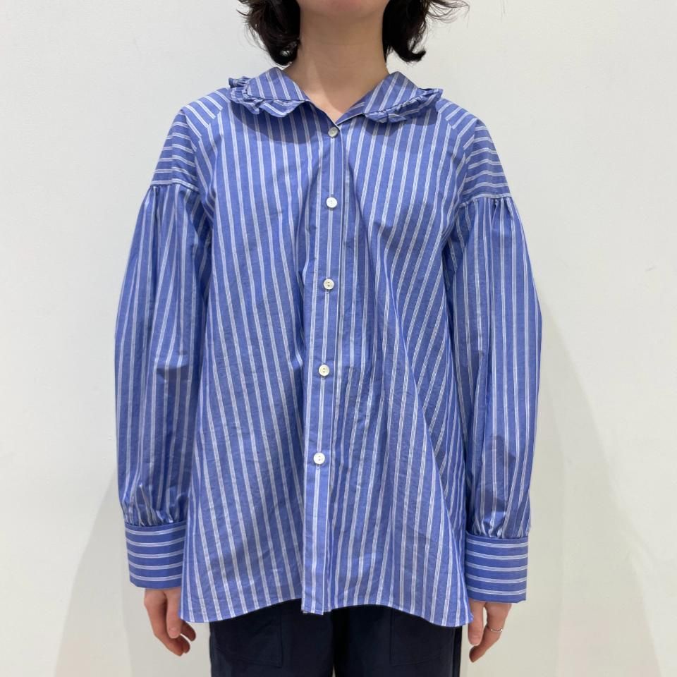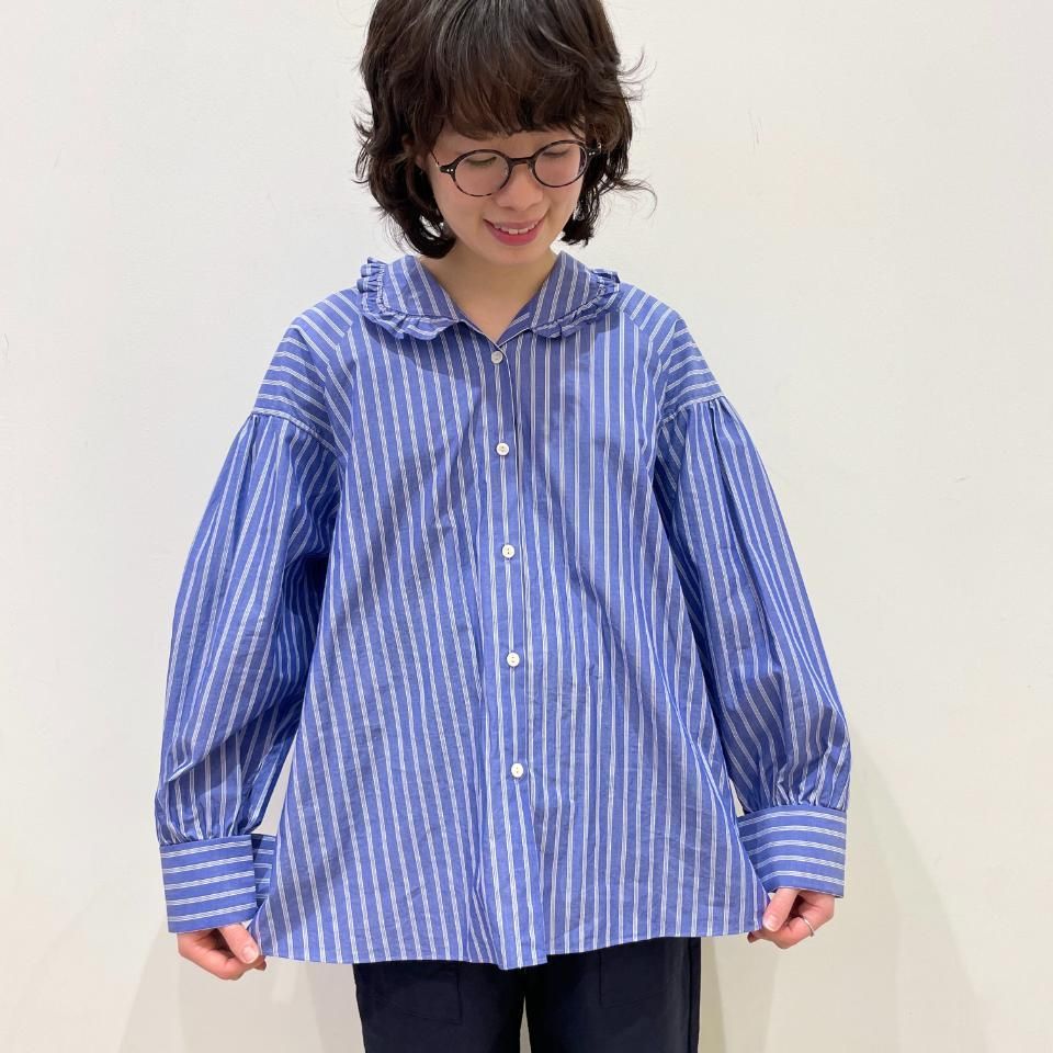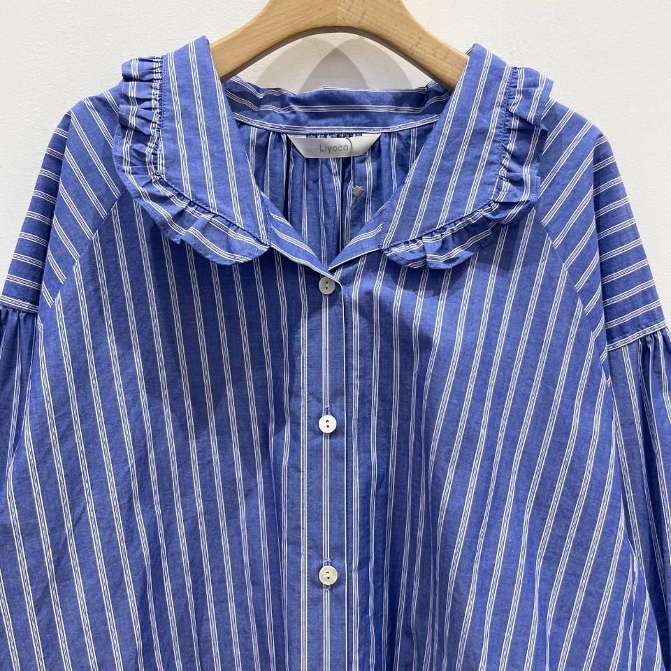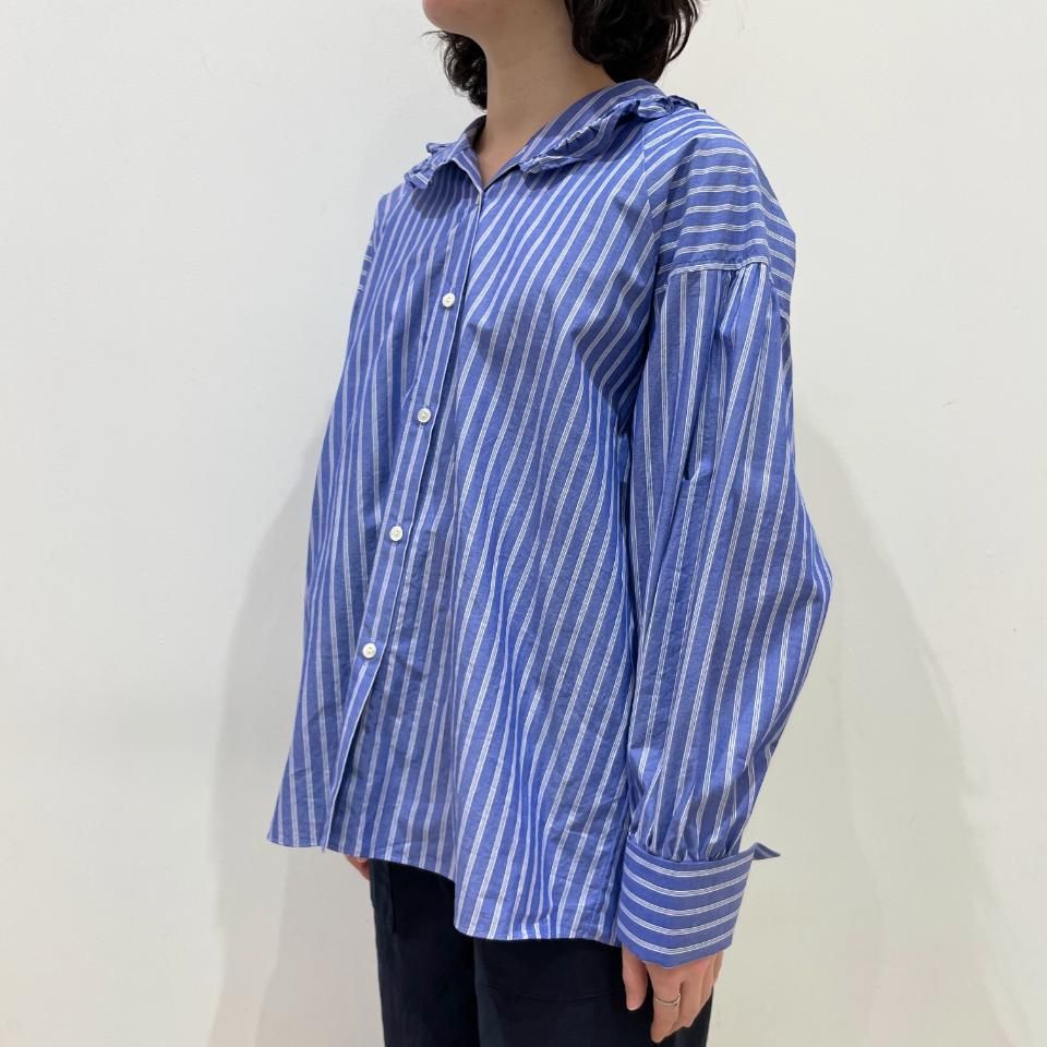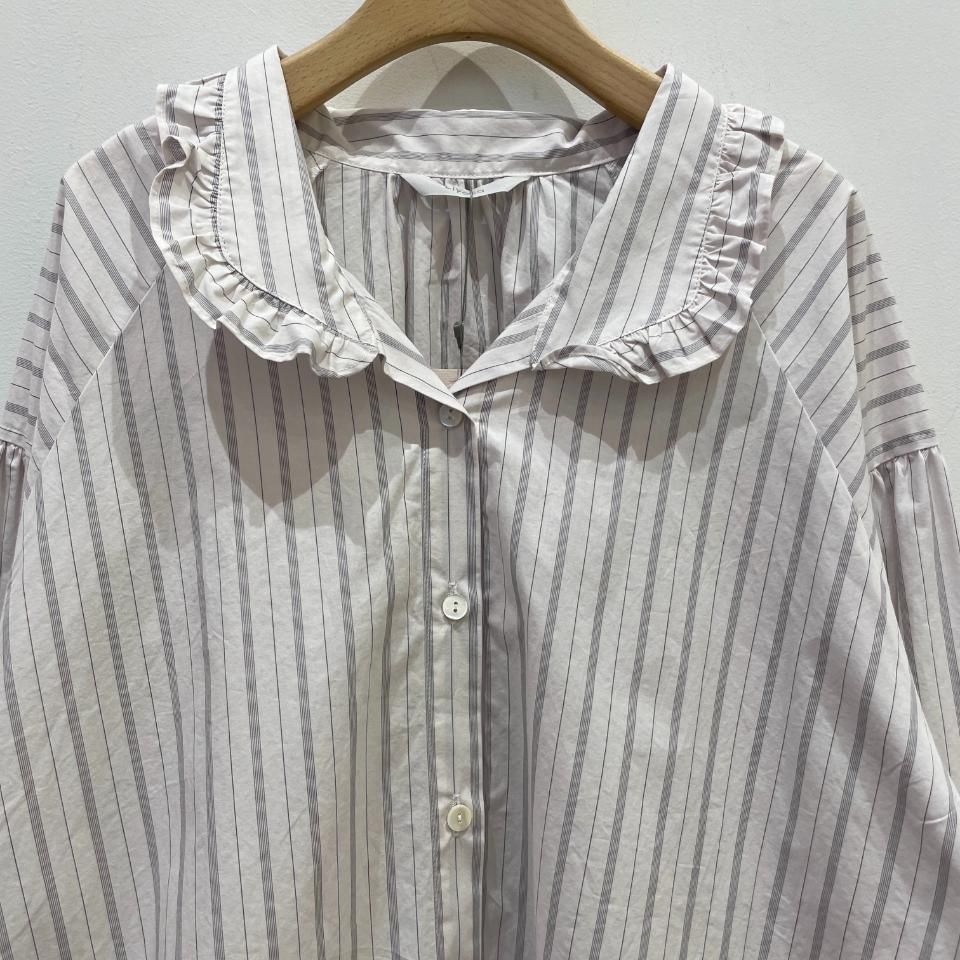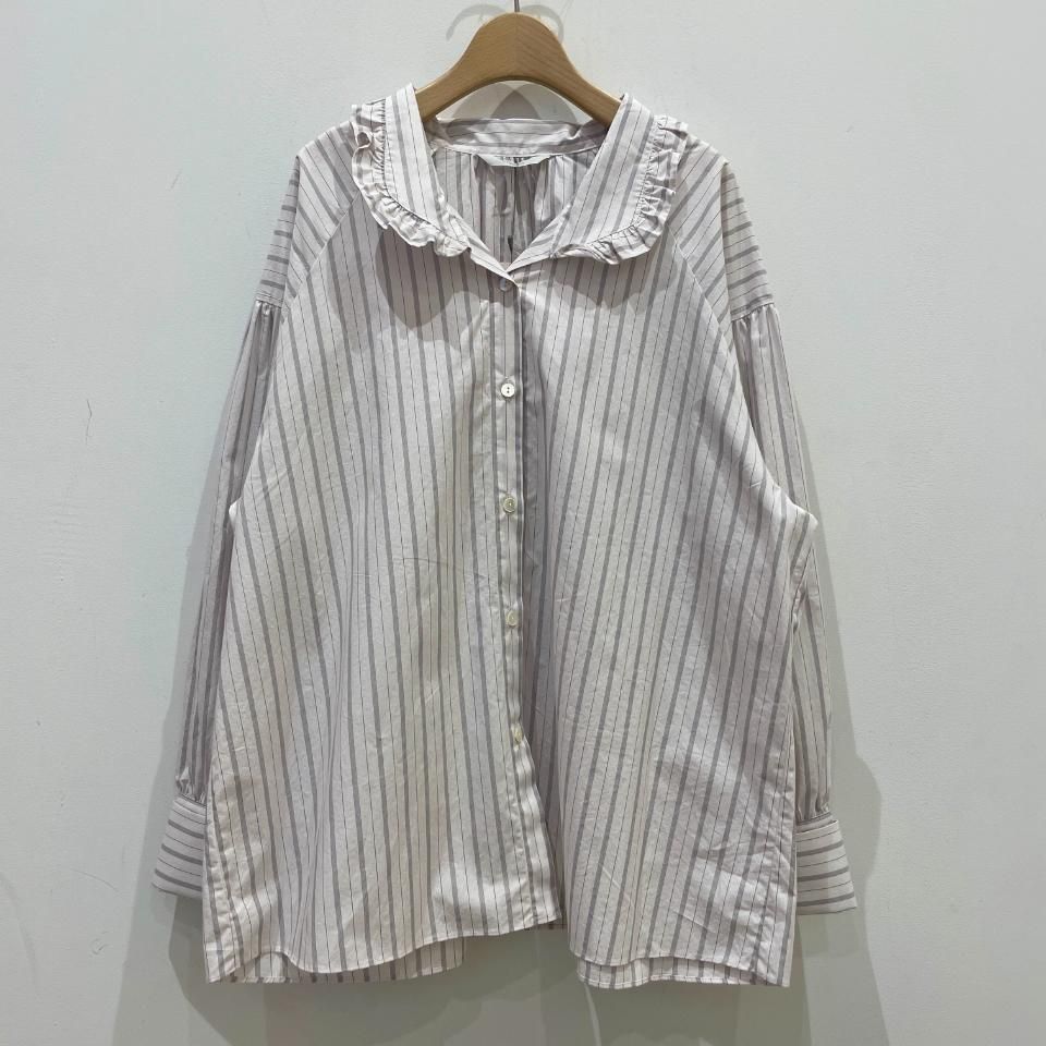 スタイリングを爽やかに演出するストライプ柄のフリルシャツ。