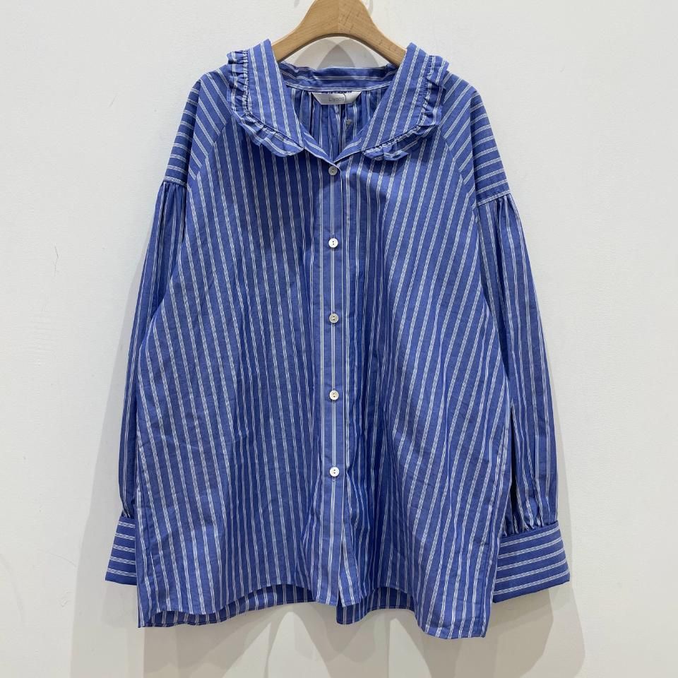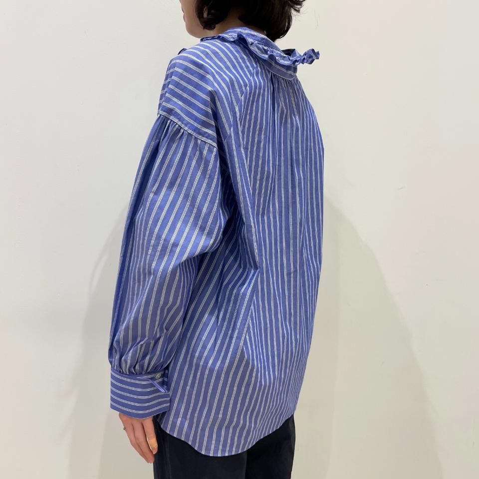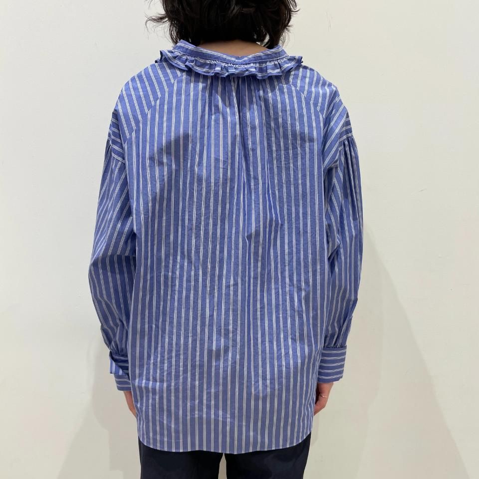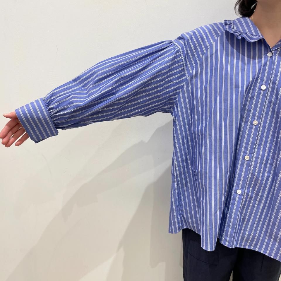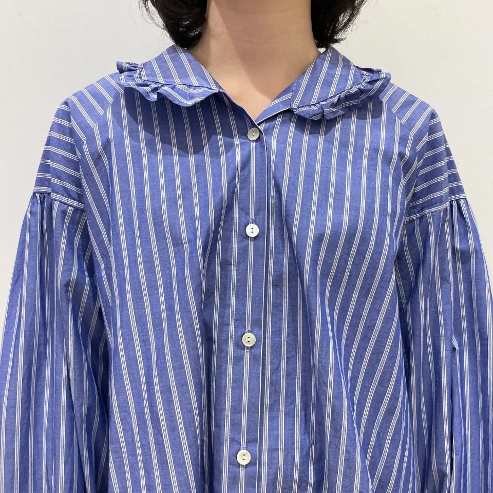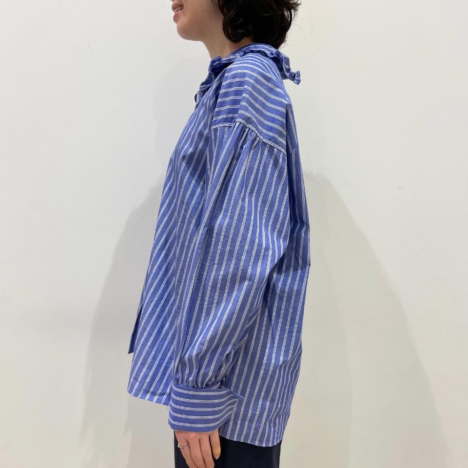 スタイリングを爽やかに演出するストライプ柄のフリルシャツ。
