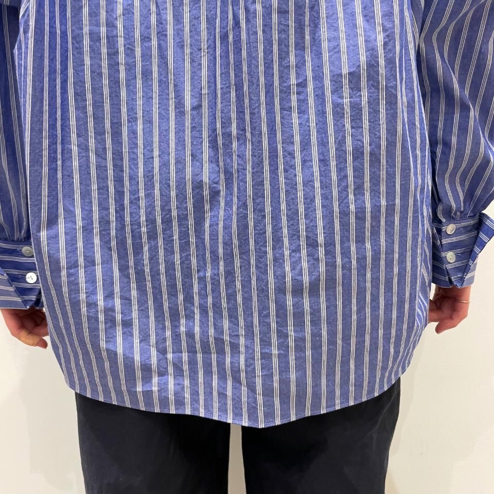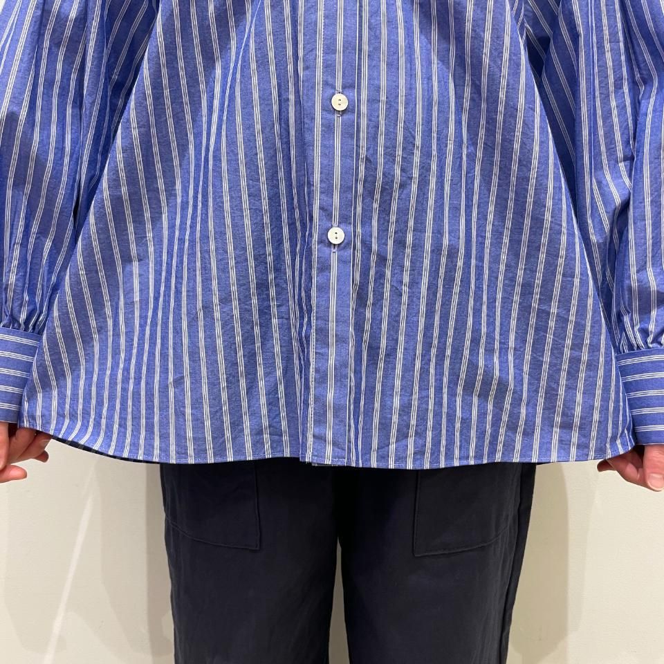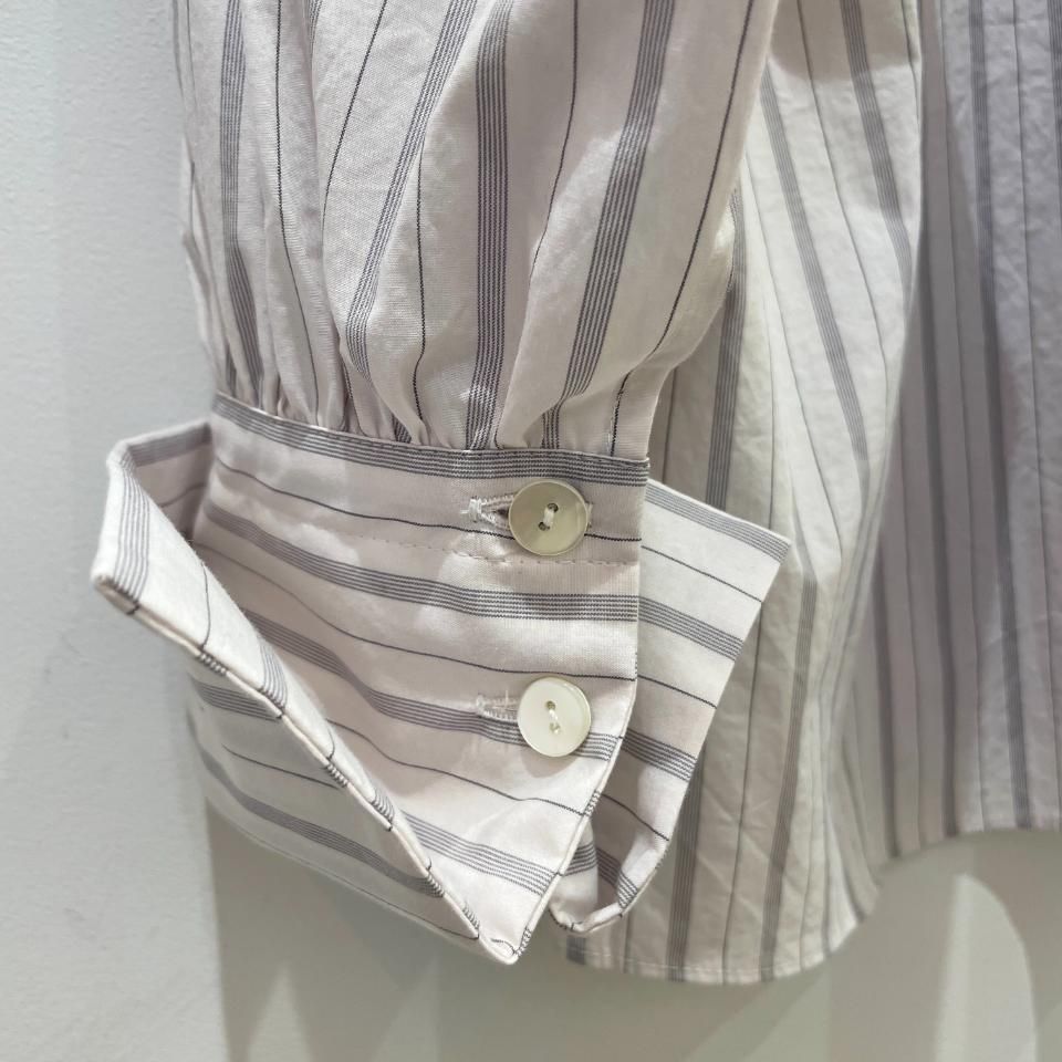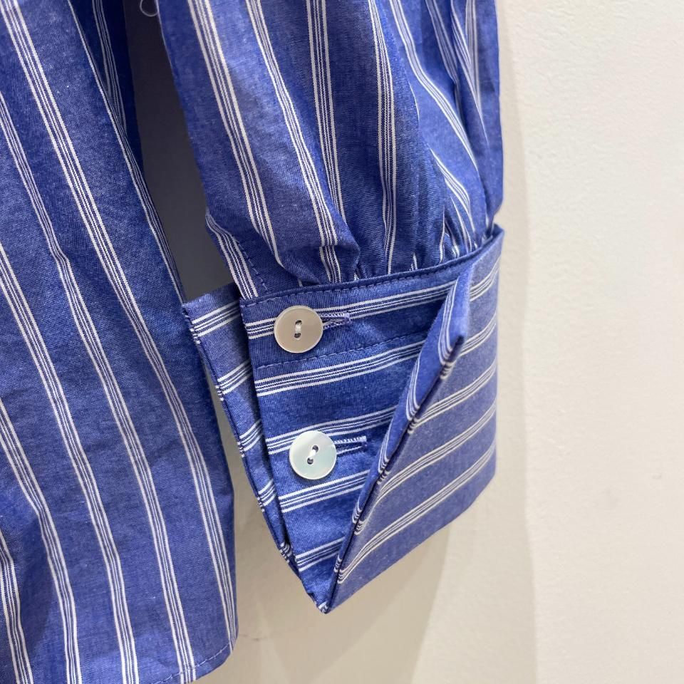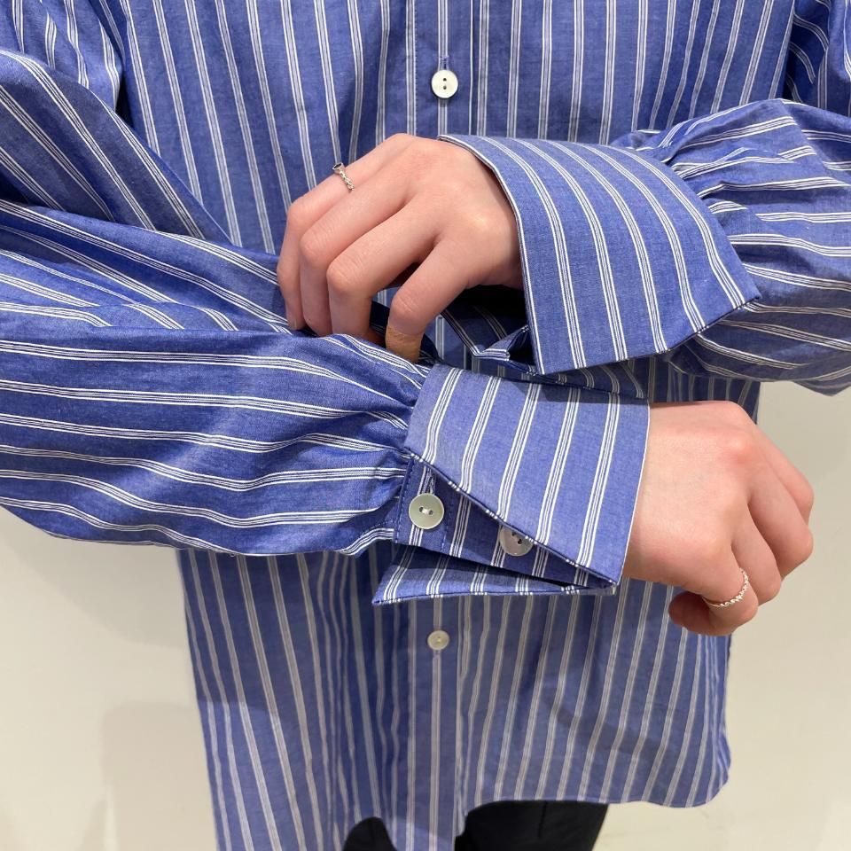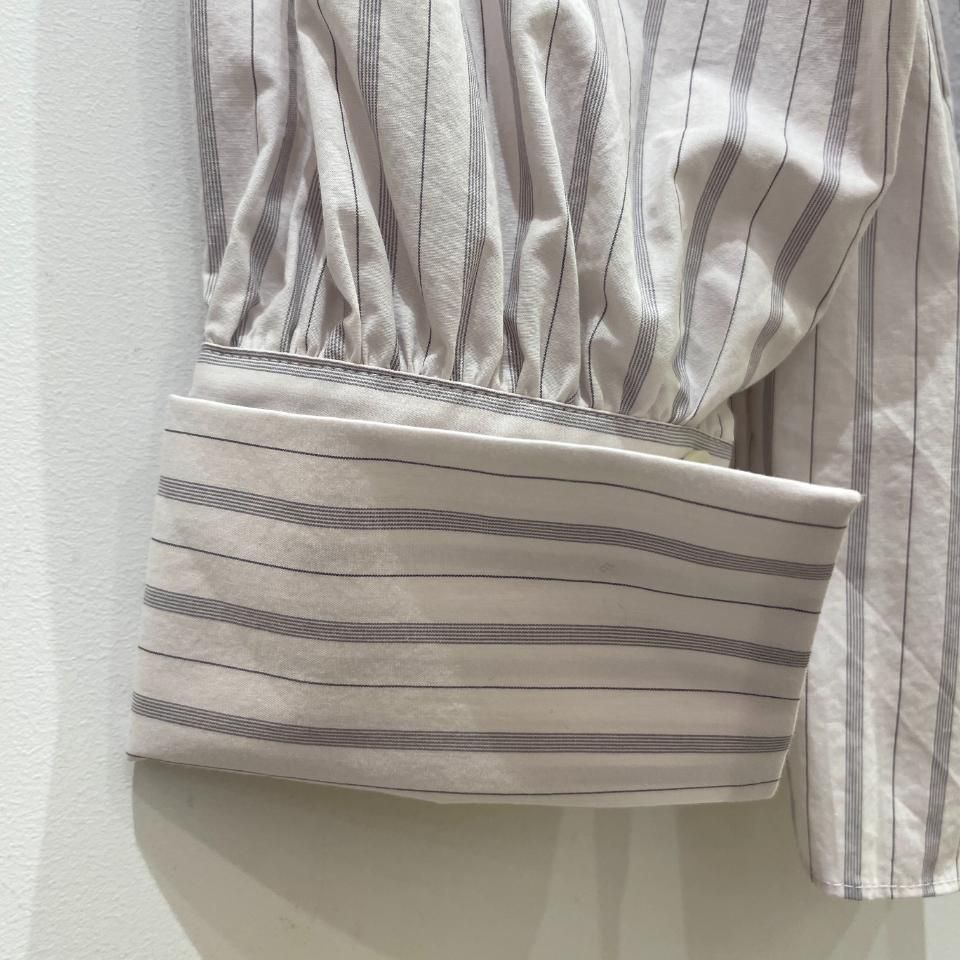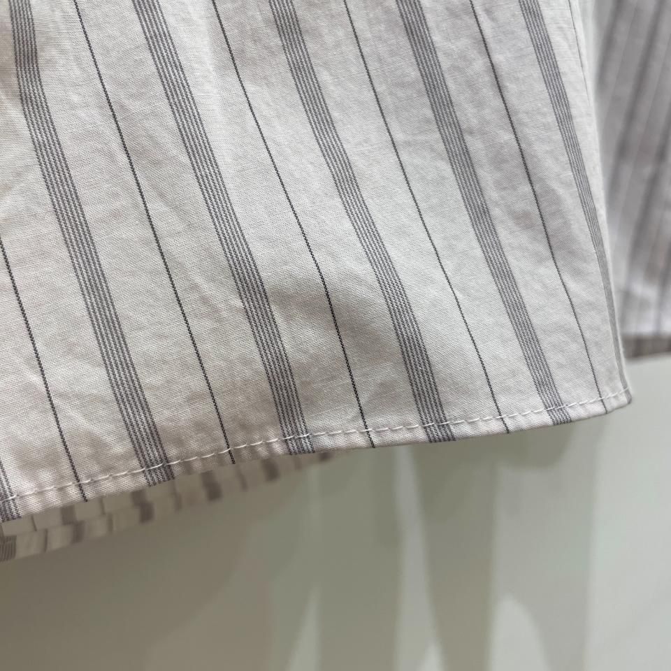 スタイリングを爽やかに演出するストライプ柄のフリルシャツ。