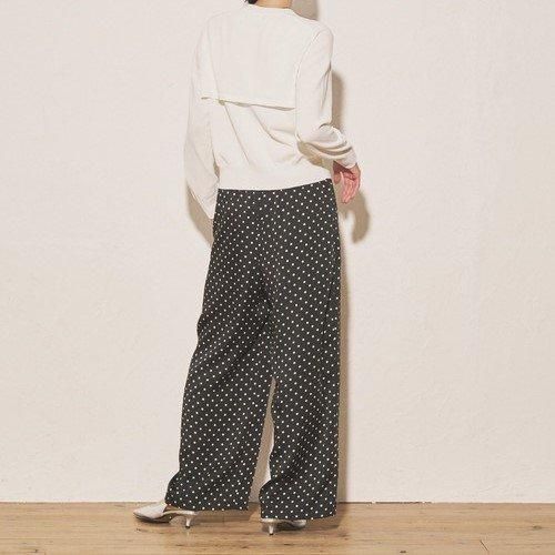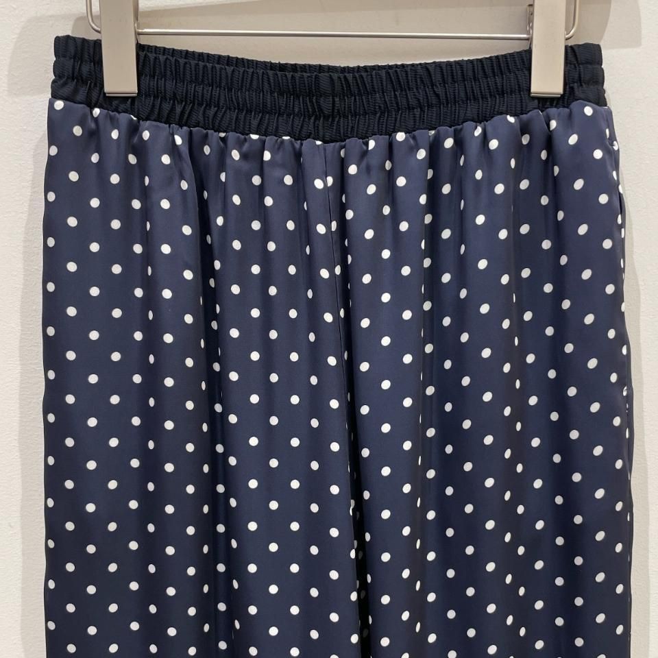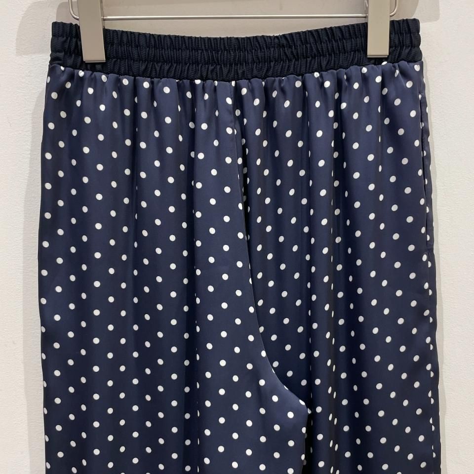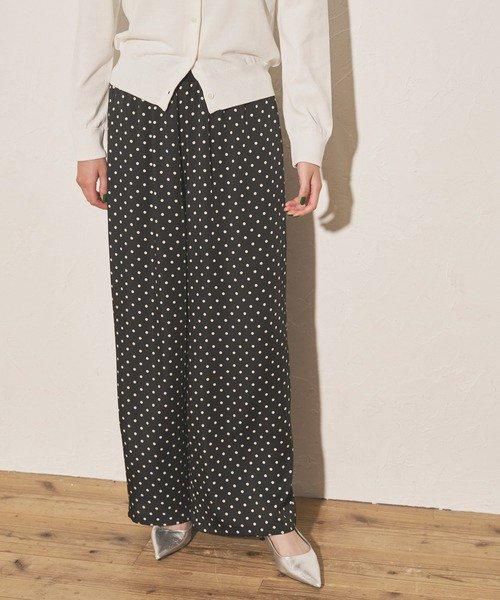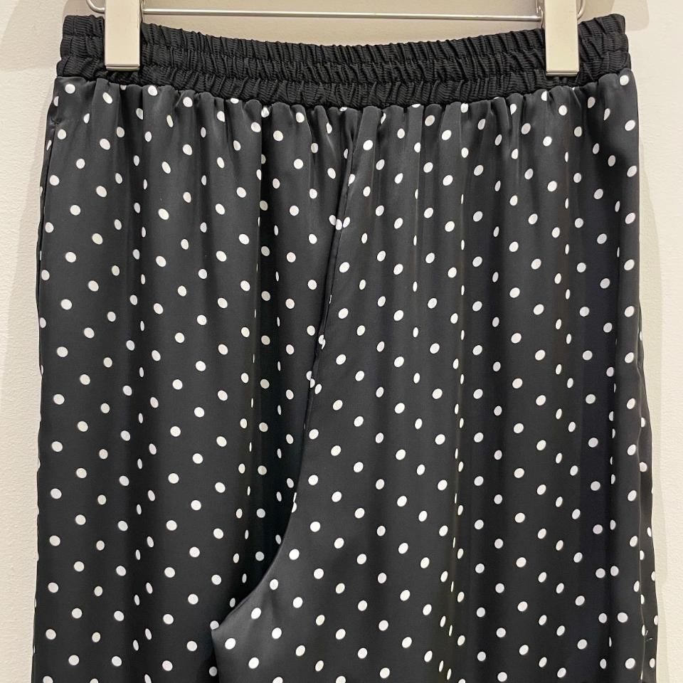 サテンの艶とドット柄の組み合わせがレディライクな印象に仕上がったイージーパンツ。