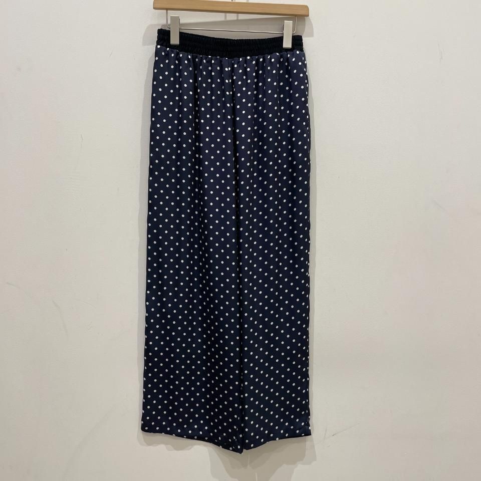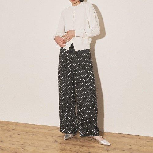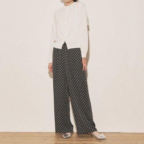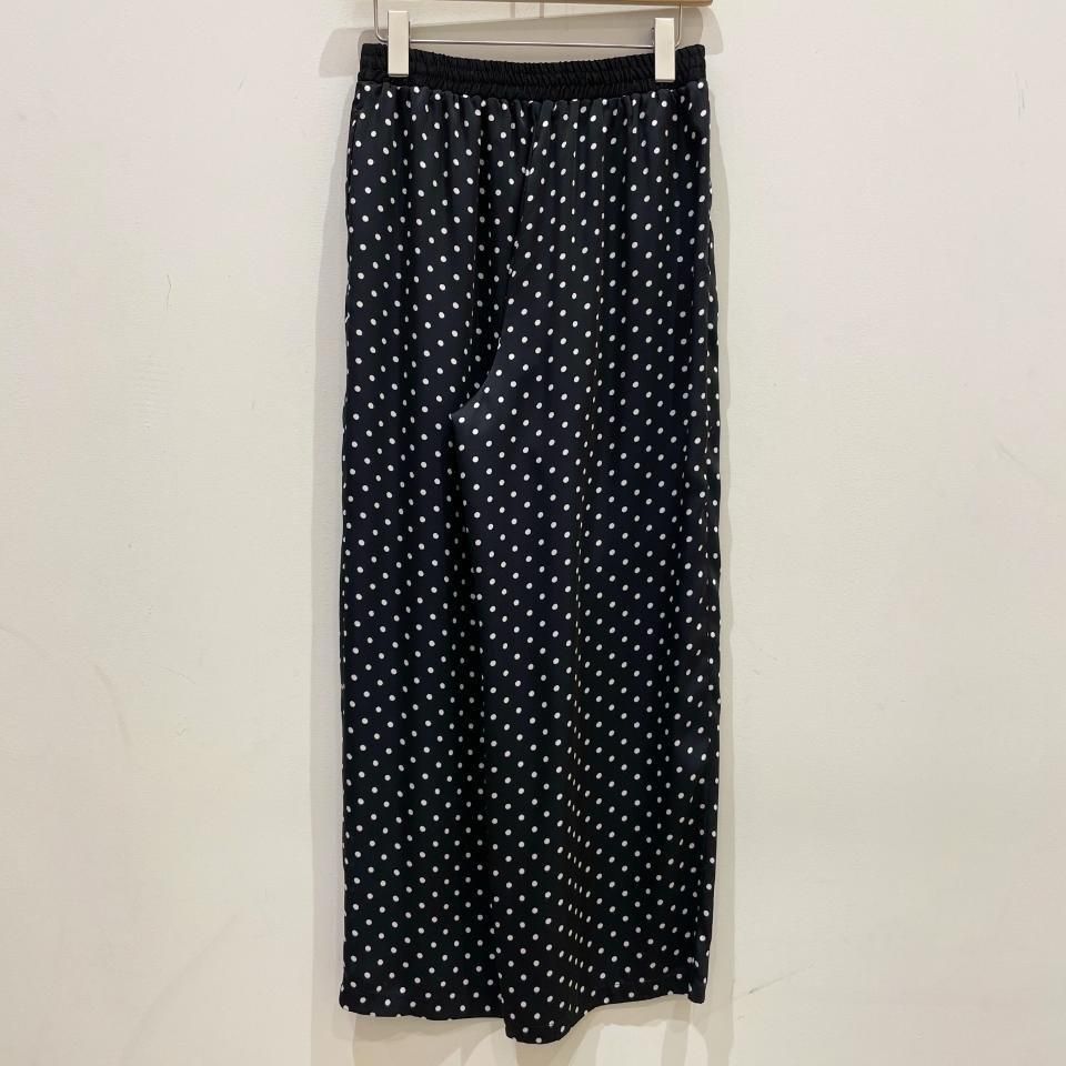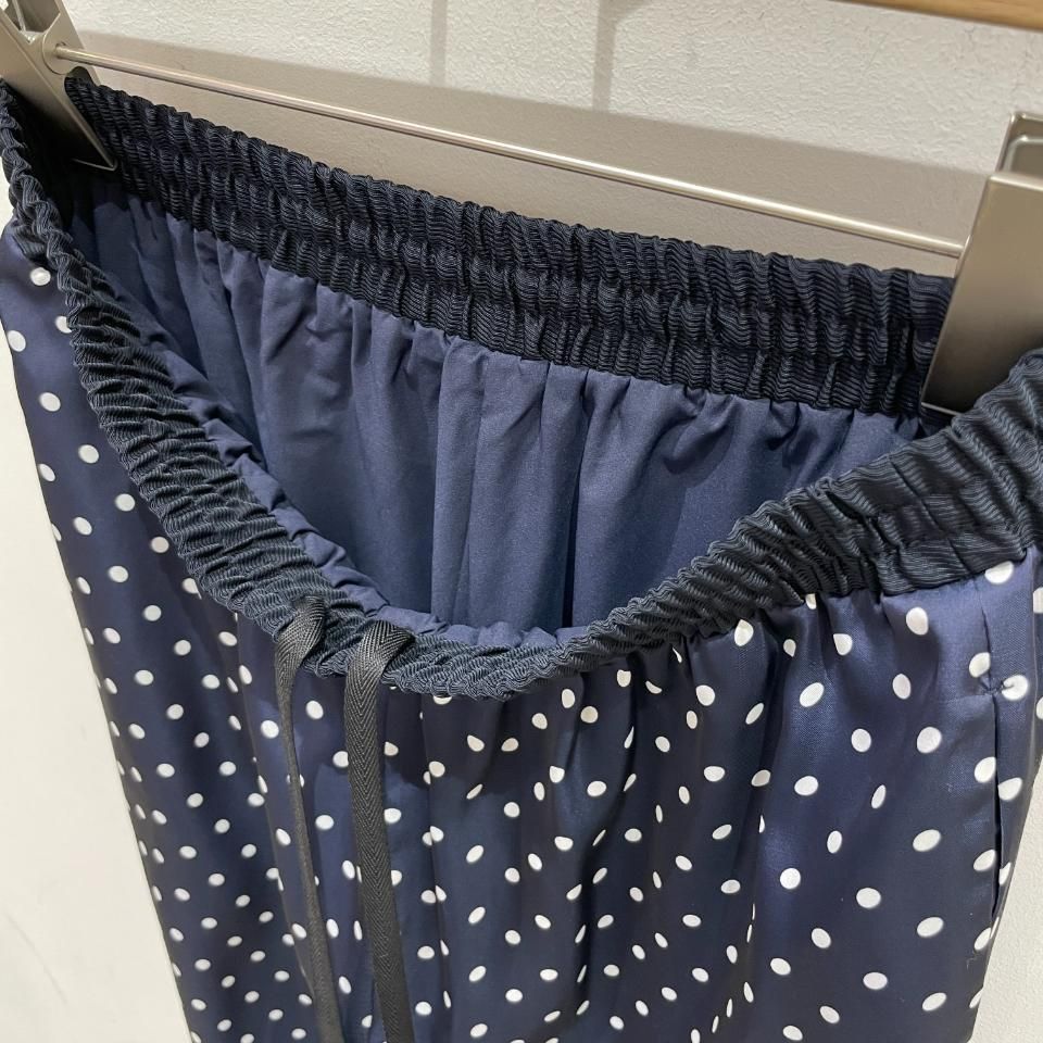 サテンの艶とドット柄の組み合わせがレディライクな印象に仕上がったイージーパンツ。