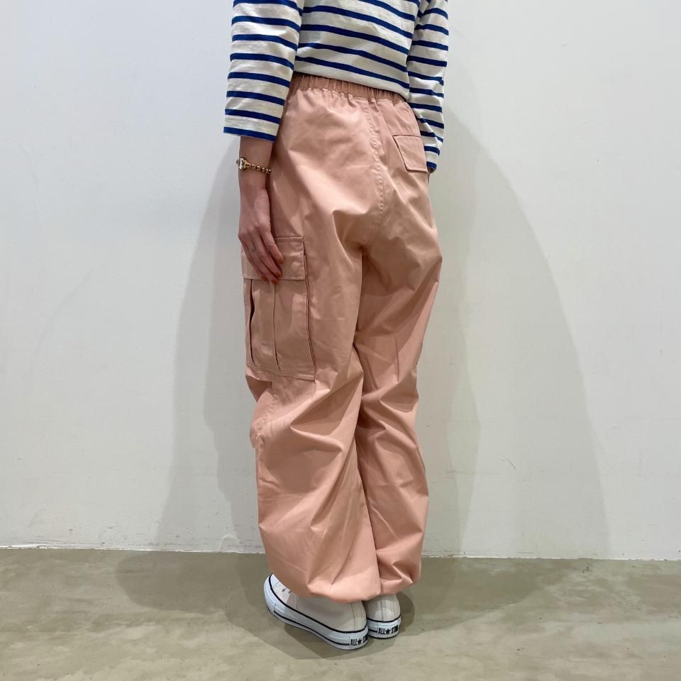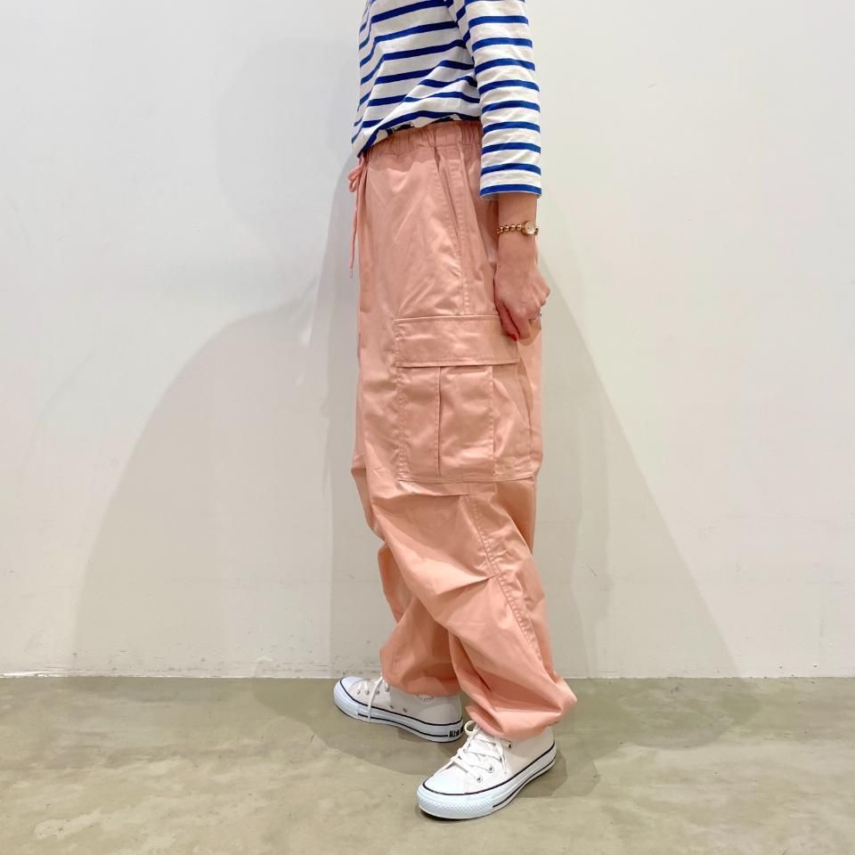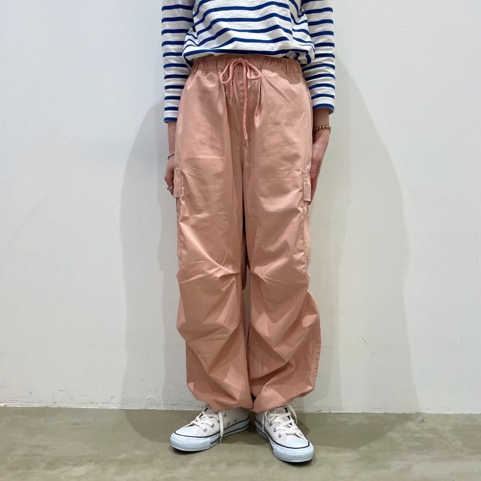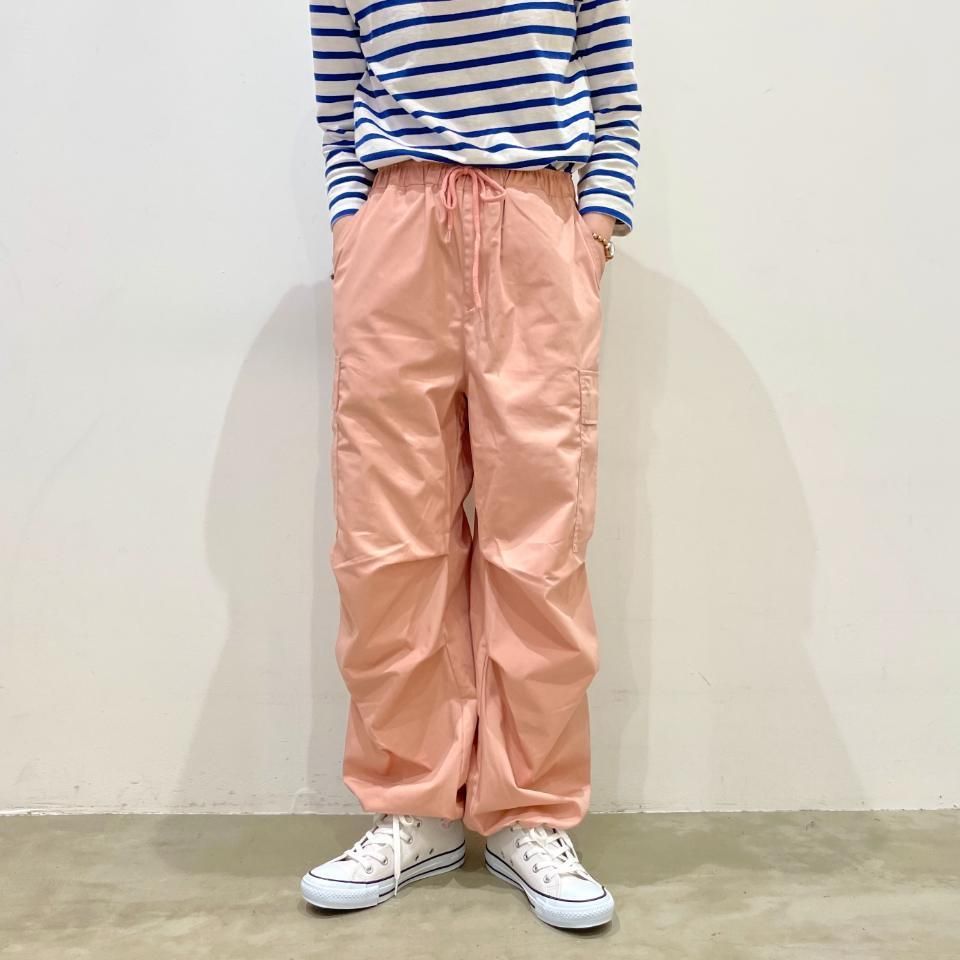 裾がドロストリングになったパラシュートパンツ。