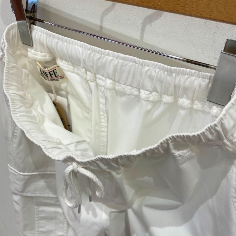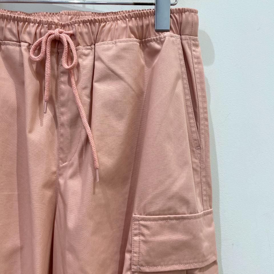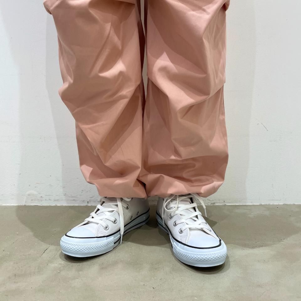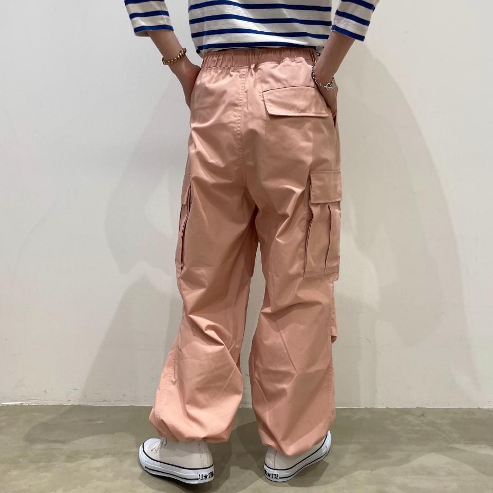 裾がドロストリングになったパラシュートパンツ。