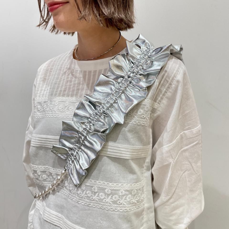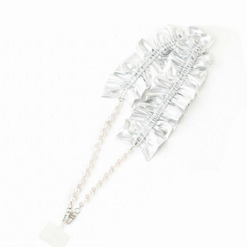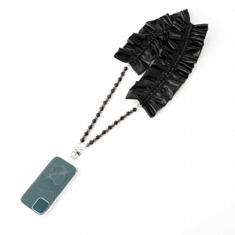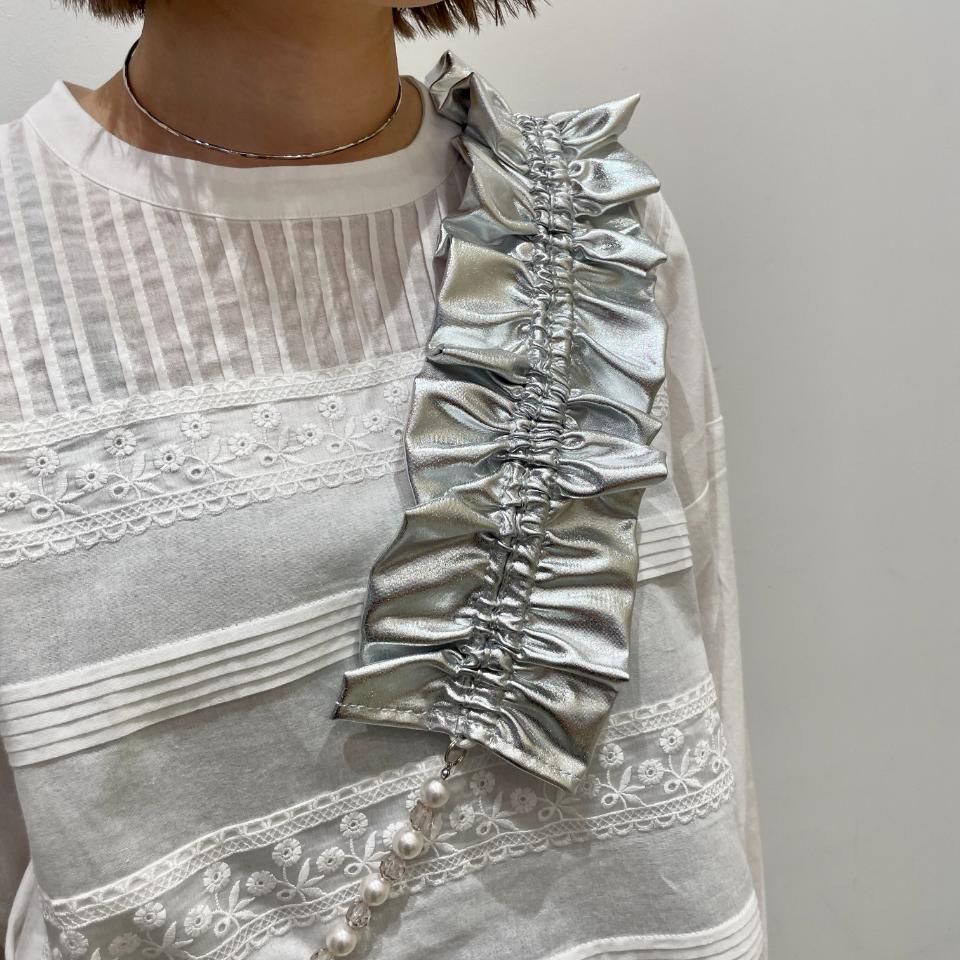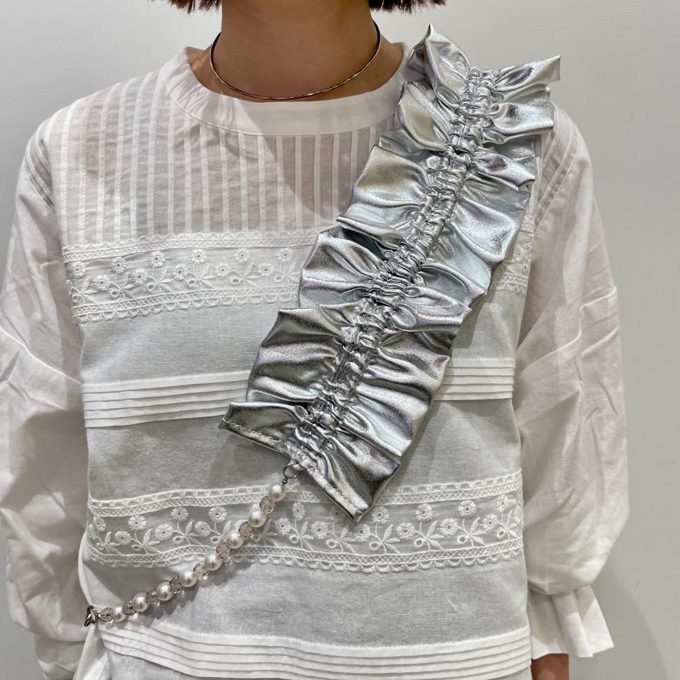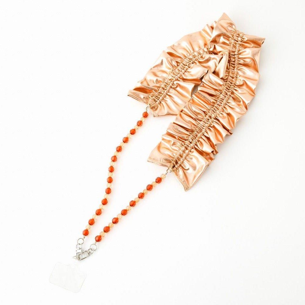 メタリックのボリューミーなギャザーと、ビーズの組み合わせが華やかなスマホショルダーです。