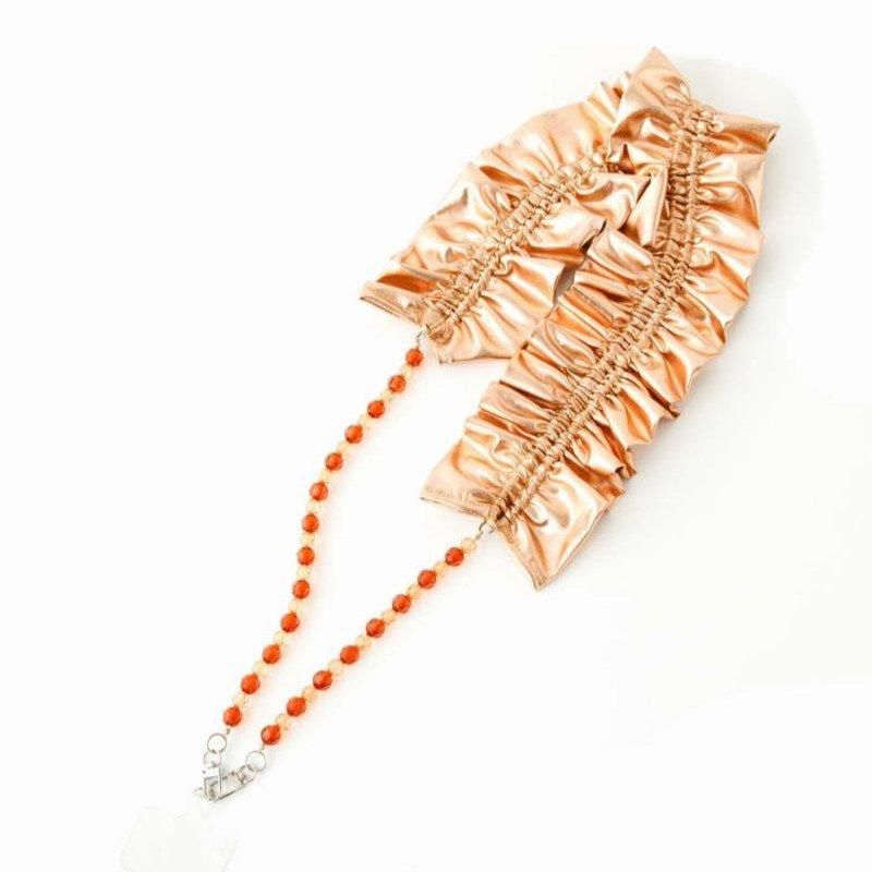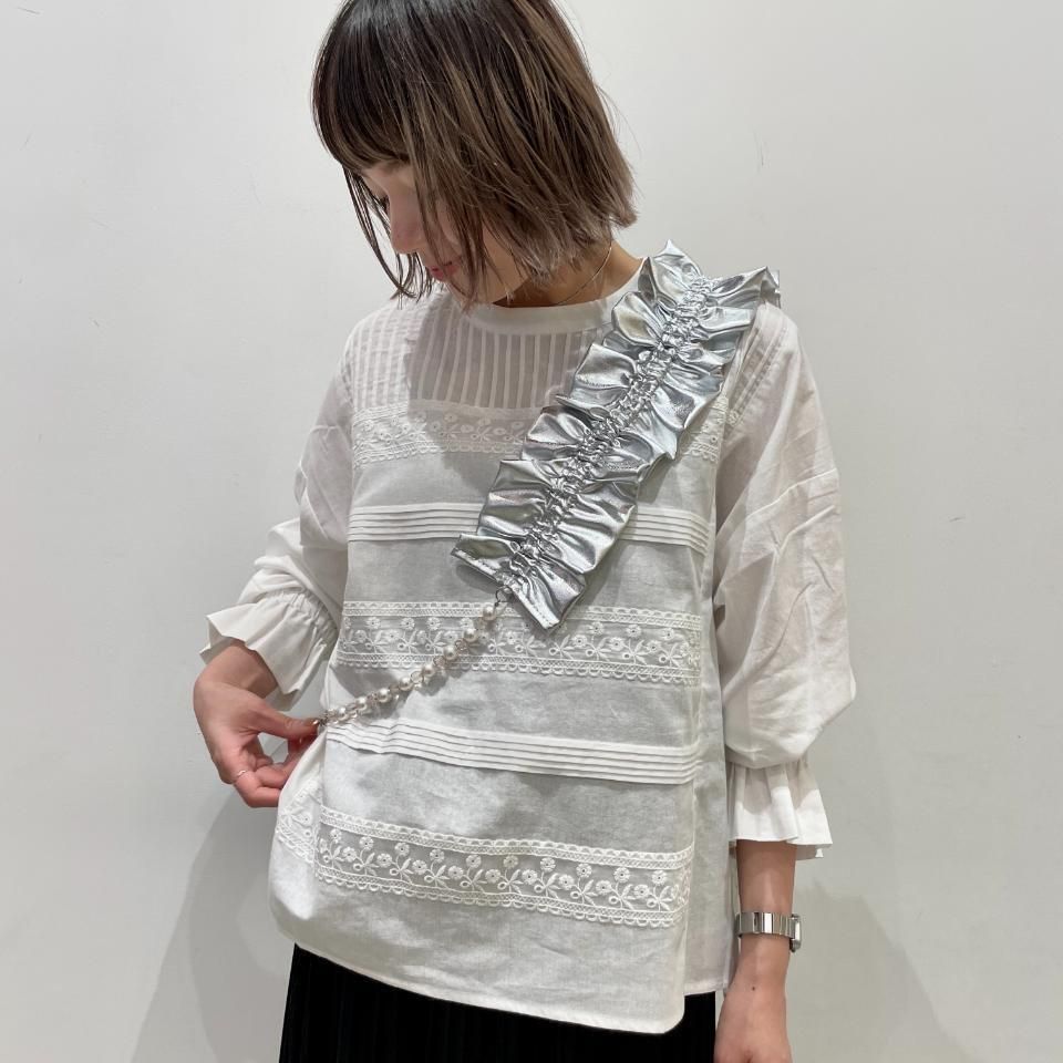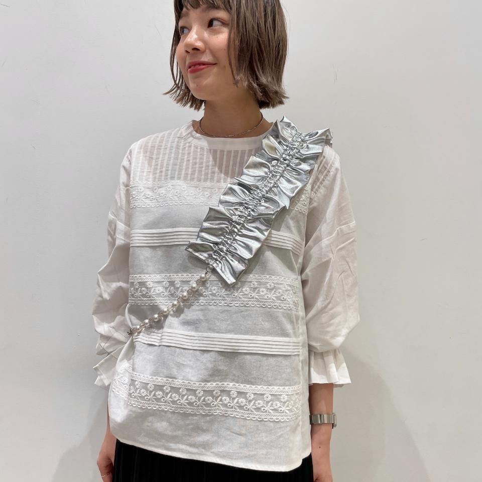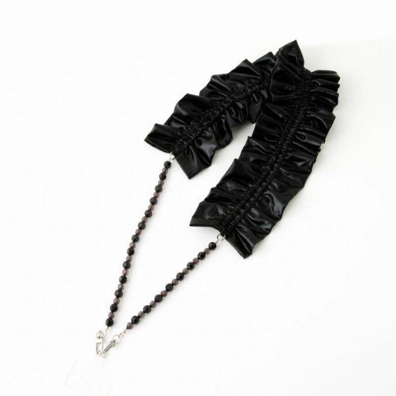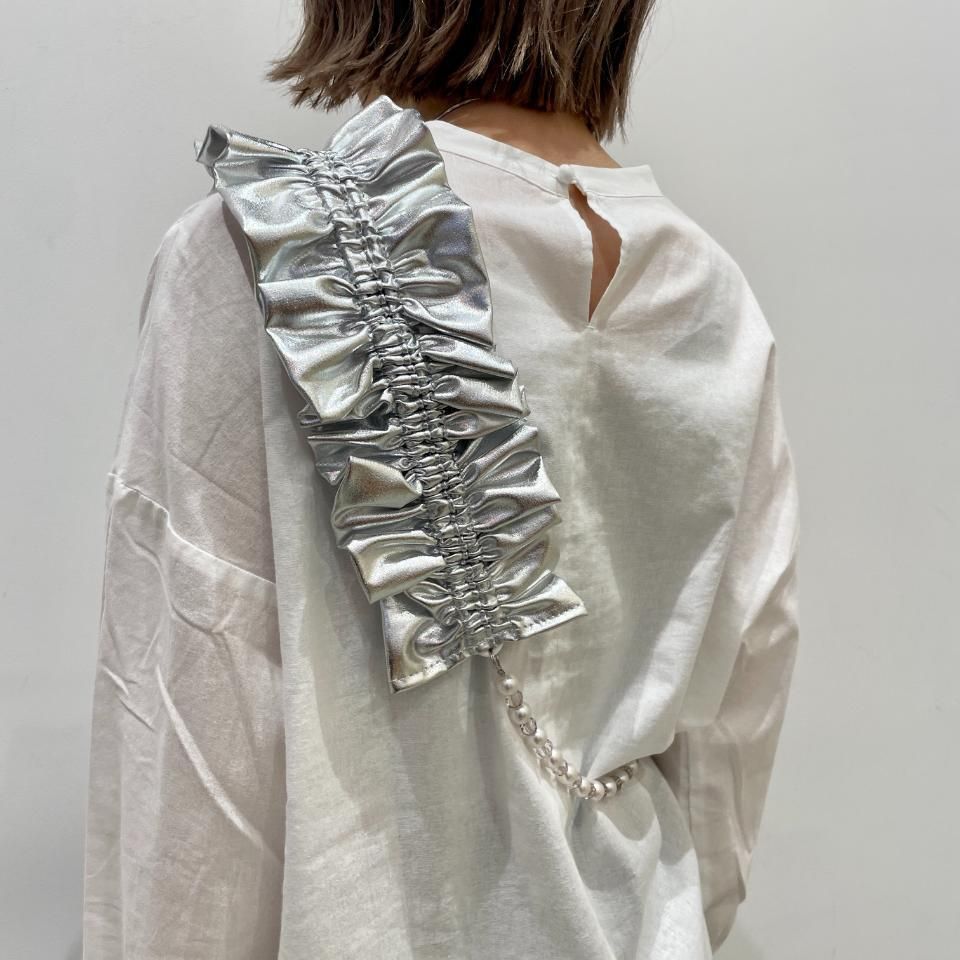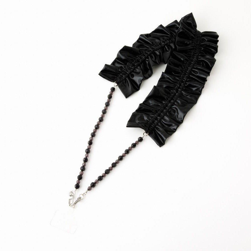 メタリックのボリューミーなギャザーと、ビーズの組み合わせが華やかなスマホショルダーです。