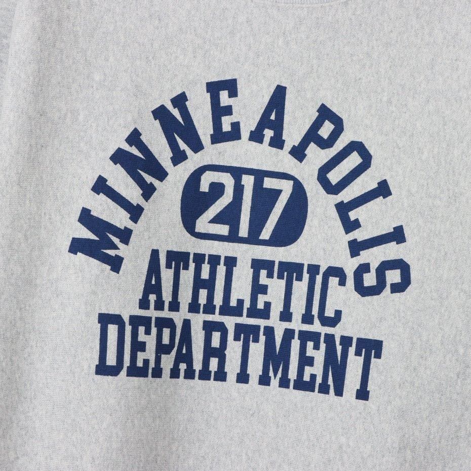 オーセンティックなシルエットで、チャンピオンブランドと親和性の高いカレッジ風グラフィックがポイント。ネームタグは1970年代モデルの「青単タグ」(青単色タグ)。