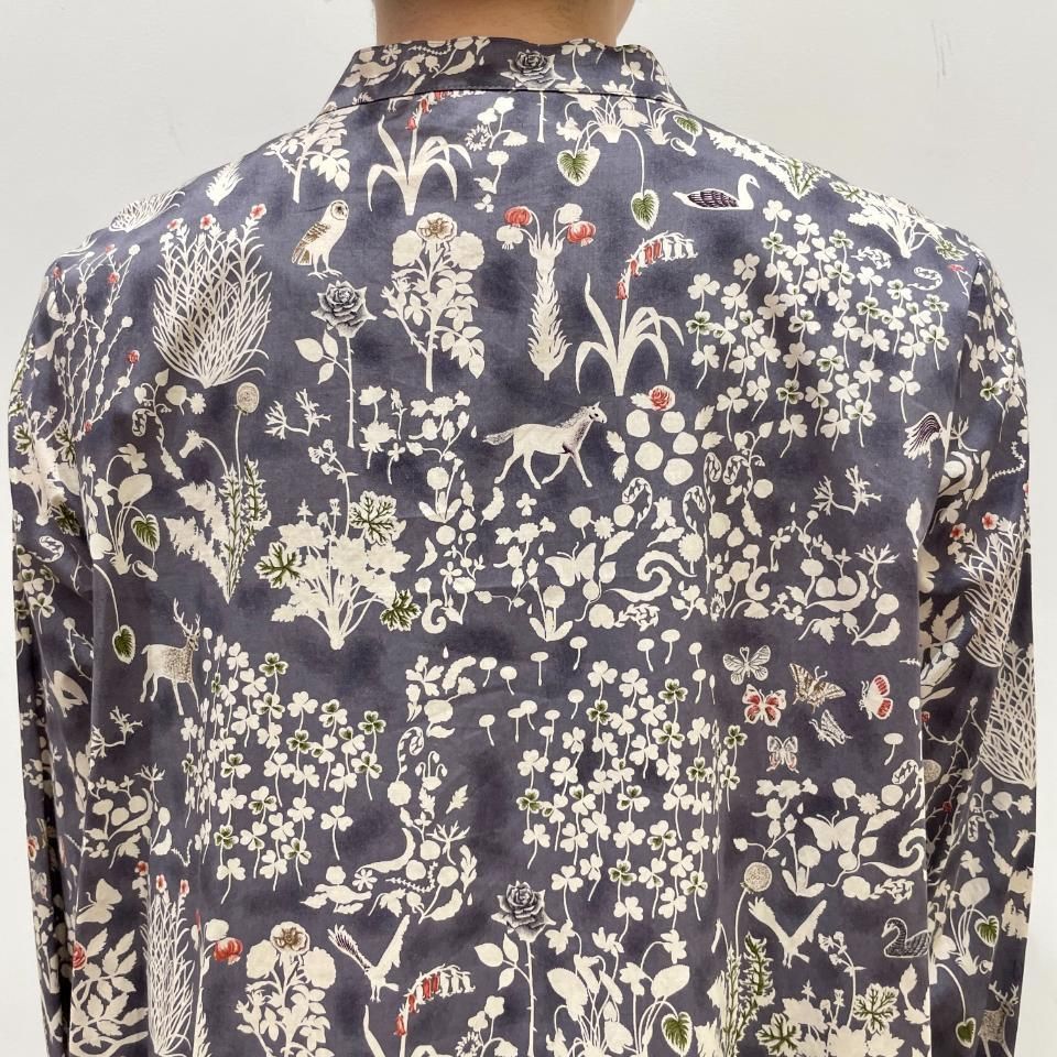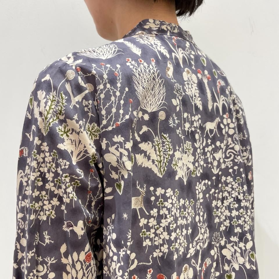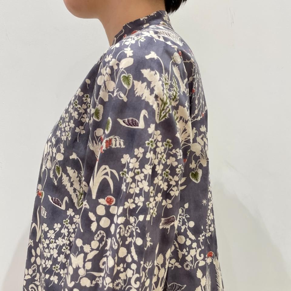 イラスト調の手書きの柄で、地色に薄い染めを施した凸凹感のあるベースに、繊細なカンバセーショナル柄を驚くような線づかいで描いています。グラフィックデザイナーであり、自身でイラストも手掛ける渡邉良重さんによるデザインです。