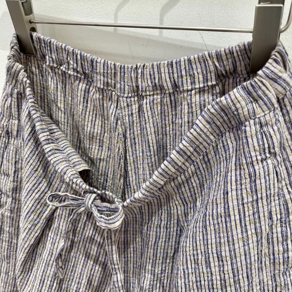 薄手で通気性、速乾性に優れた清涼感のあるリネンクロスを洗い加工によりクタっとした風合いに仕上げ、全体にゆるやかなシワが入り、生地が肌に密着せず非常に軽くサラっと快適な履き心地です。