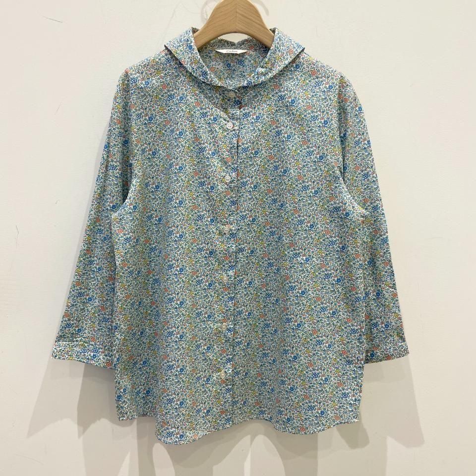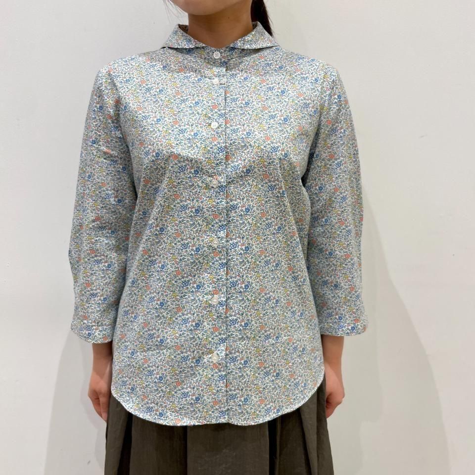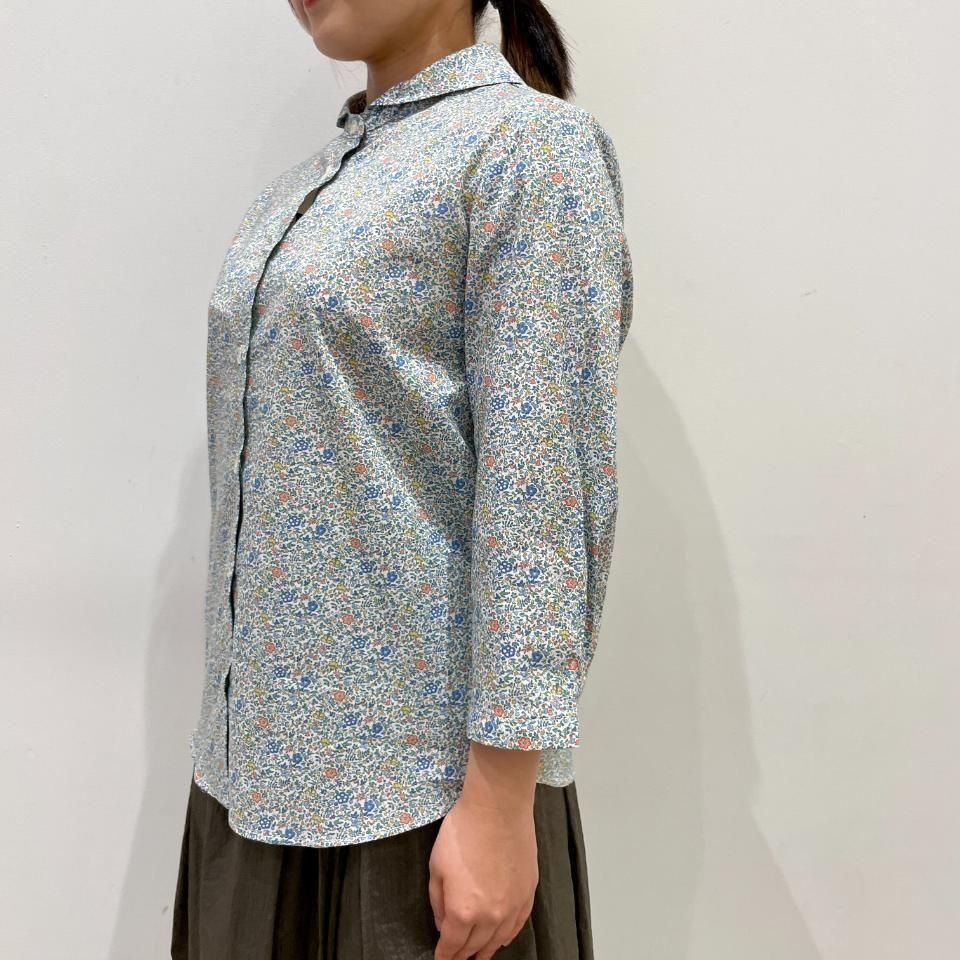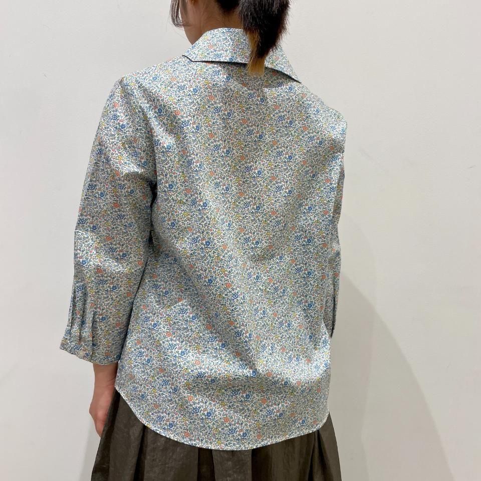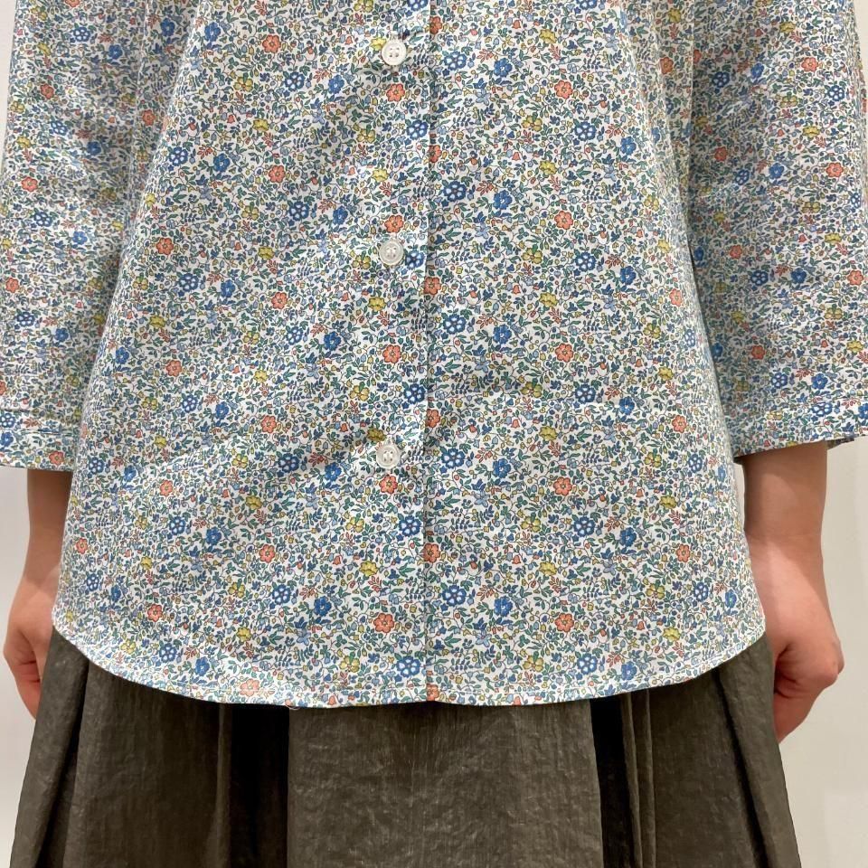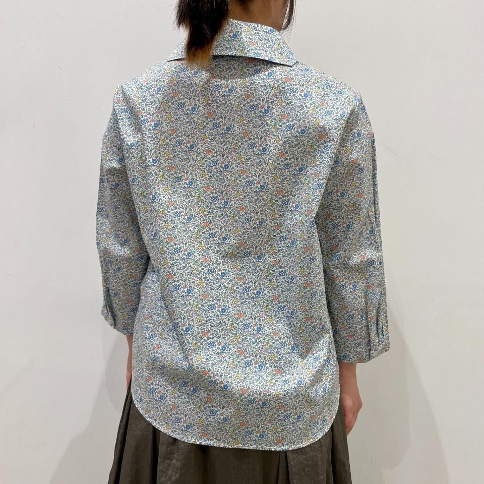 リバティプリントのセーラーカラー7分袖レギュラーシャツ。