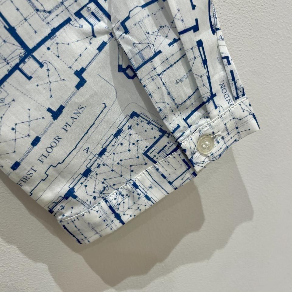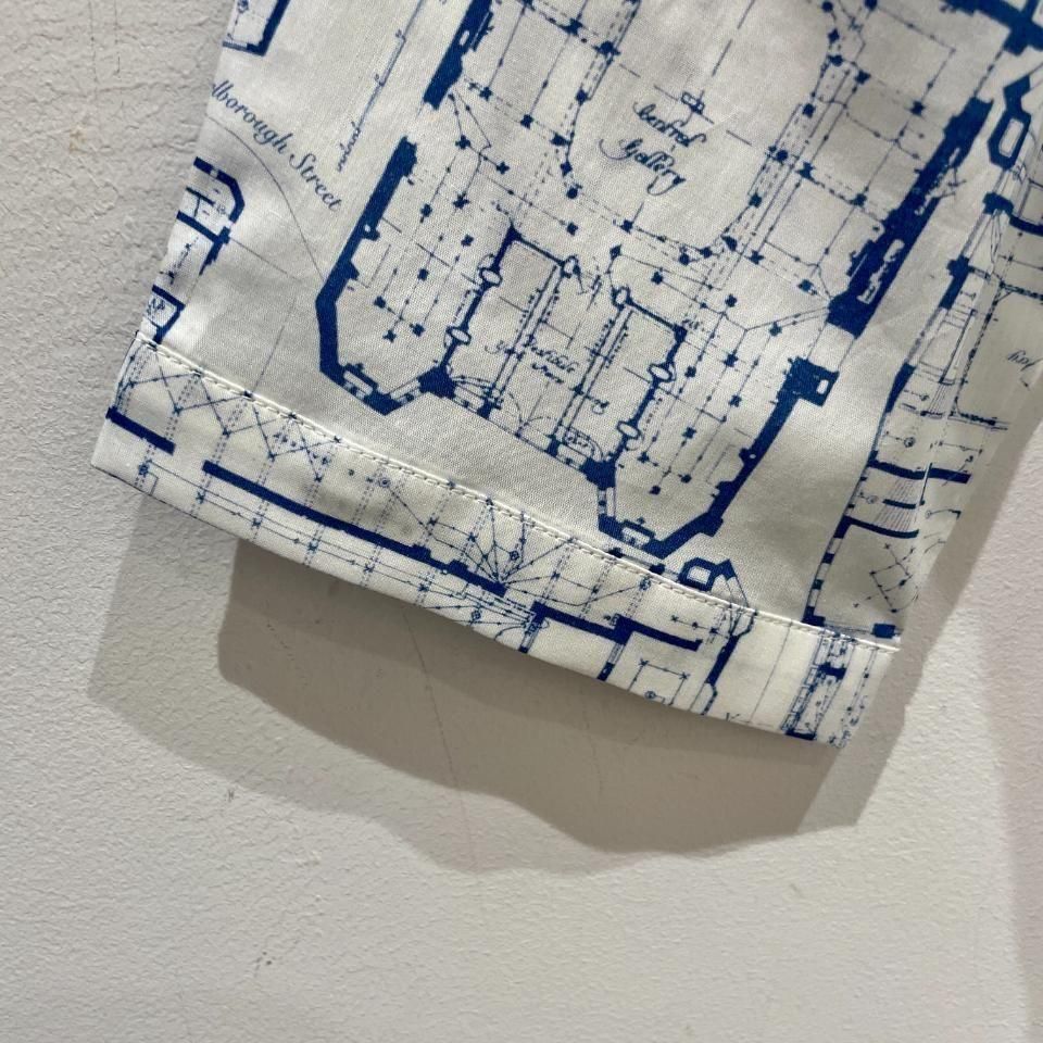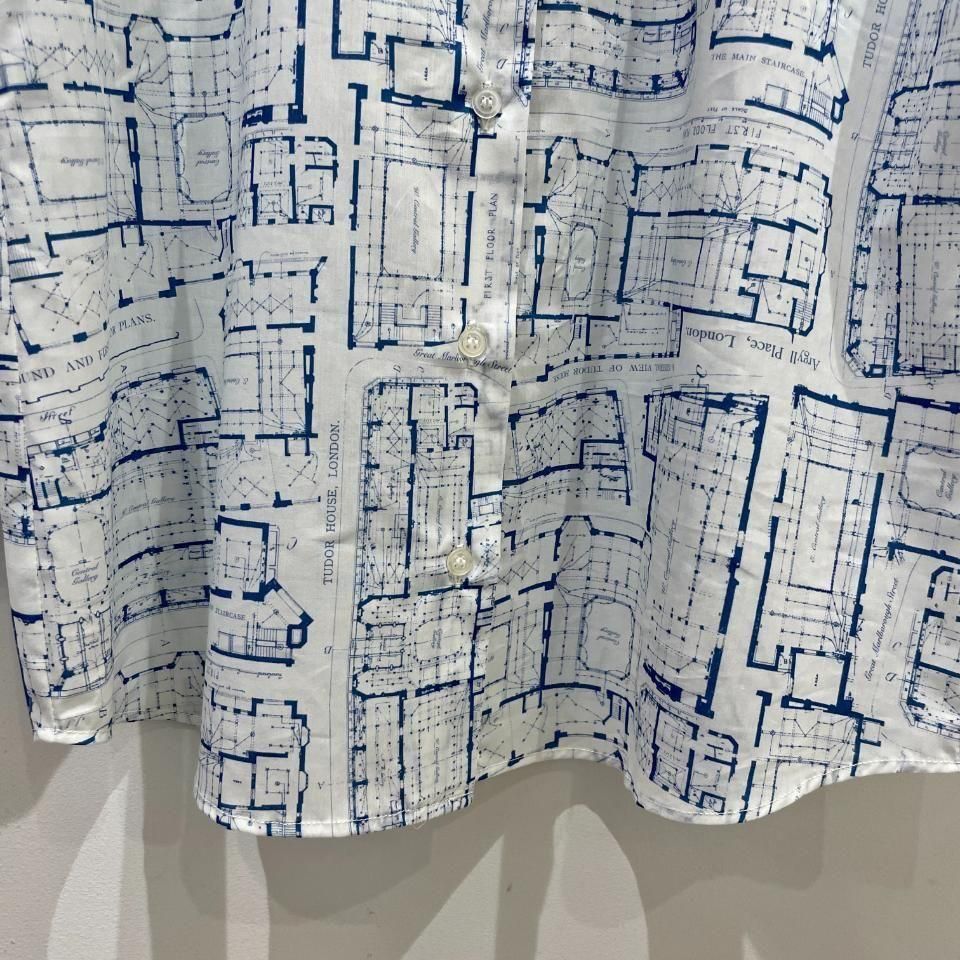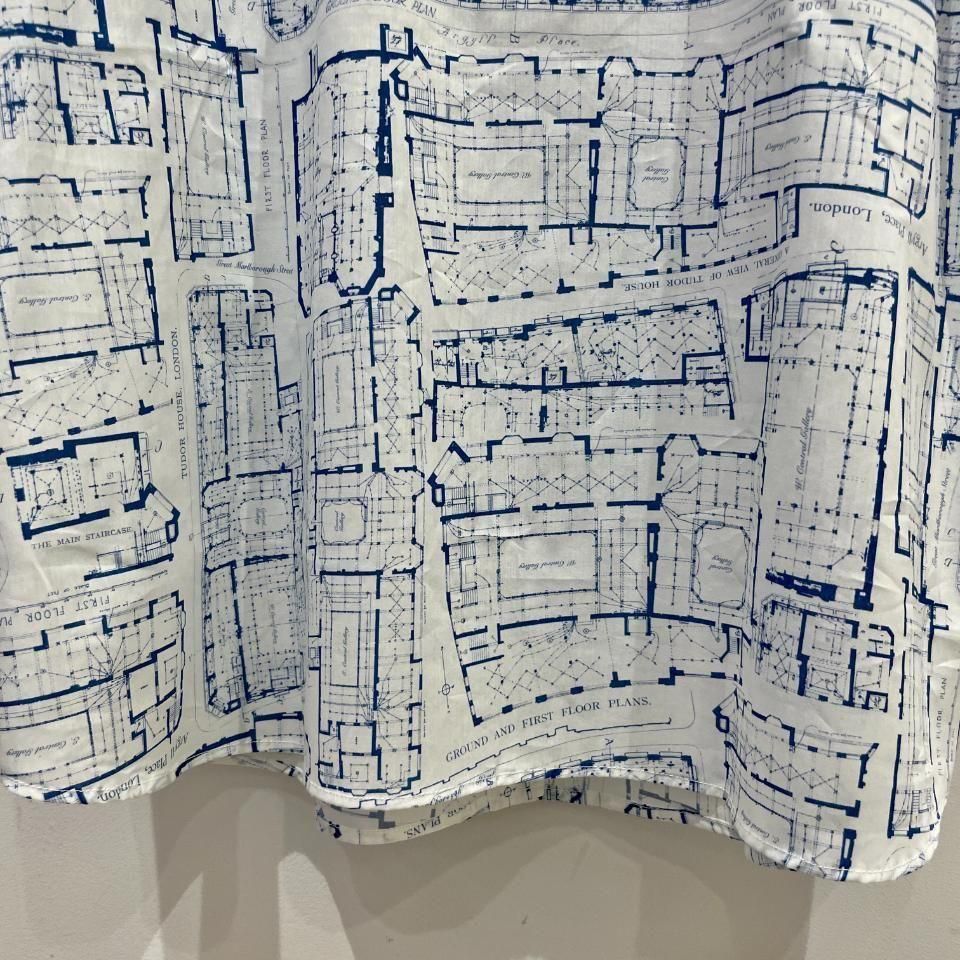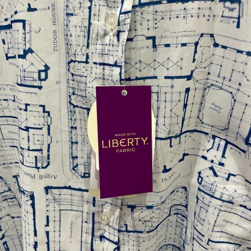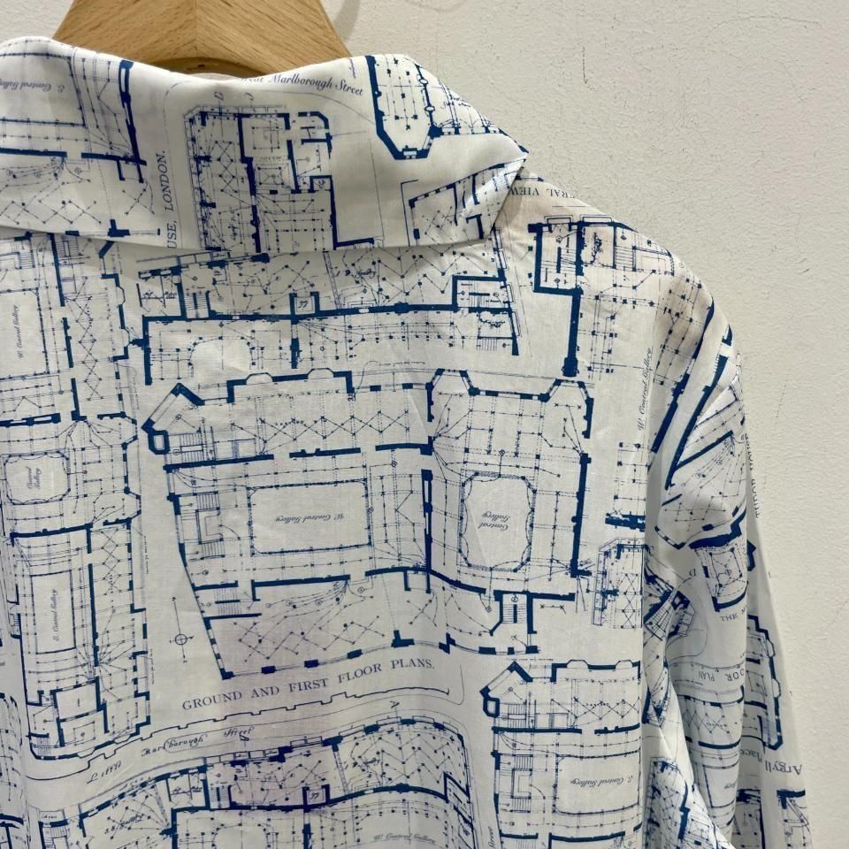 リバティ・ストアのオリジナルの建築設計図から作られた幾何学的なカンバセーショナル・デザインです。フロアプランや近くの通りの詳細な図、技術的な注釈などが添えられています。