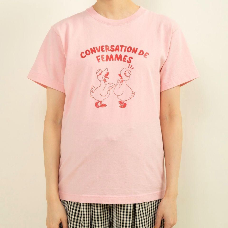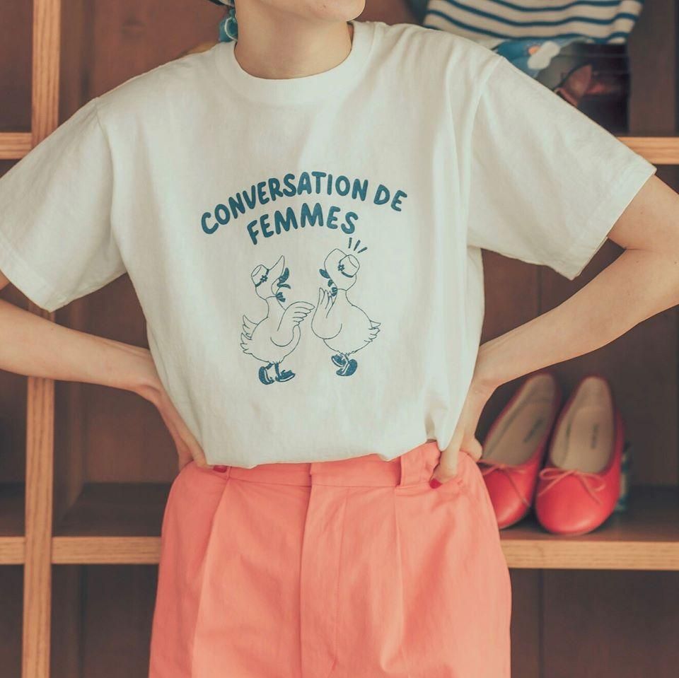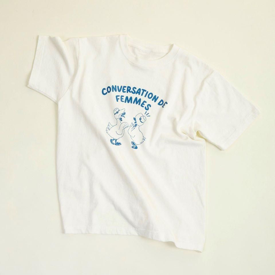 アヒルの婦人たちが井戸端会議をしている様子をプリントした遊び心あるキャッチーなプリントTシャツ。