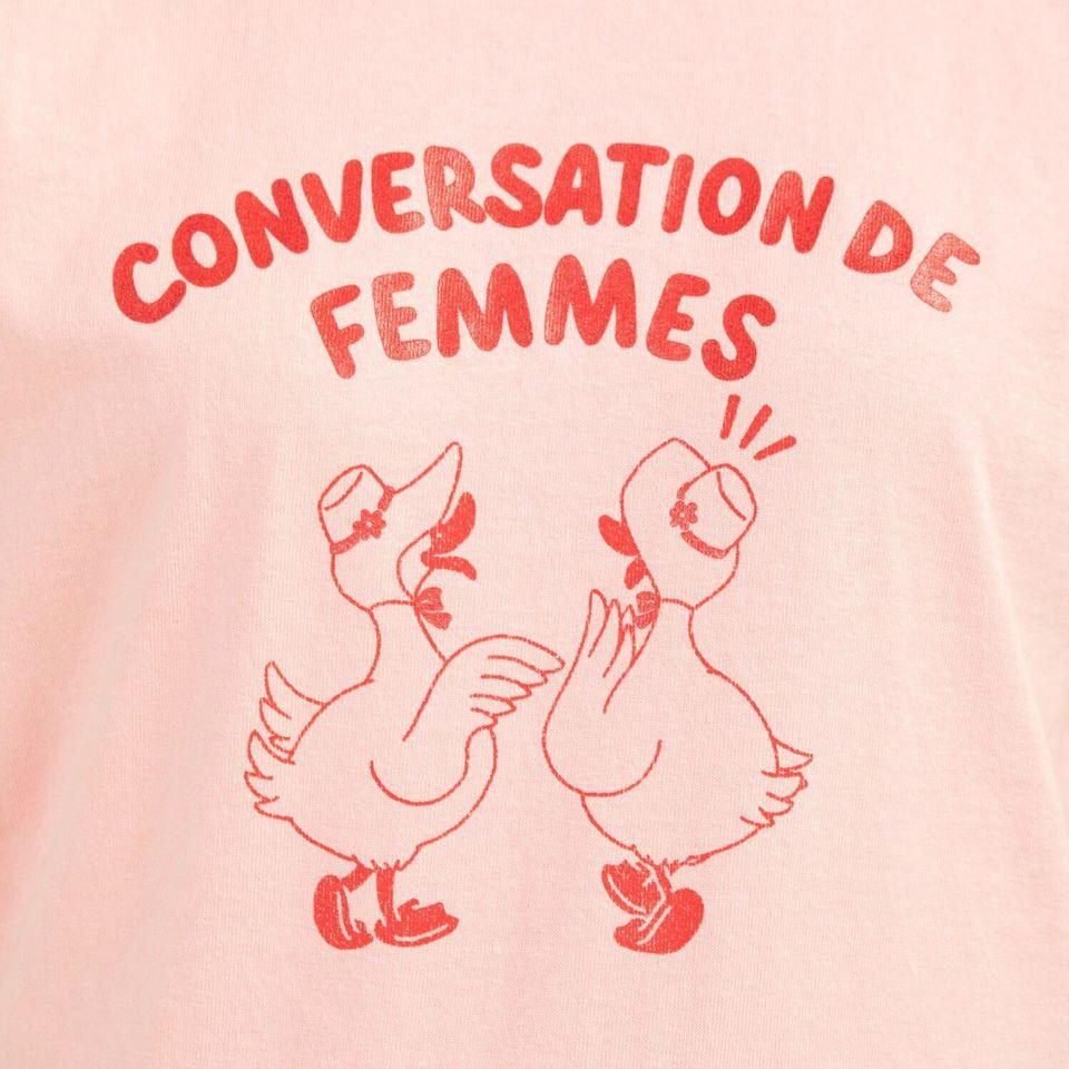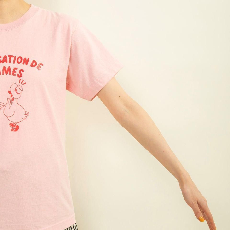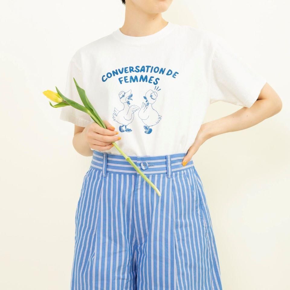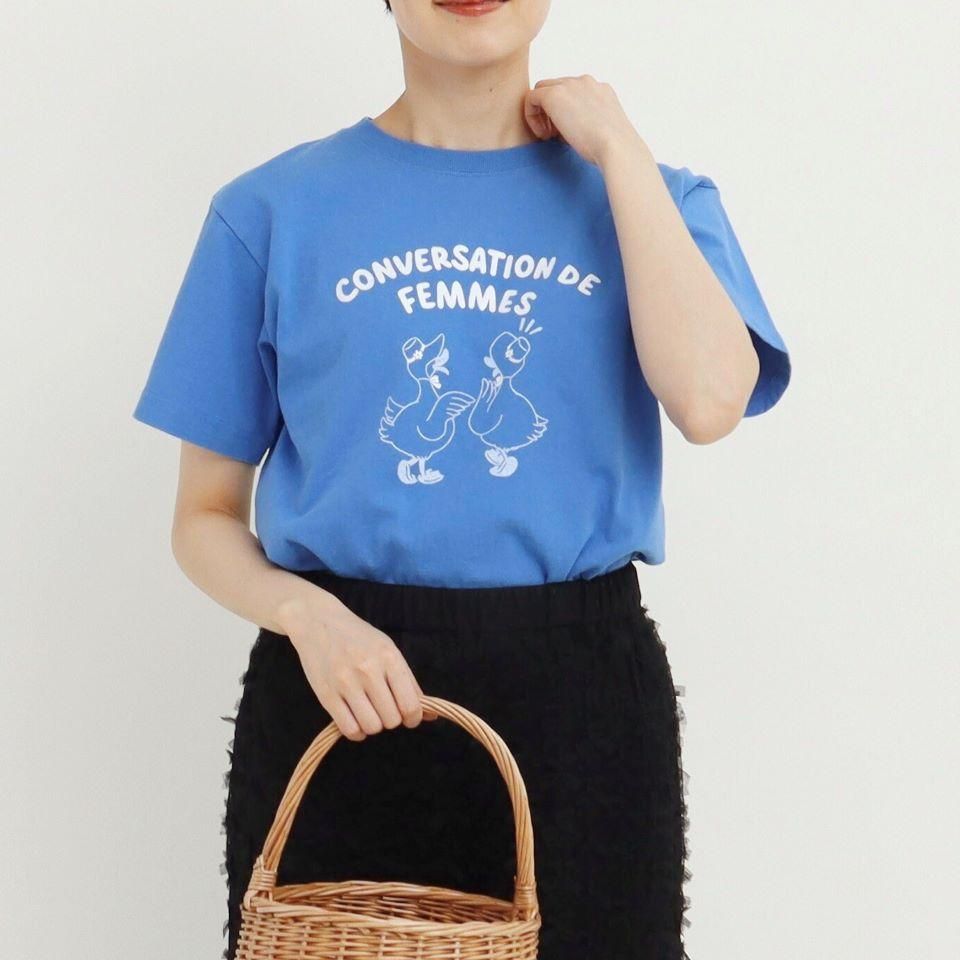 アヒルの婦人たちが井戸端会議をしている様子をプリントした遊び心あるキャッチーなプリントTシャツ。