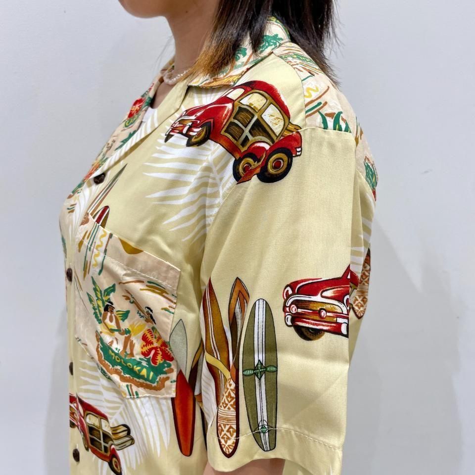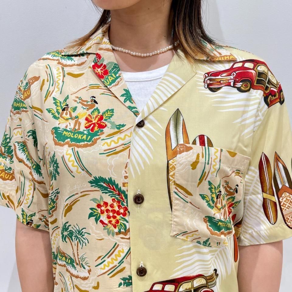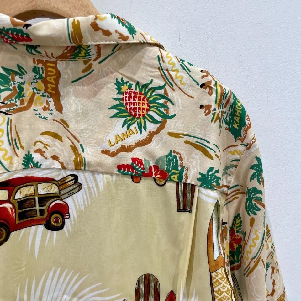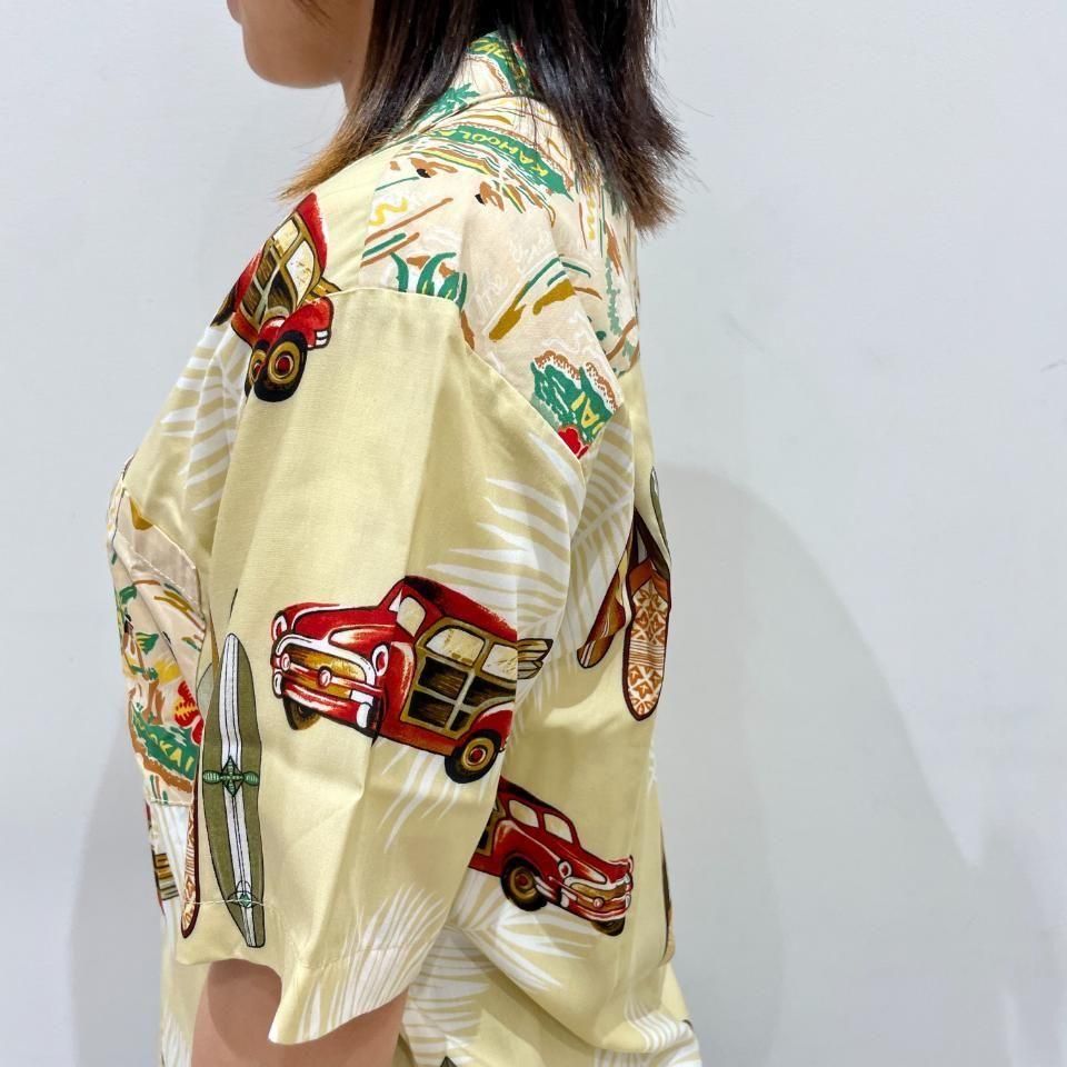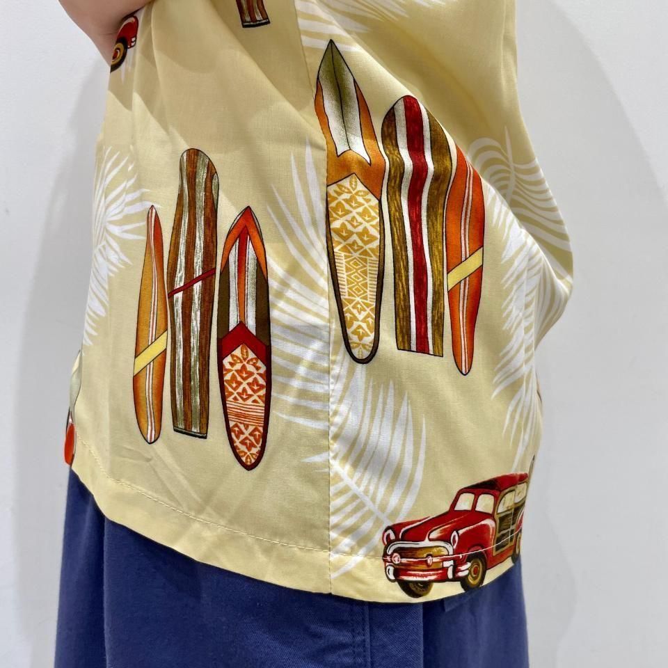ヤシの木やパイナップルなどが描かれた南国らしい柄と、どこか懐かしいレトロな自動車とサーフボード柄を組み合わせたクレイジーパターンのアロハシャツです。