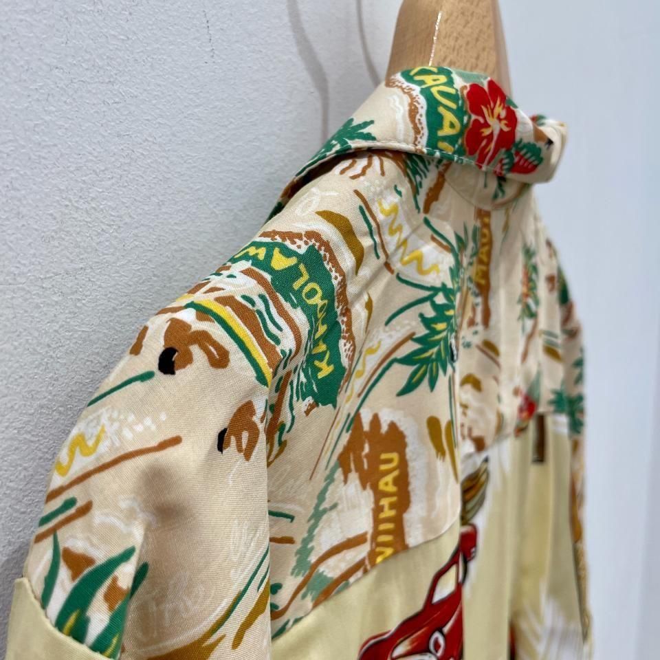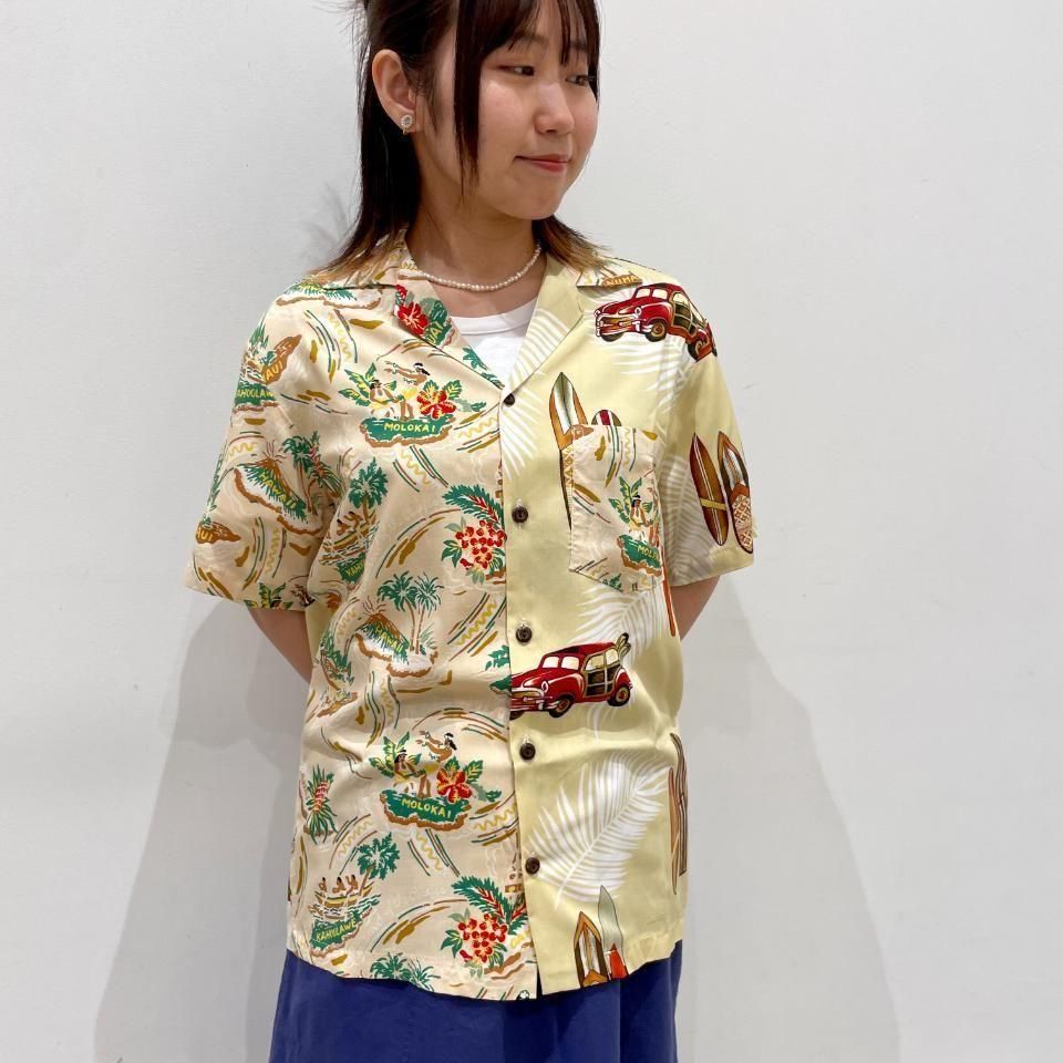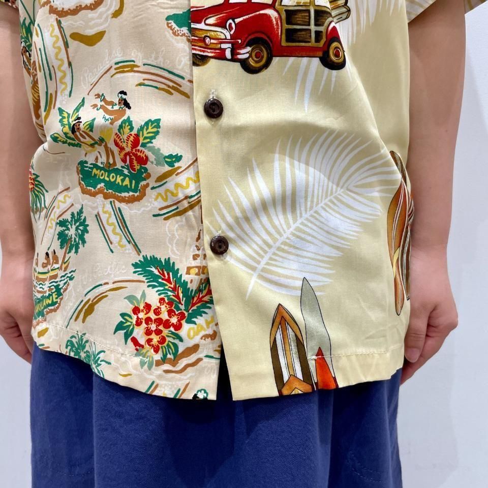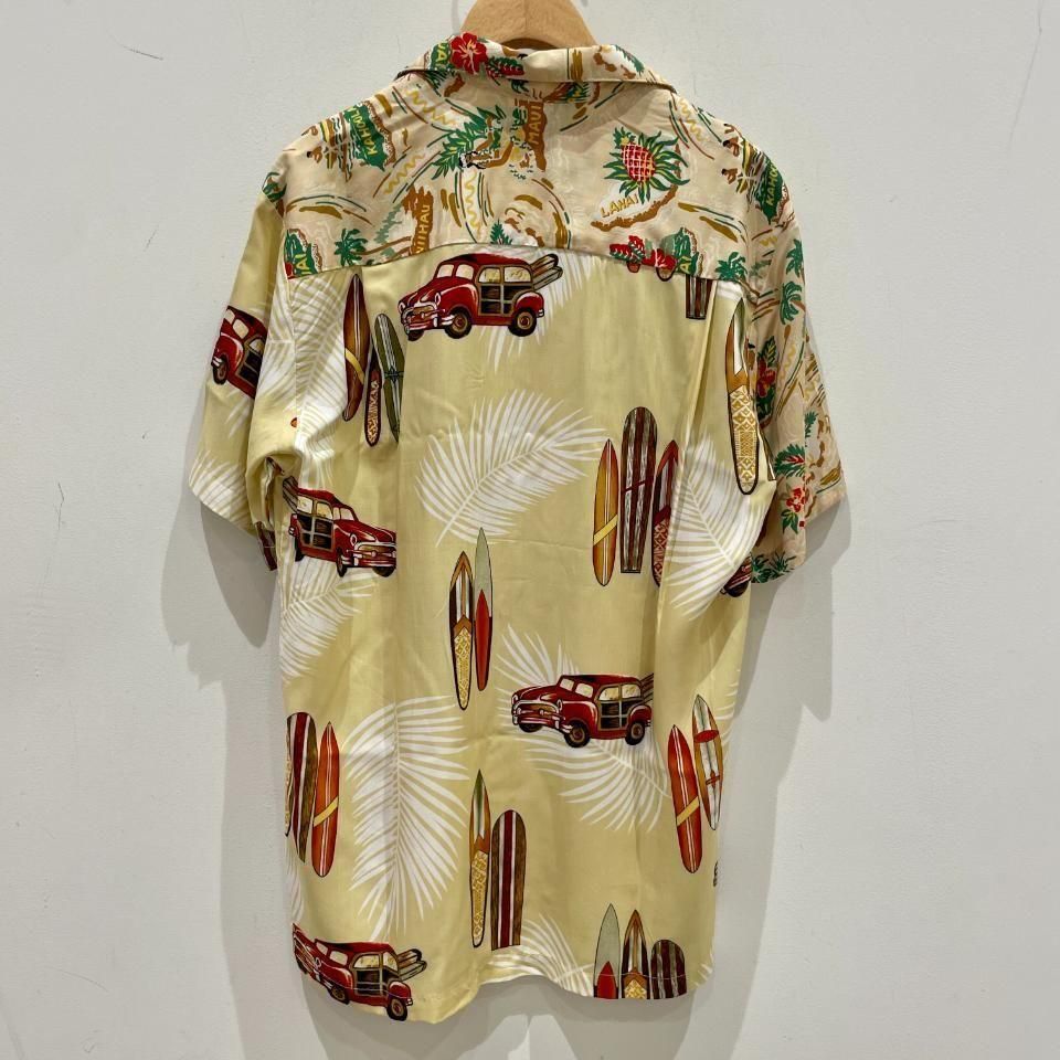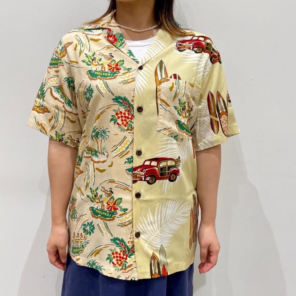 ヤシの木やパイナップルなどが描かれた南国らしい柄と、どこか懐かしいレトロな自動車とサーフボード柄を組み合わせたクレイジーパターンのアロハシャツです。