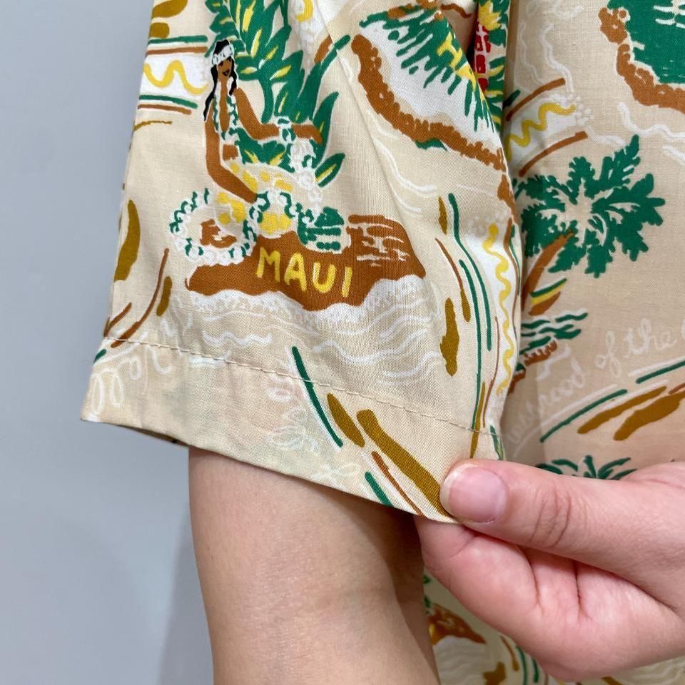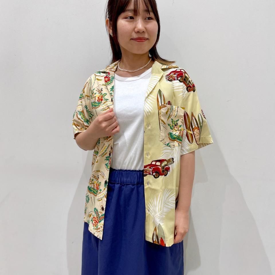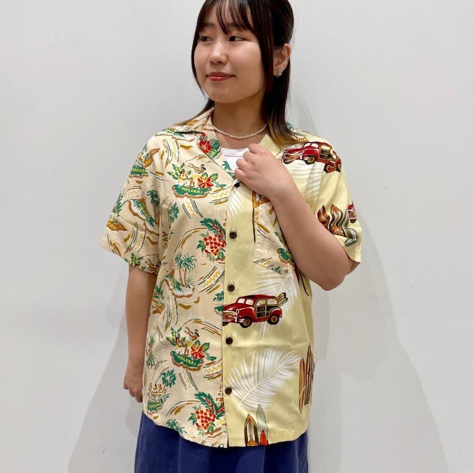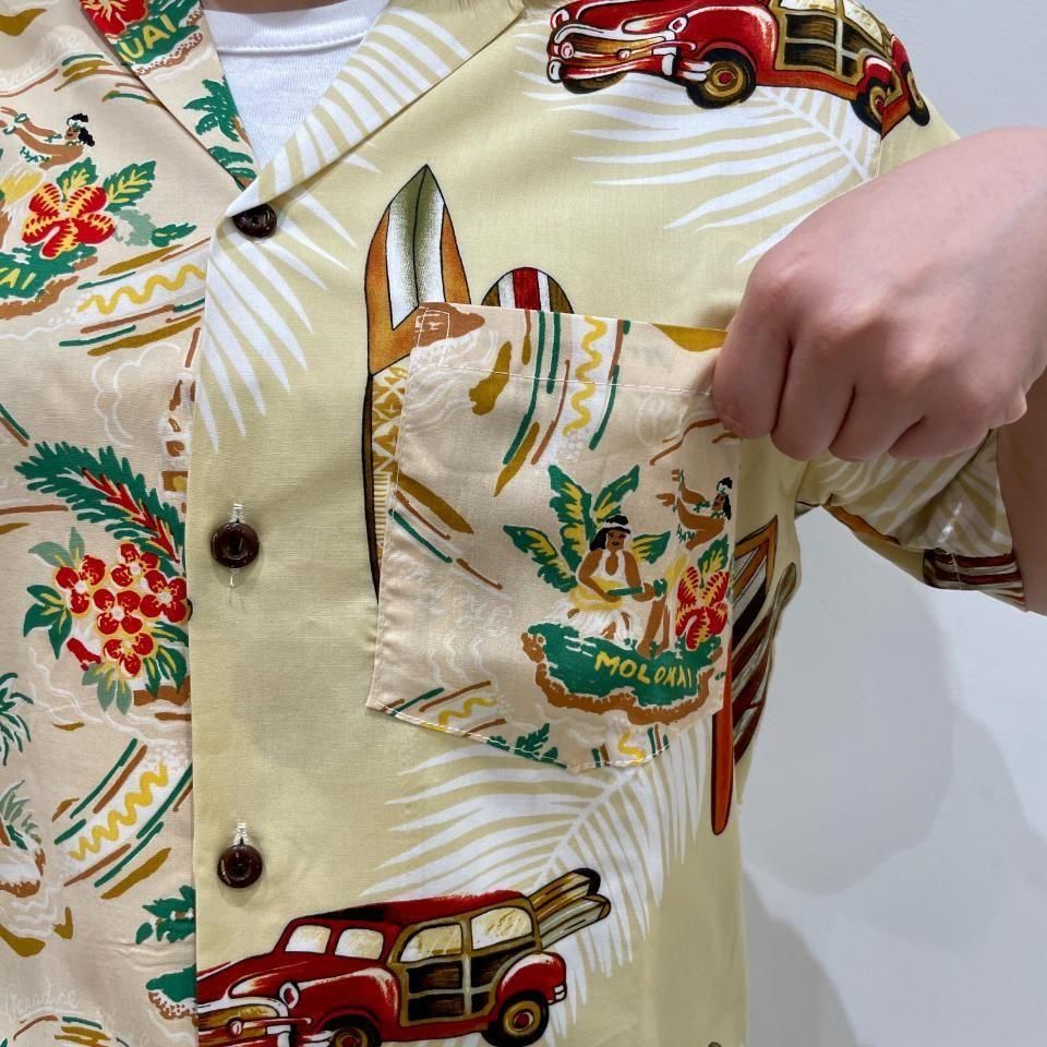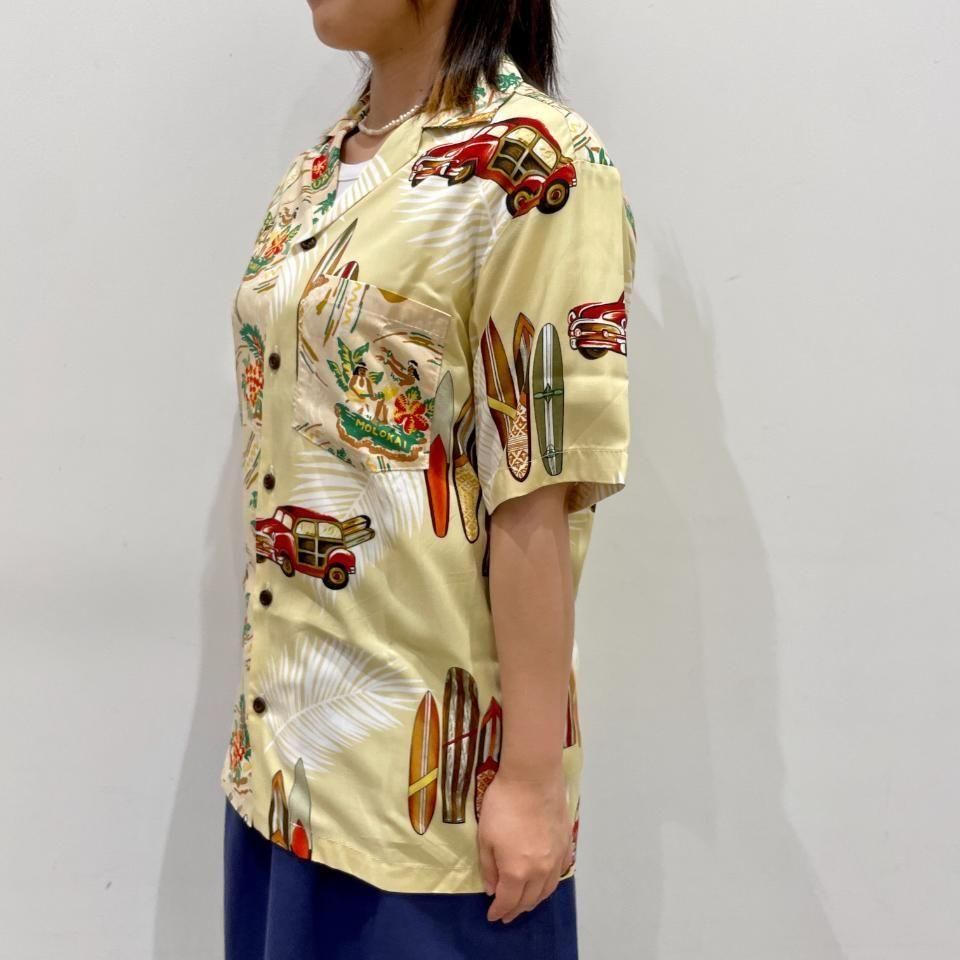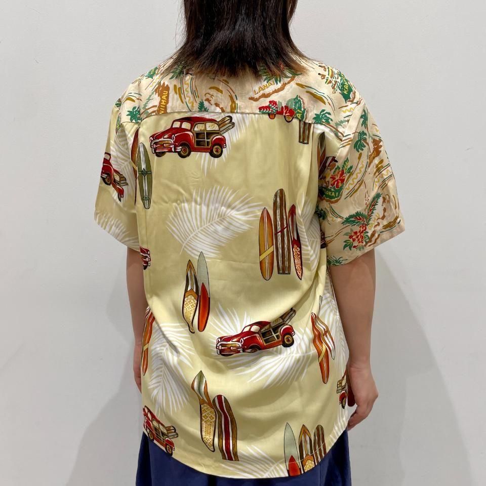 ヤシの木やパイナップルなどが描かれた南国らしい柄と、どこか懐かしいレトロな自動車とサーフボード柄を組み合わせたクレイジーパターンのアロハシャツです。