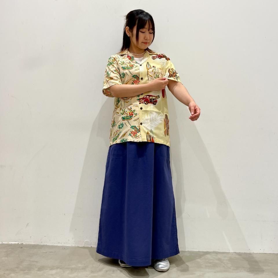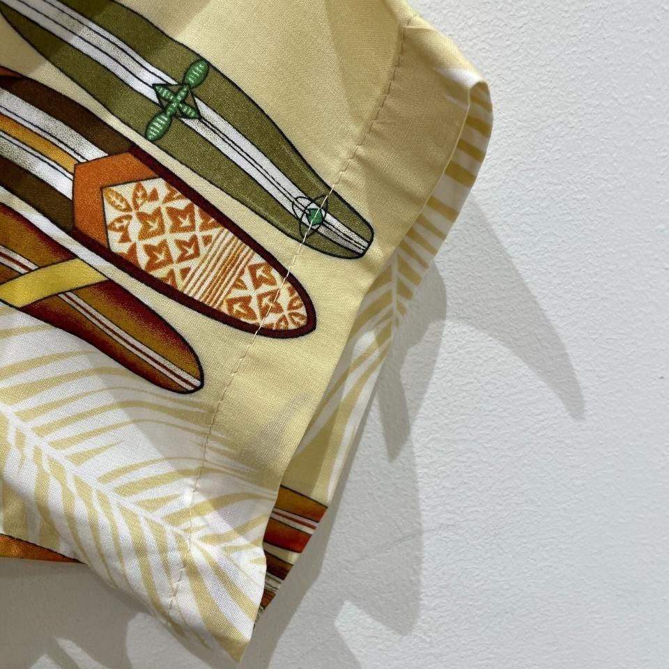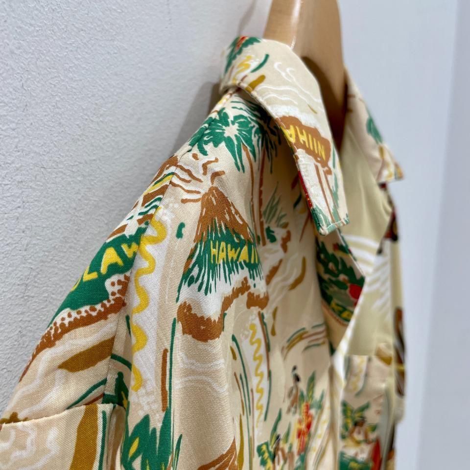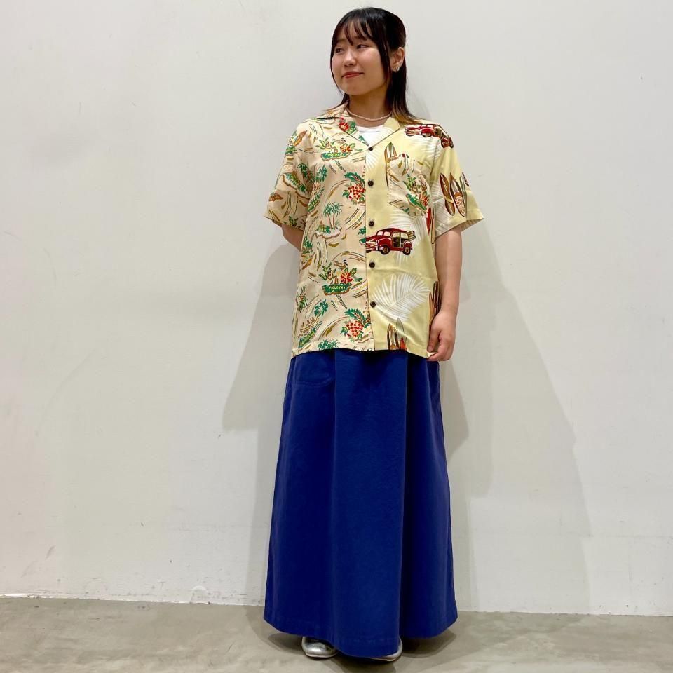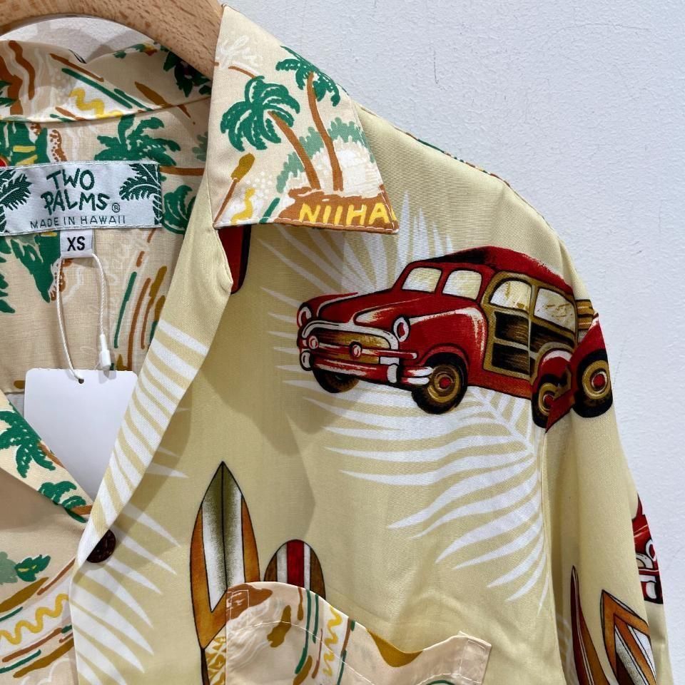 ヤシの木やパイナップルなどが描かれた南国らしい柄と、どこか懐かしいレトロな自動車とサーフボード柄を組み合わせたクレイジーパターンのアロハシャツです。