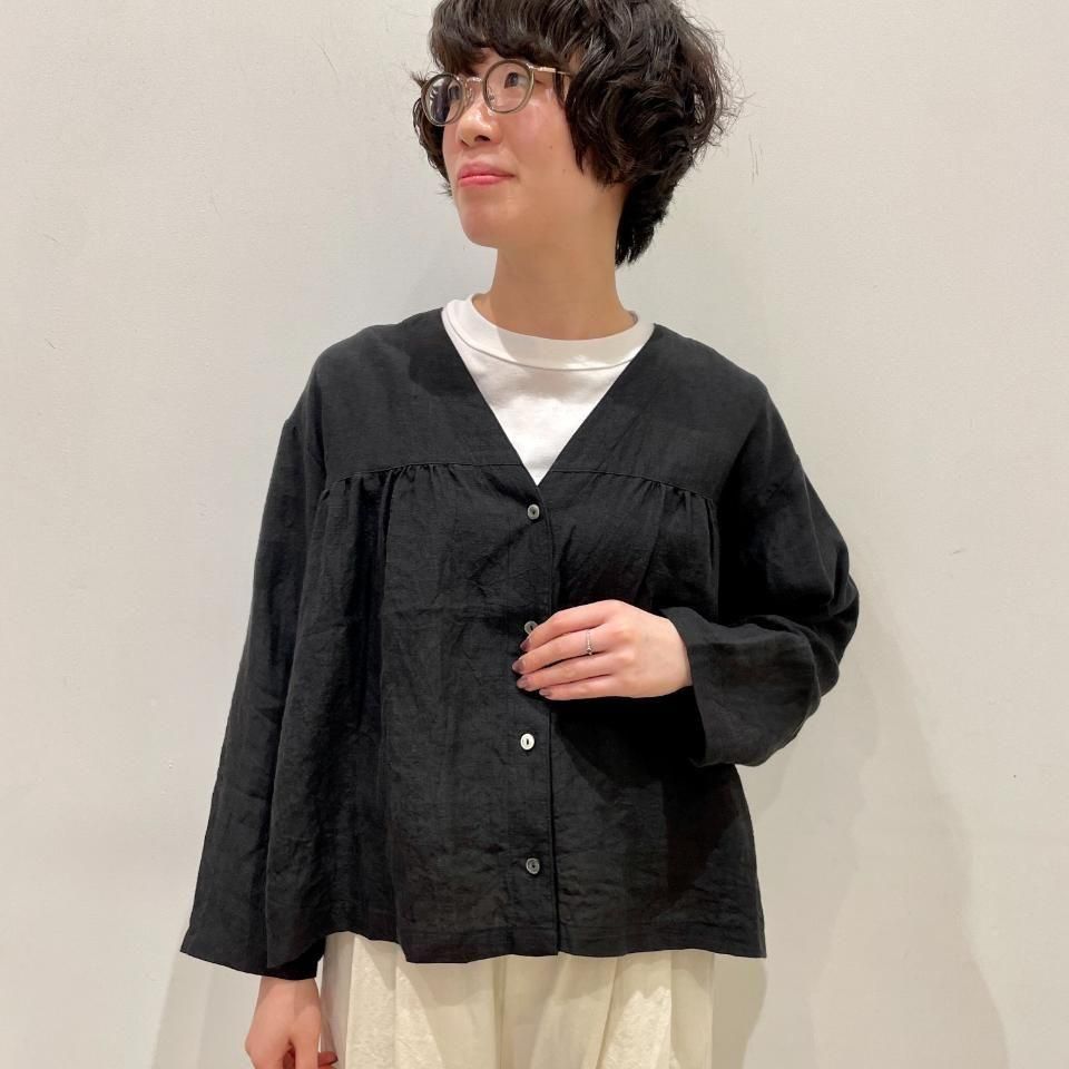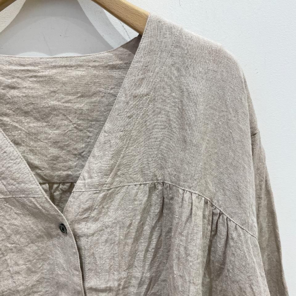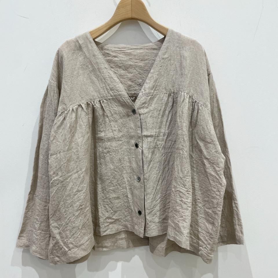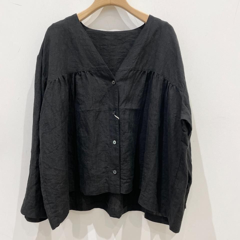 ゆったり身幅&スッキリ丈で様々なボトム、ワンピース等とバランスよく合わせられるVネックの前開きブラウス。