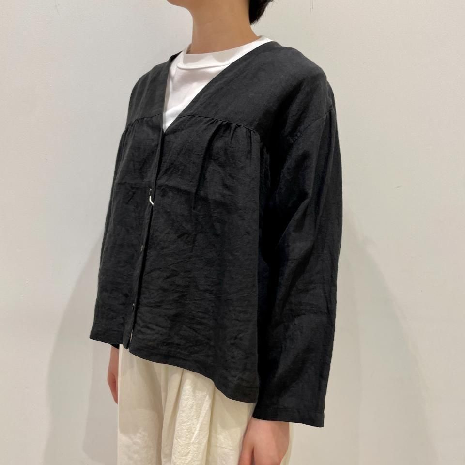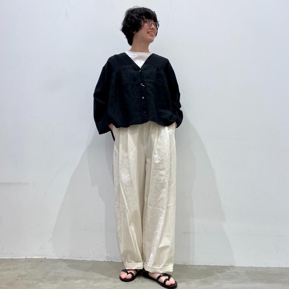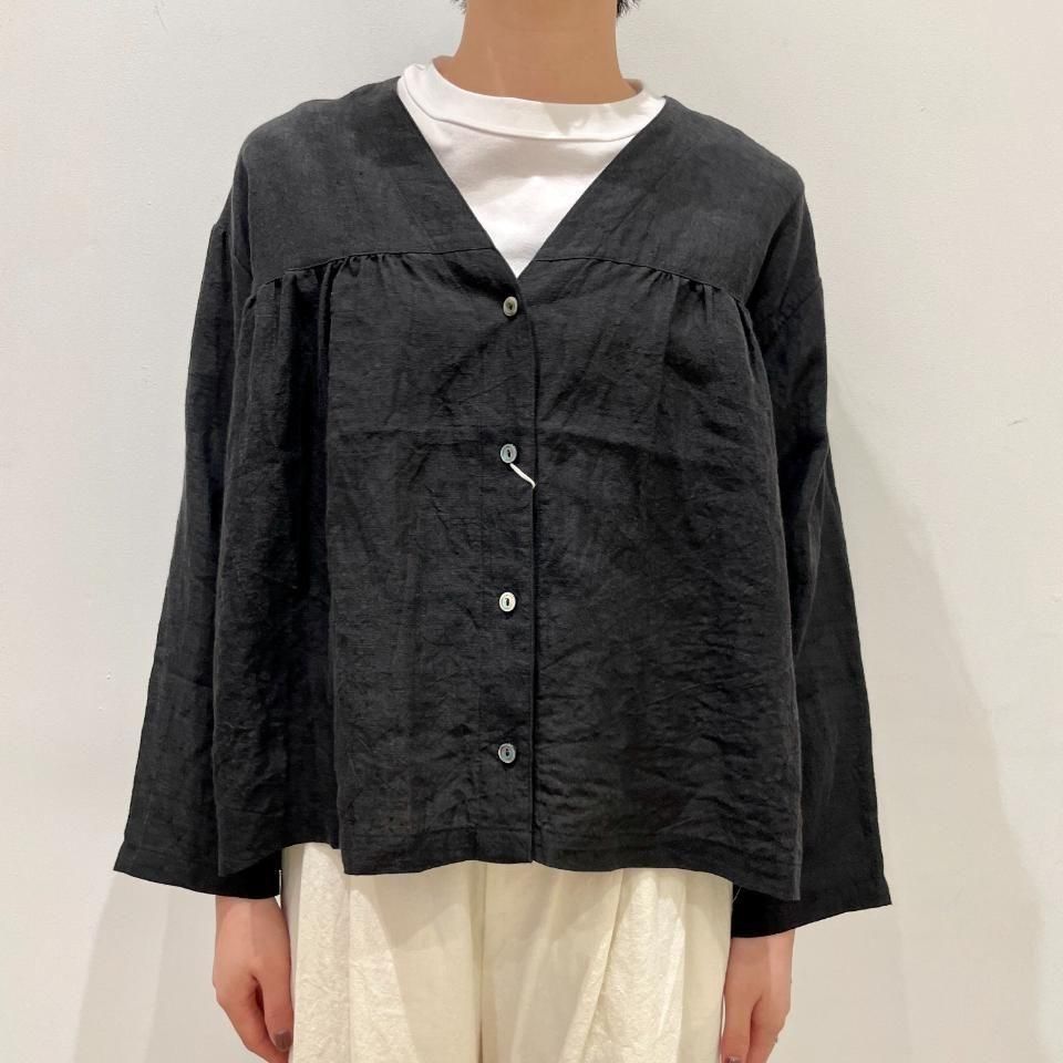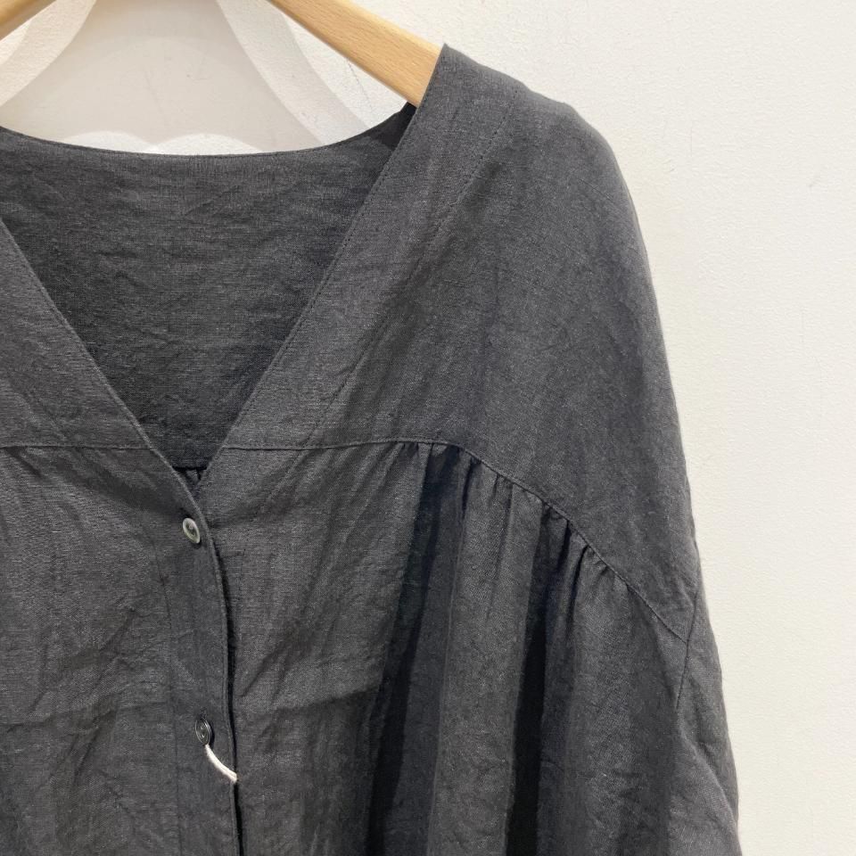 ゆったり身幅&スッキリ丈で様々なボトム、ワンピース等とバランスよく合わせられるVネックの前開きブラウス。