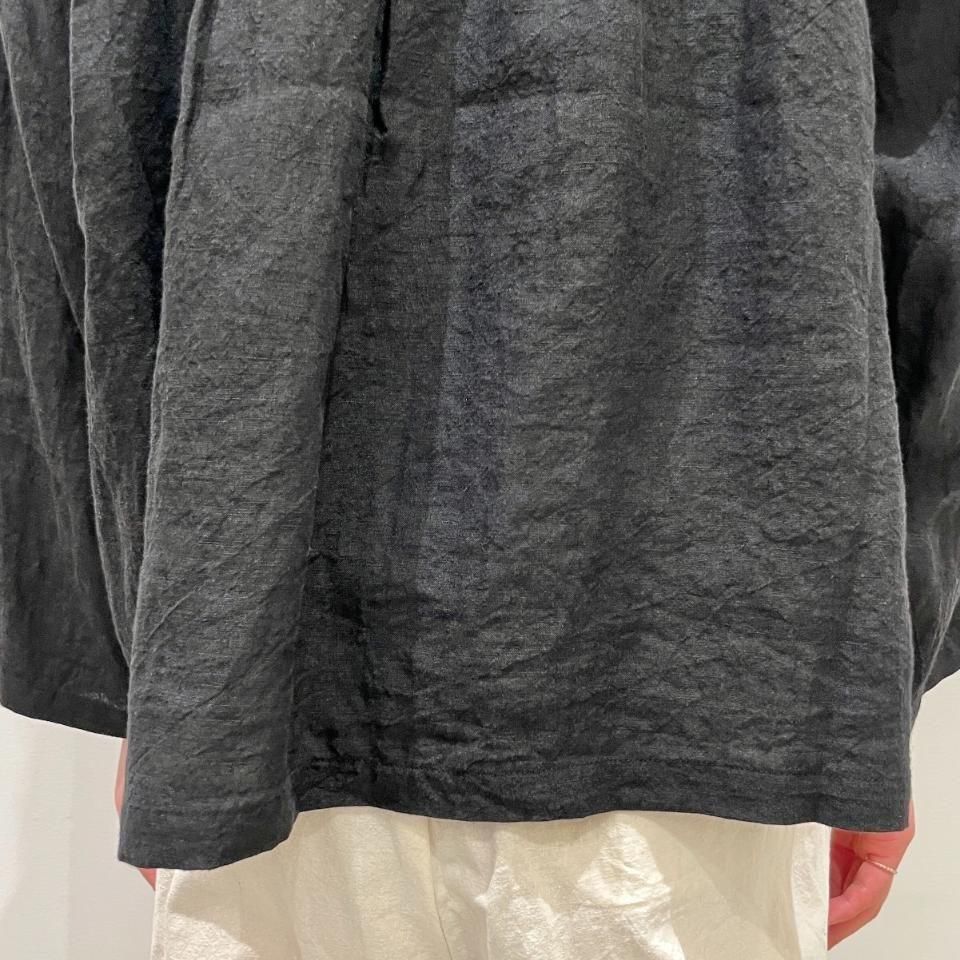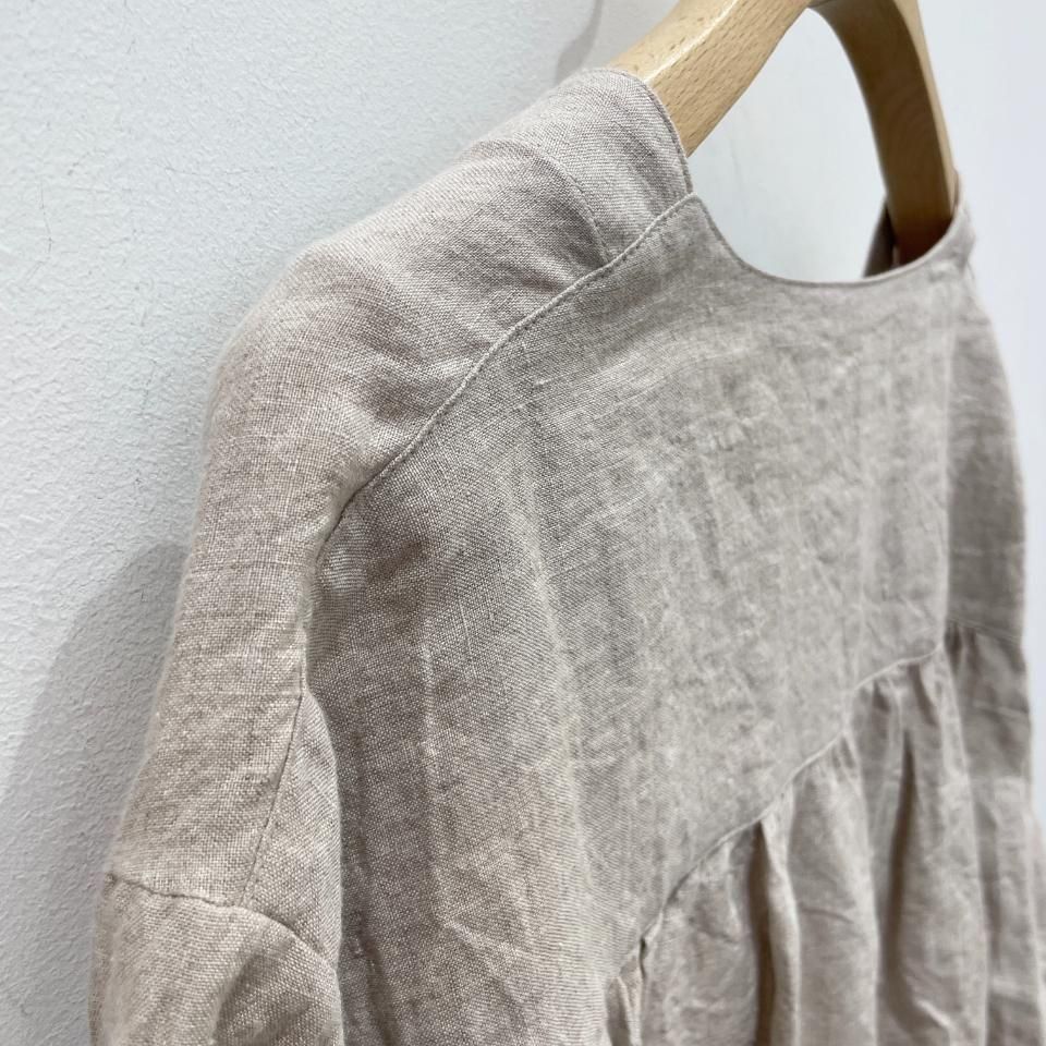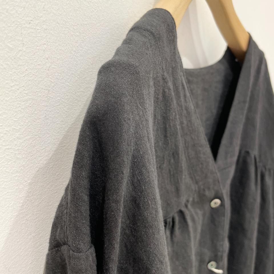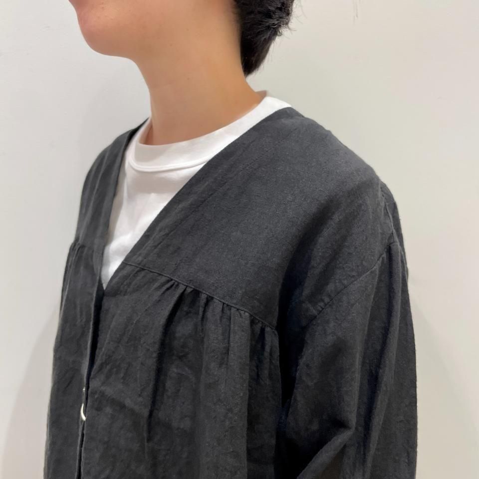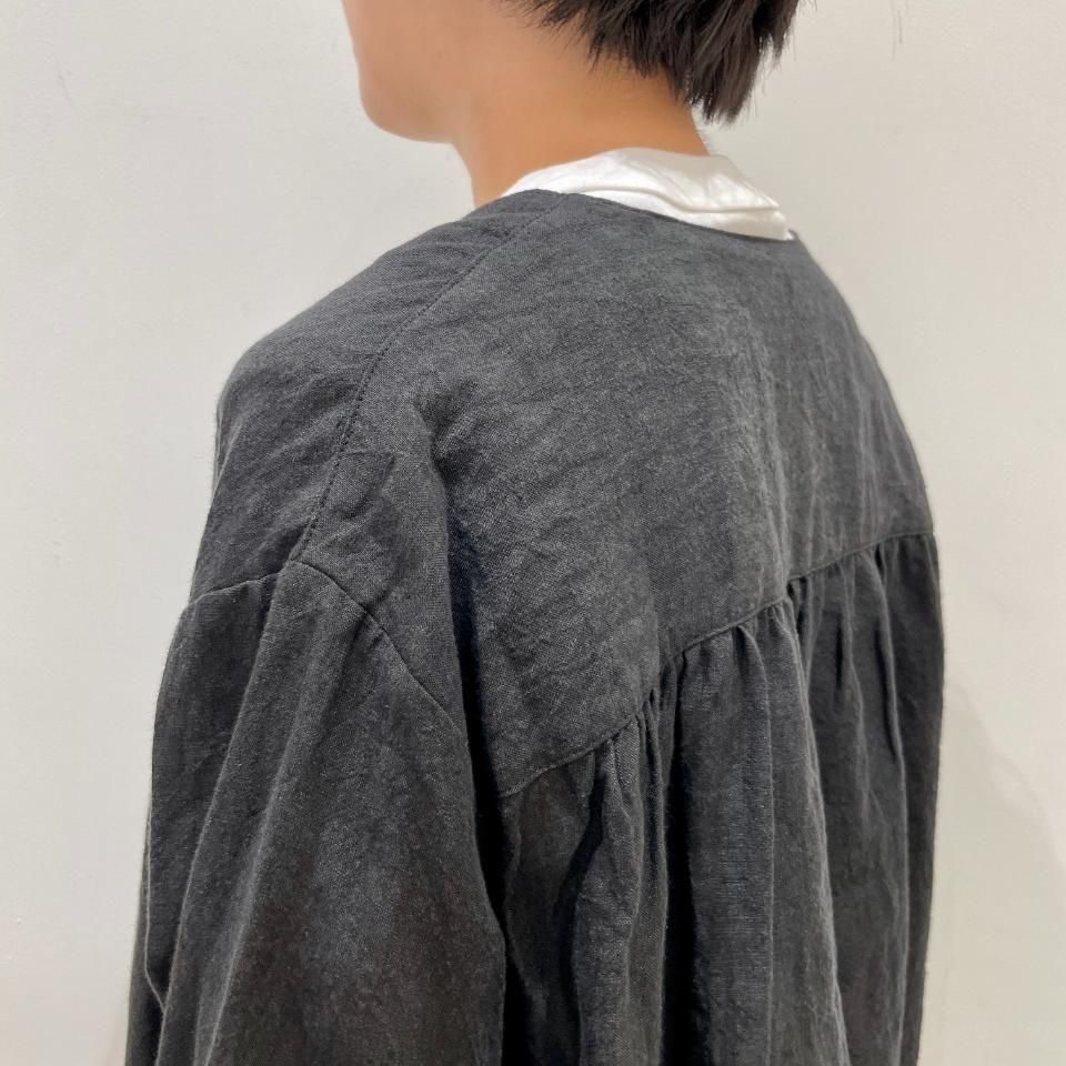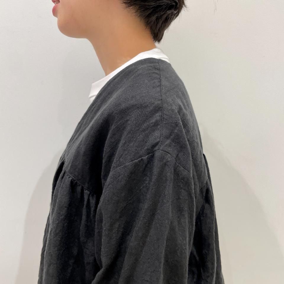 前後の切り替えギャザーが裾まで広がるふんわりシルエットでカーディガンのように羽織りとしても便利です。