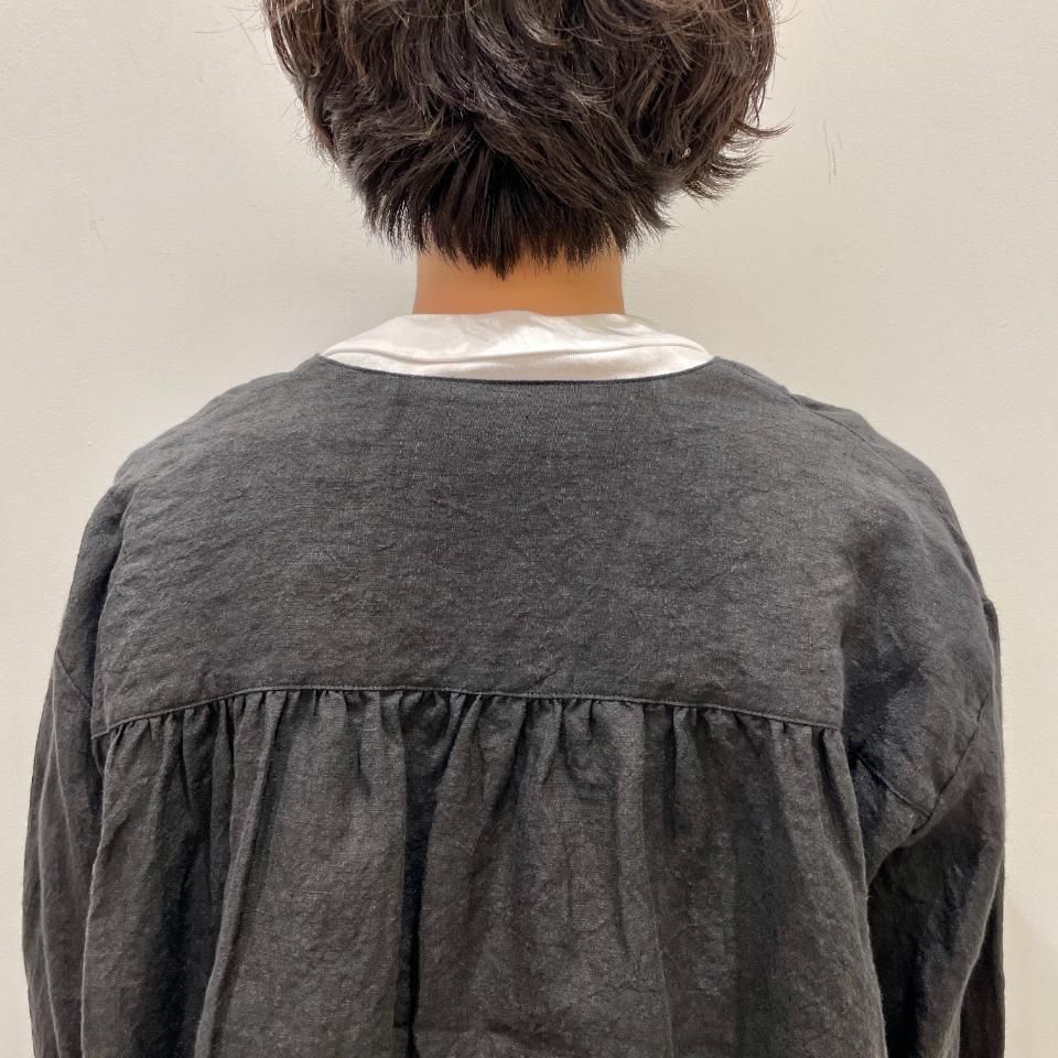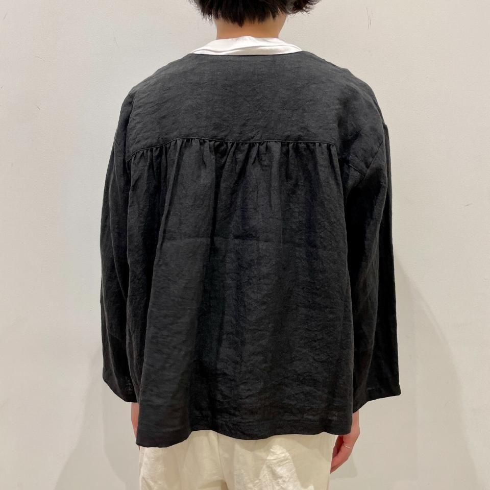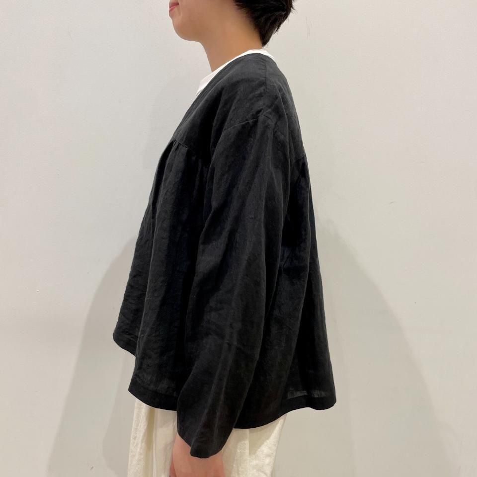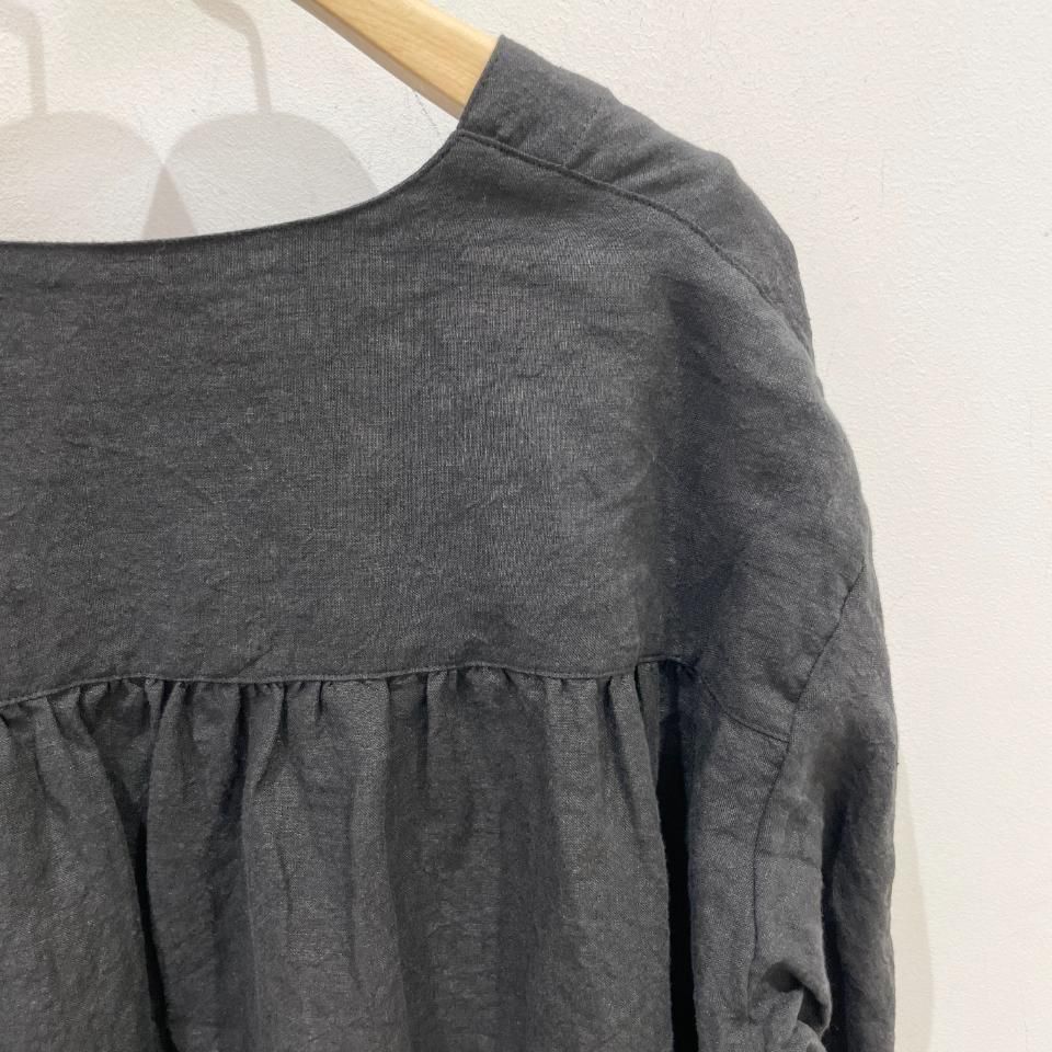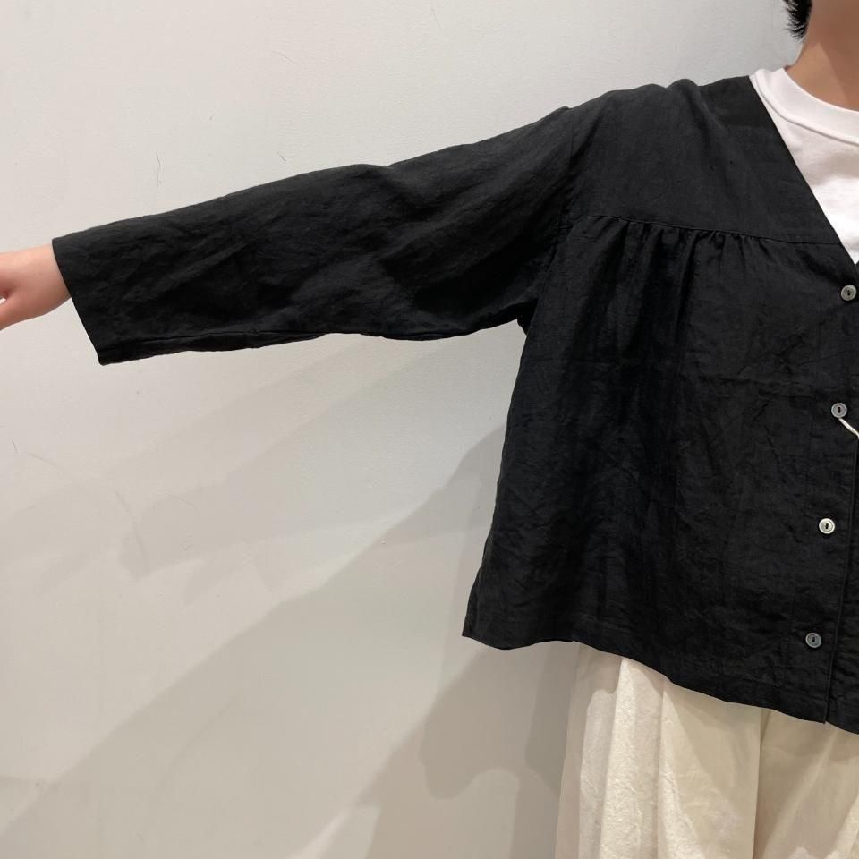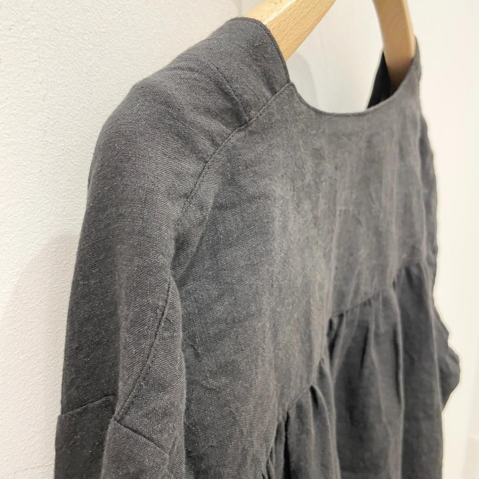 前後の切り替えギャザーが裾まで広がるふんわりシルエットでカーディガンのように羽織りとしても便利です。