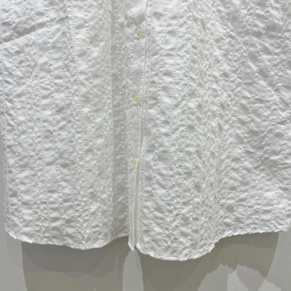 前身頃にストライプ状に施されたフラワー刺繍が特徴の重ね襟裾ラウンド半袖シャツ。