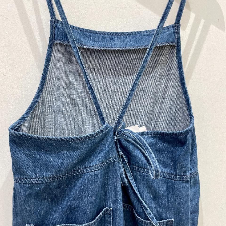 子供っぽくなりがちなオーバーオールも、すっきりとしたシンプルなデザインに細い肩紐で華奢な印象に。