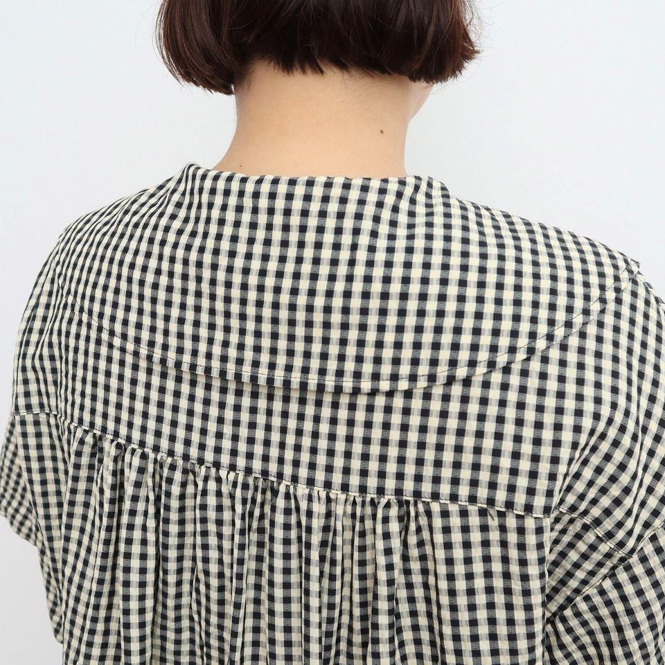 クラシカルな印象の大きめな襟や後ろにたっぷりと入ったギャザーがポイント。