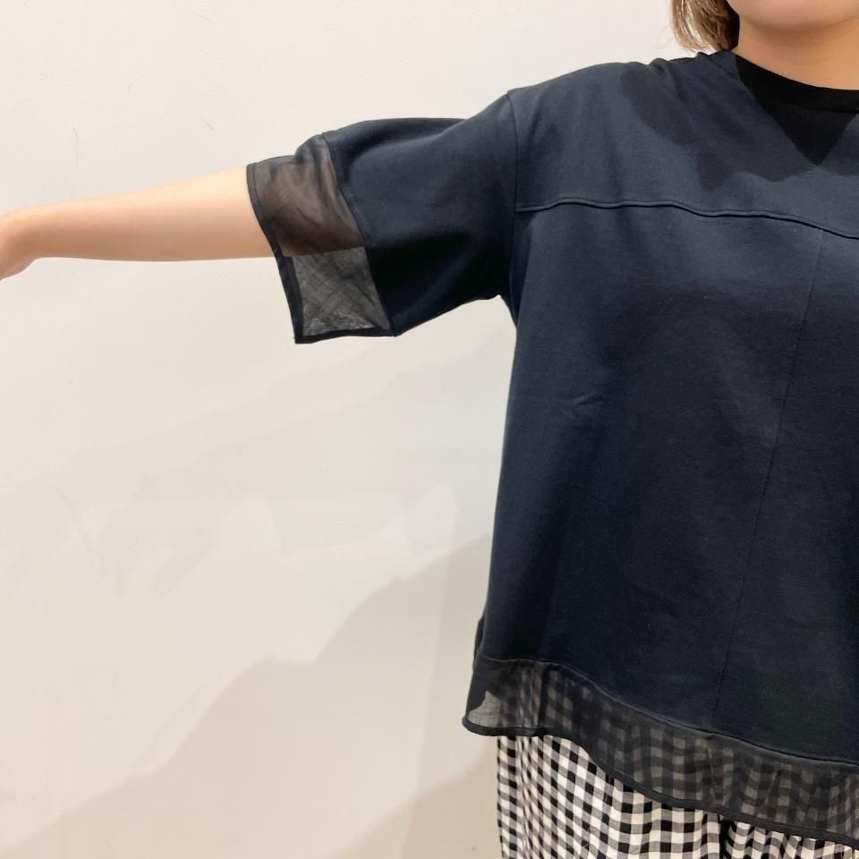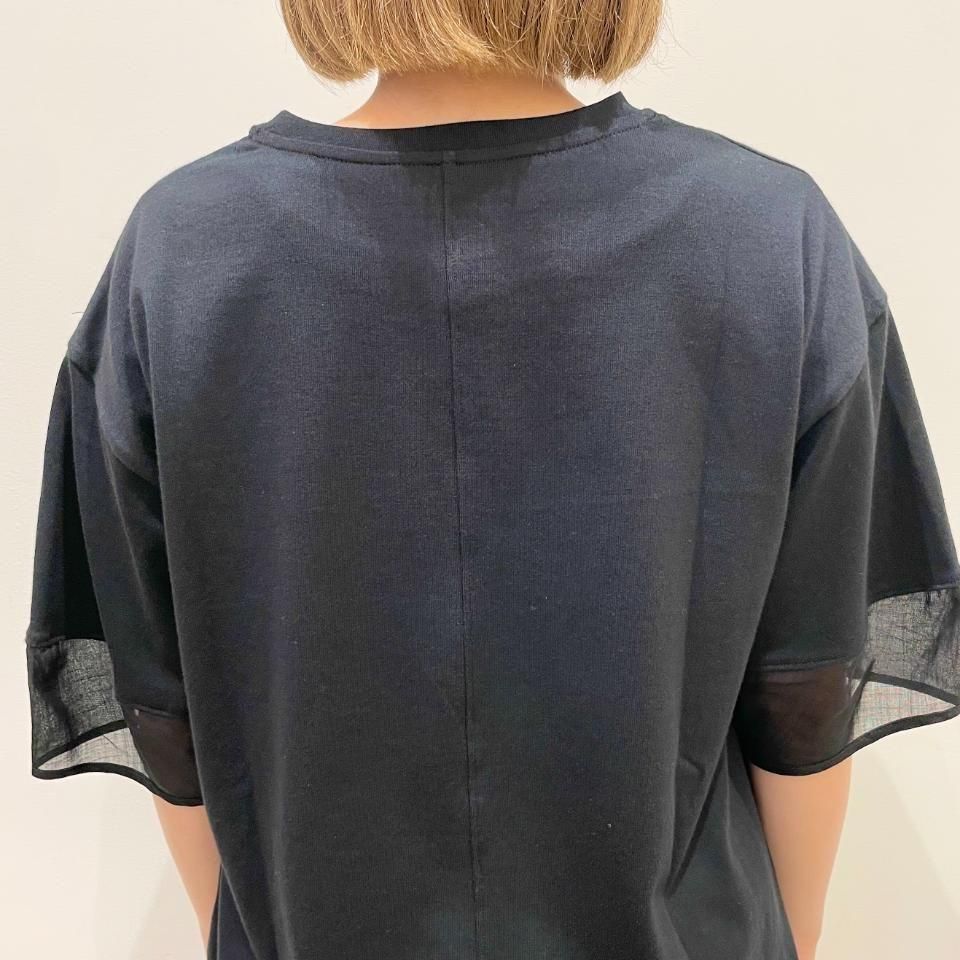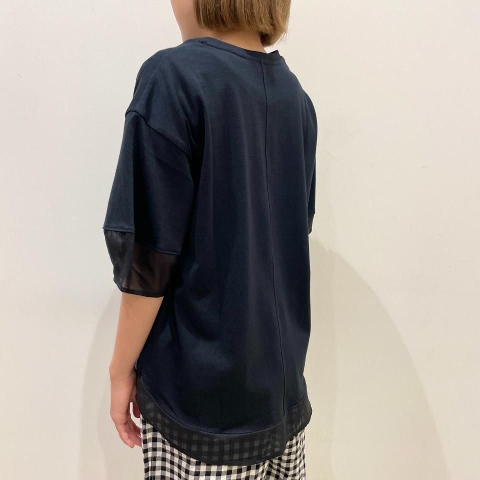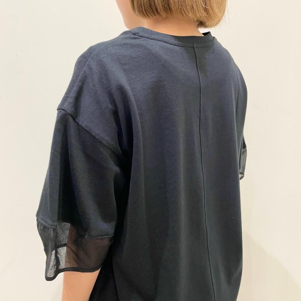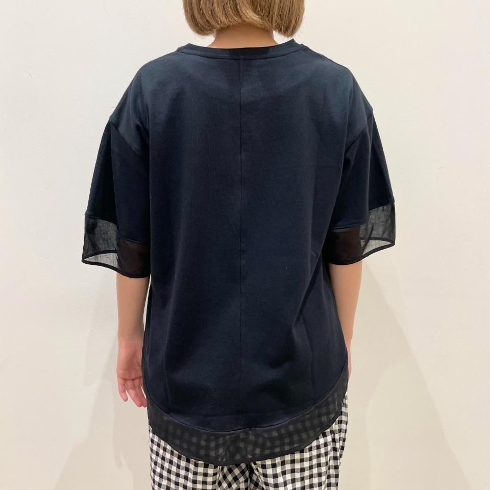 袖と裾にポリエステルオーガンジーを使用した異素材切替Tシャツ。