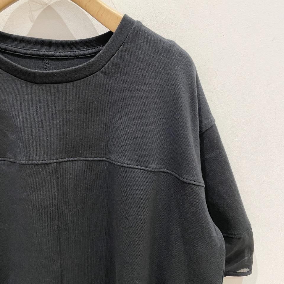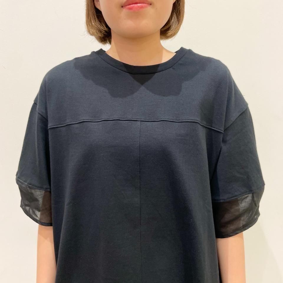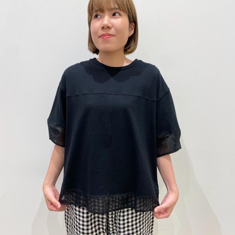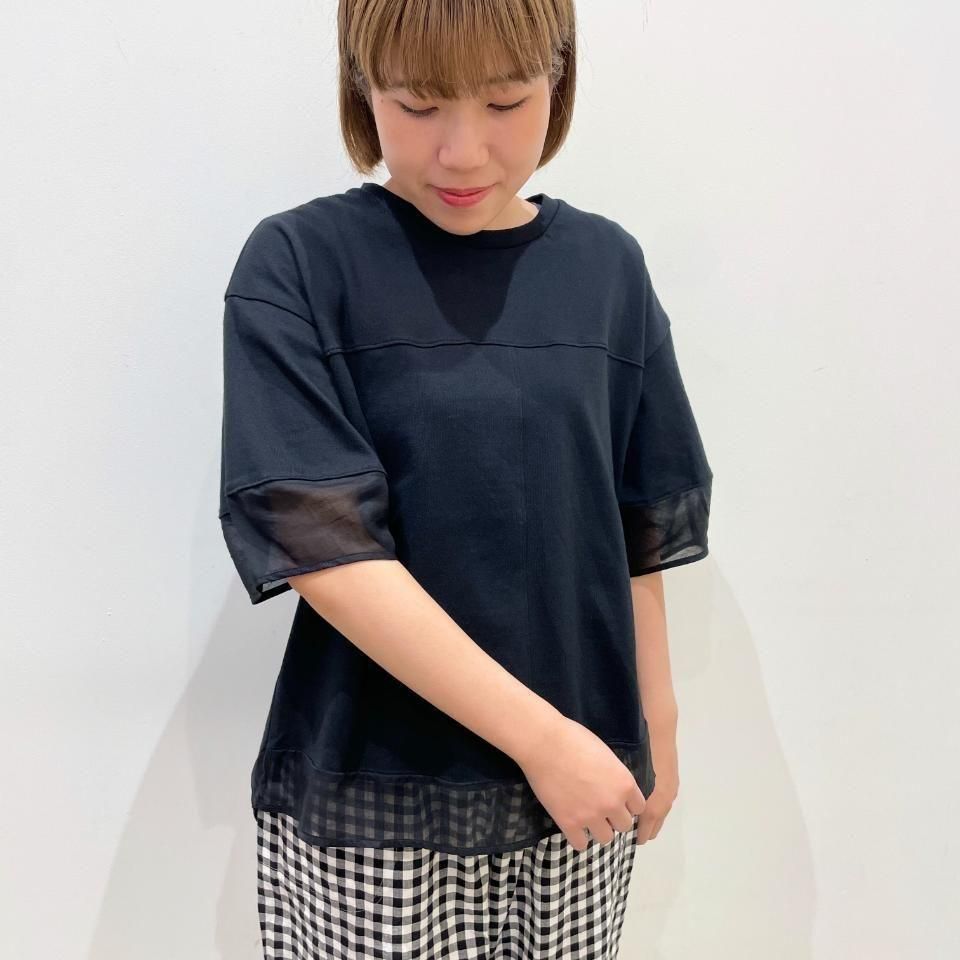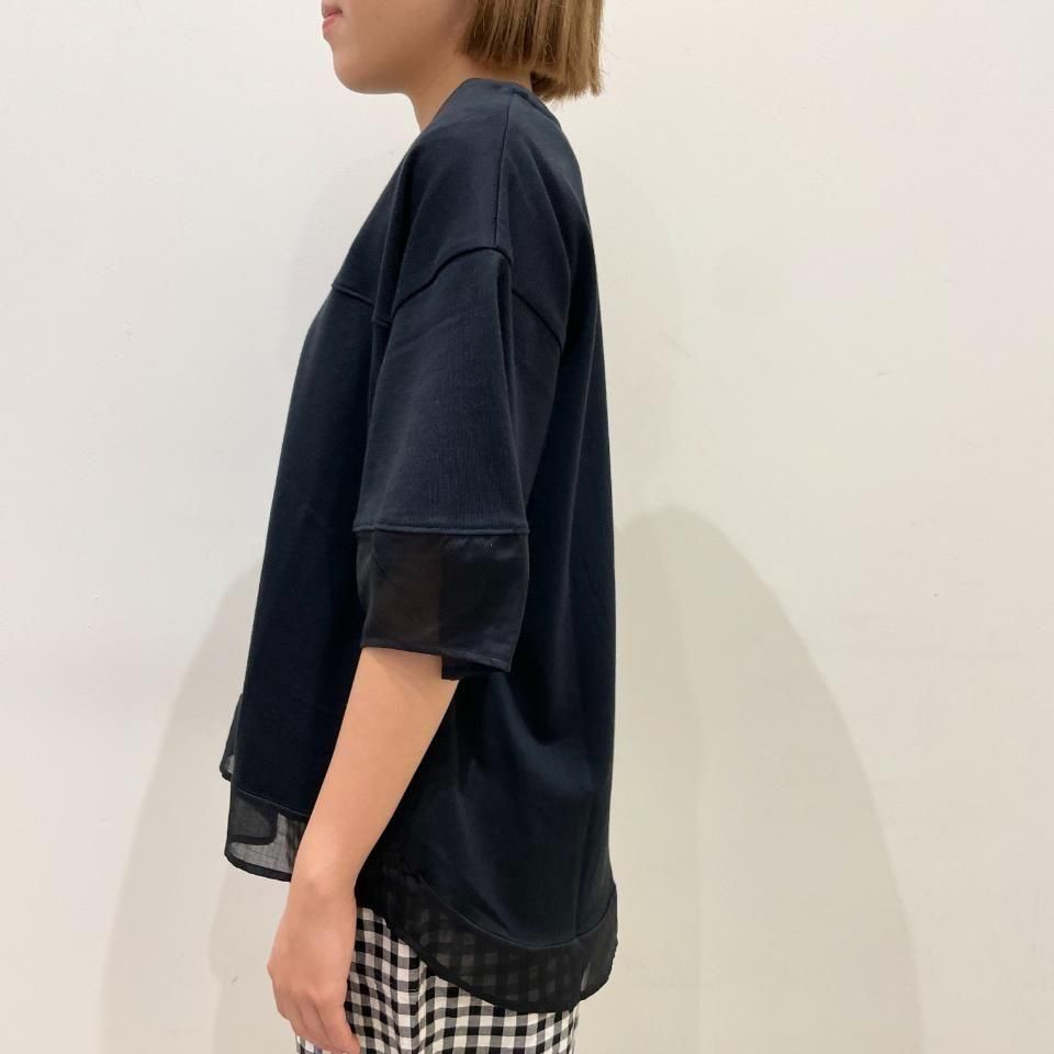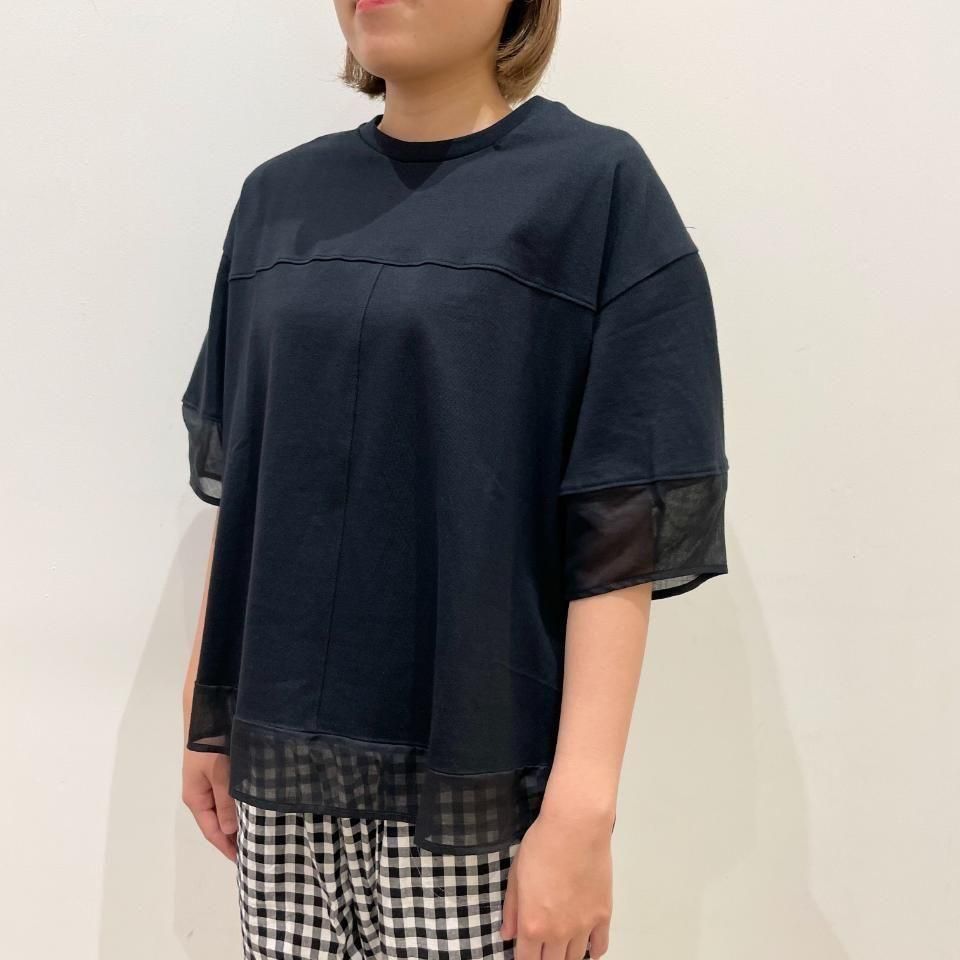 袖と裾にポリエステルオーガンジーを使用した異素材切替Tシャツ。