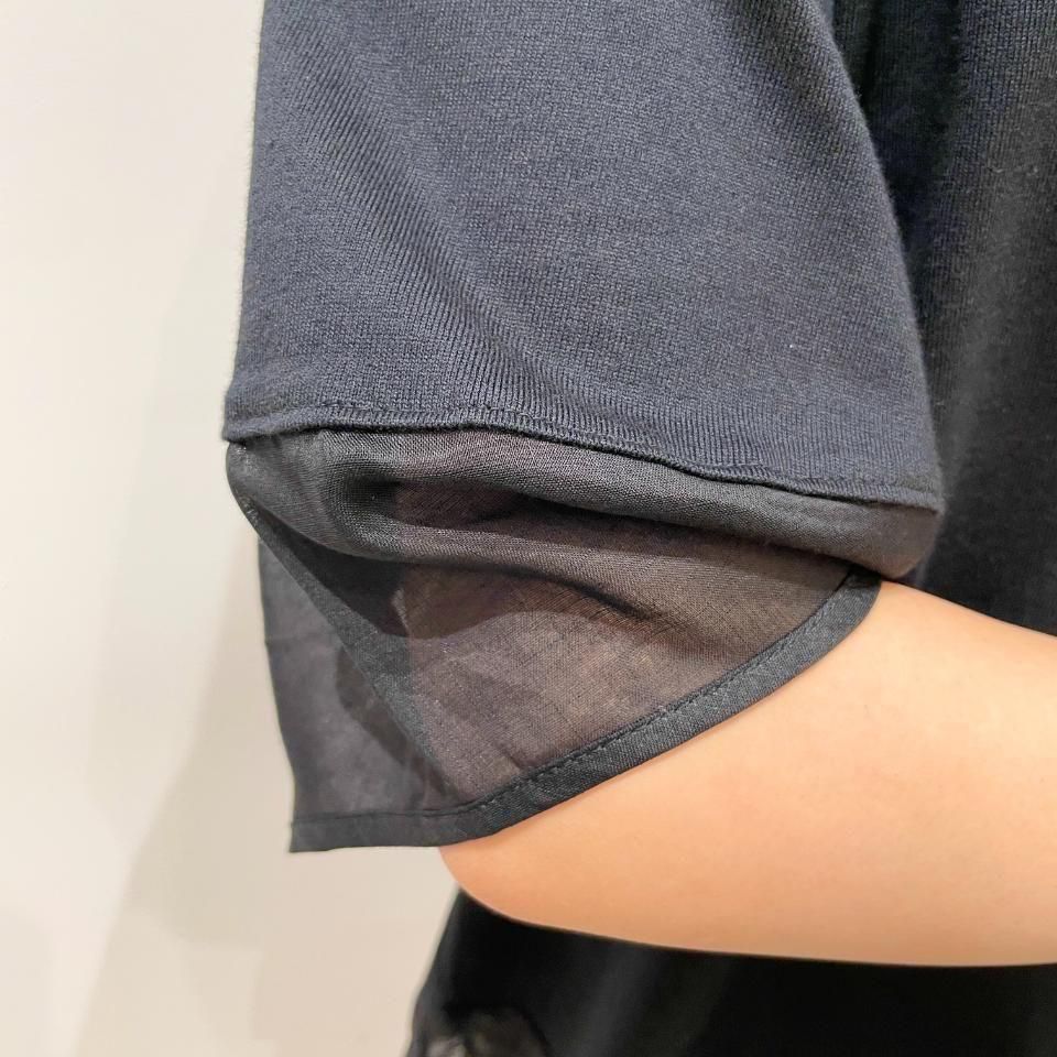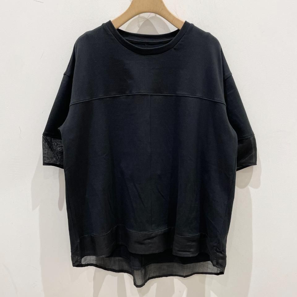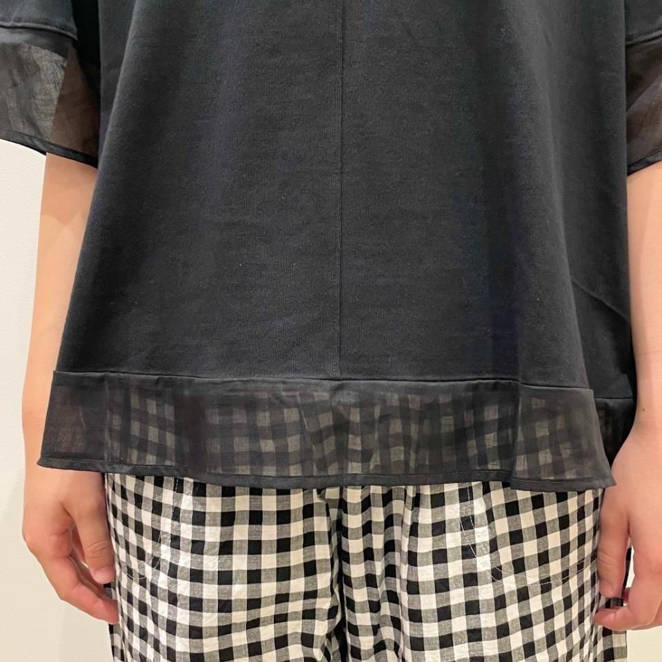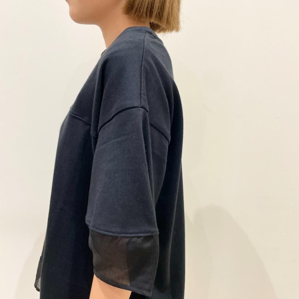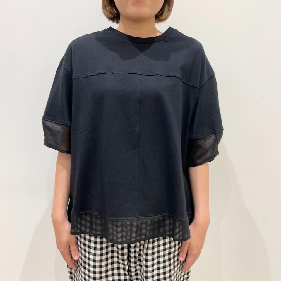 袖と裾にポリエステルオーガンジーを使用した異素材切替Tシャツ。