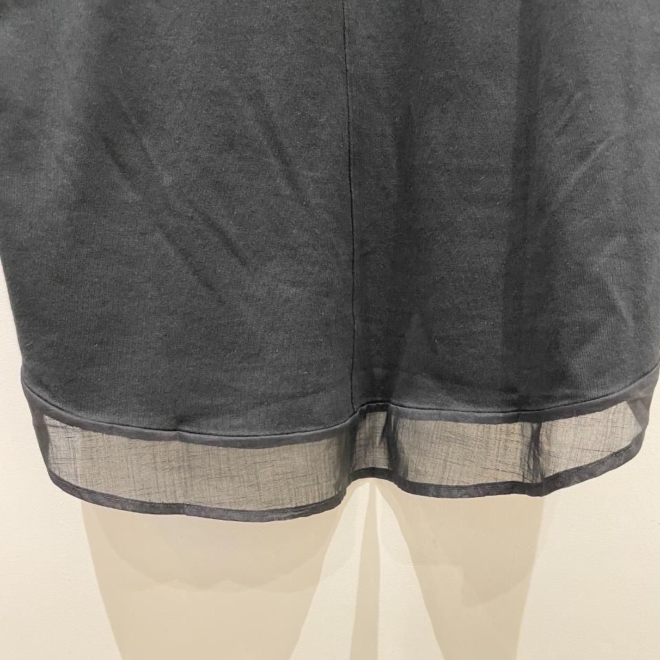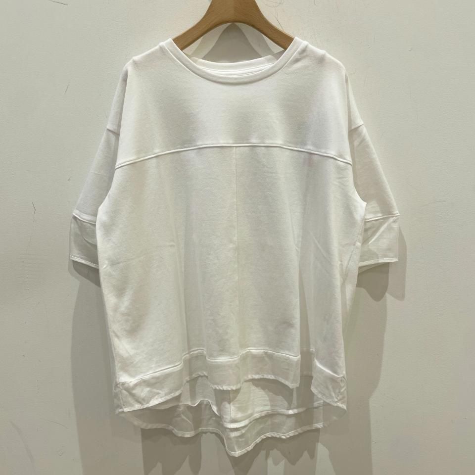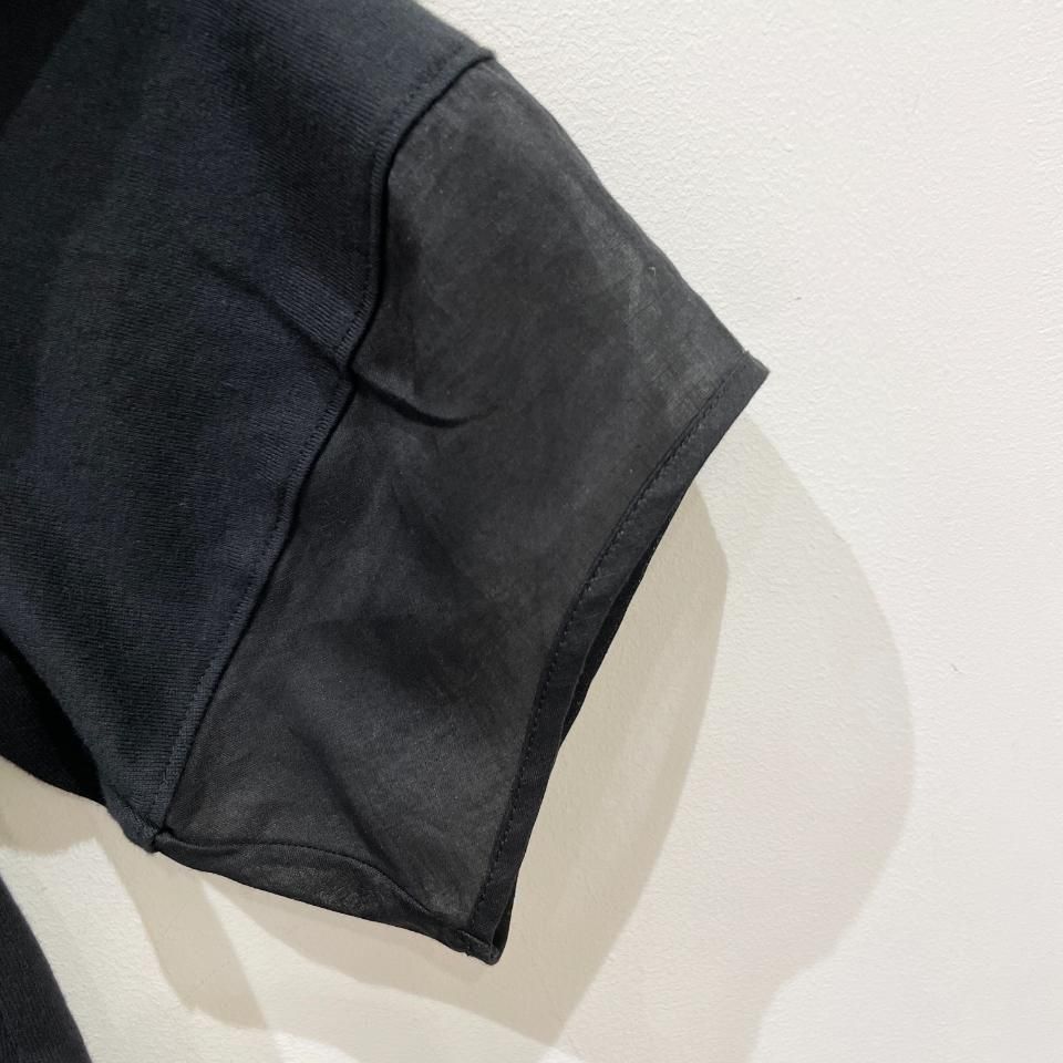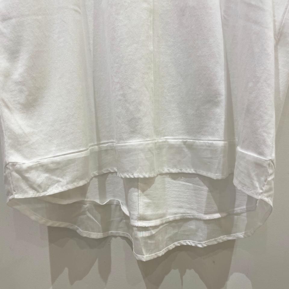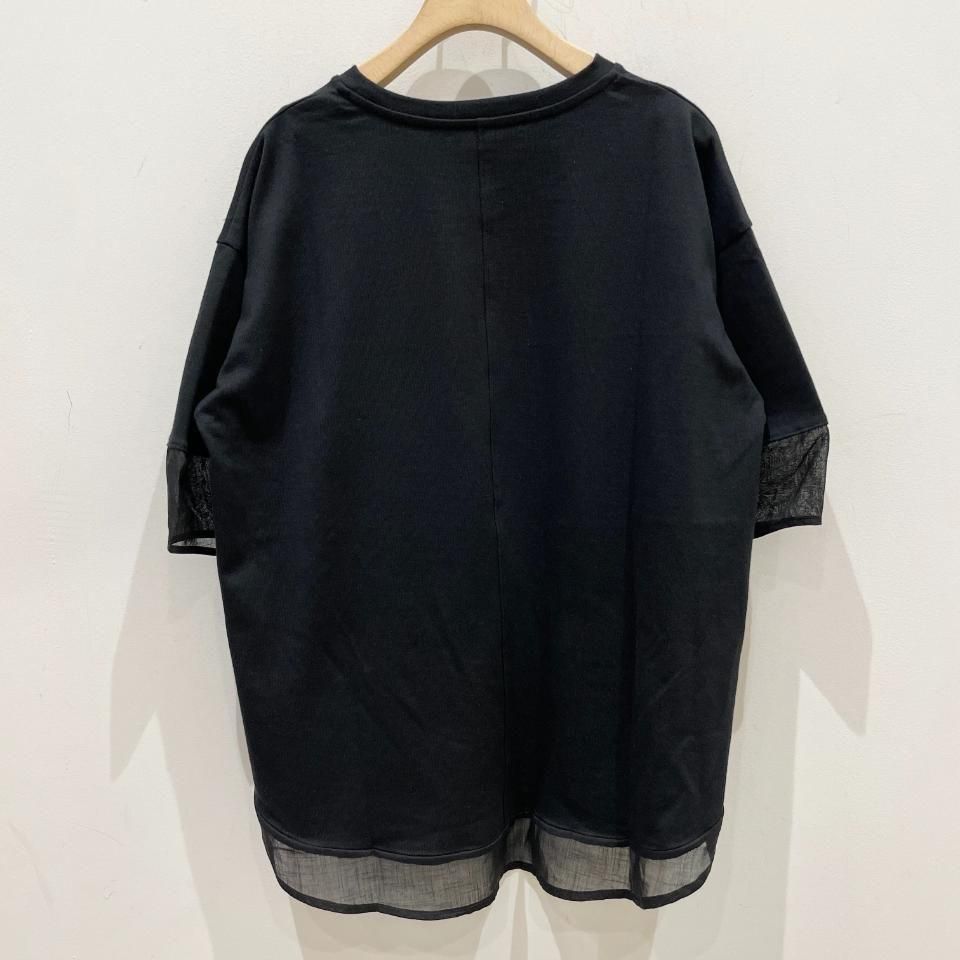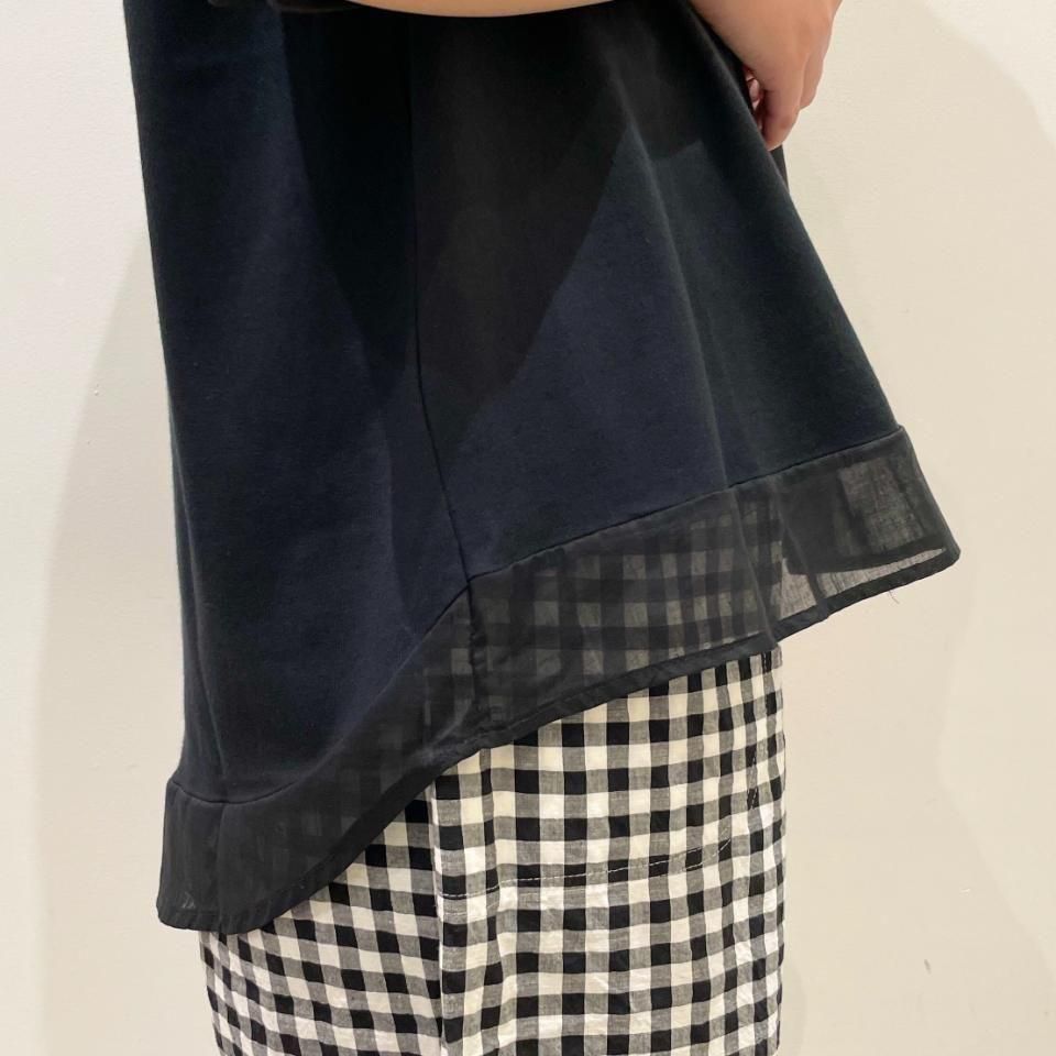 袖と裾にポリエステルオーガンジーを使用した異素材切替Tシャツ。