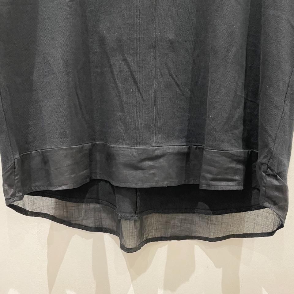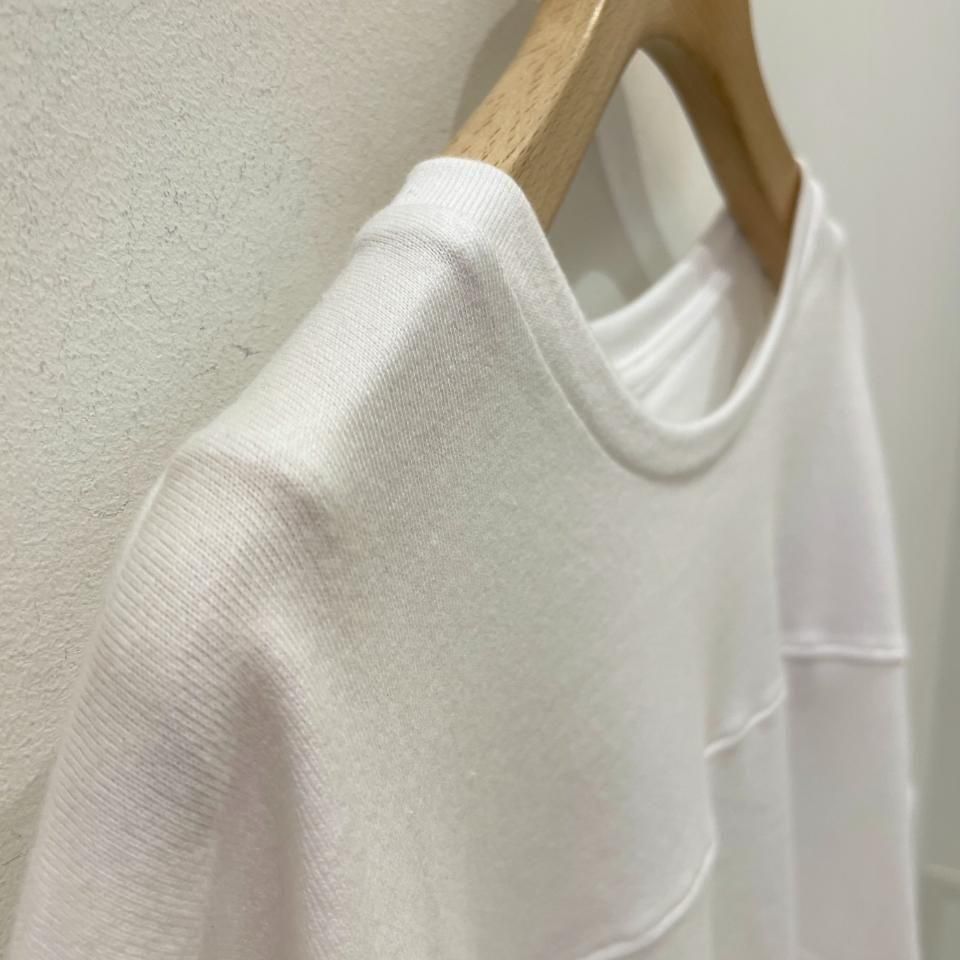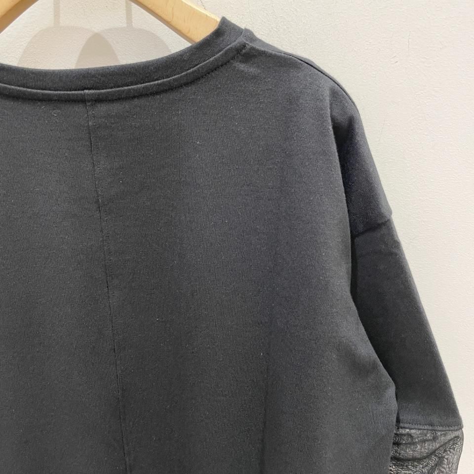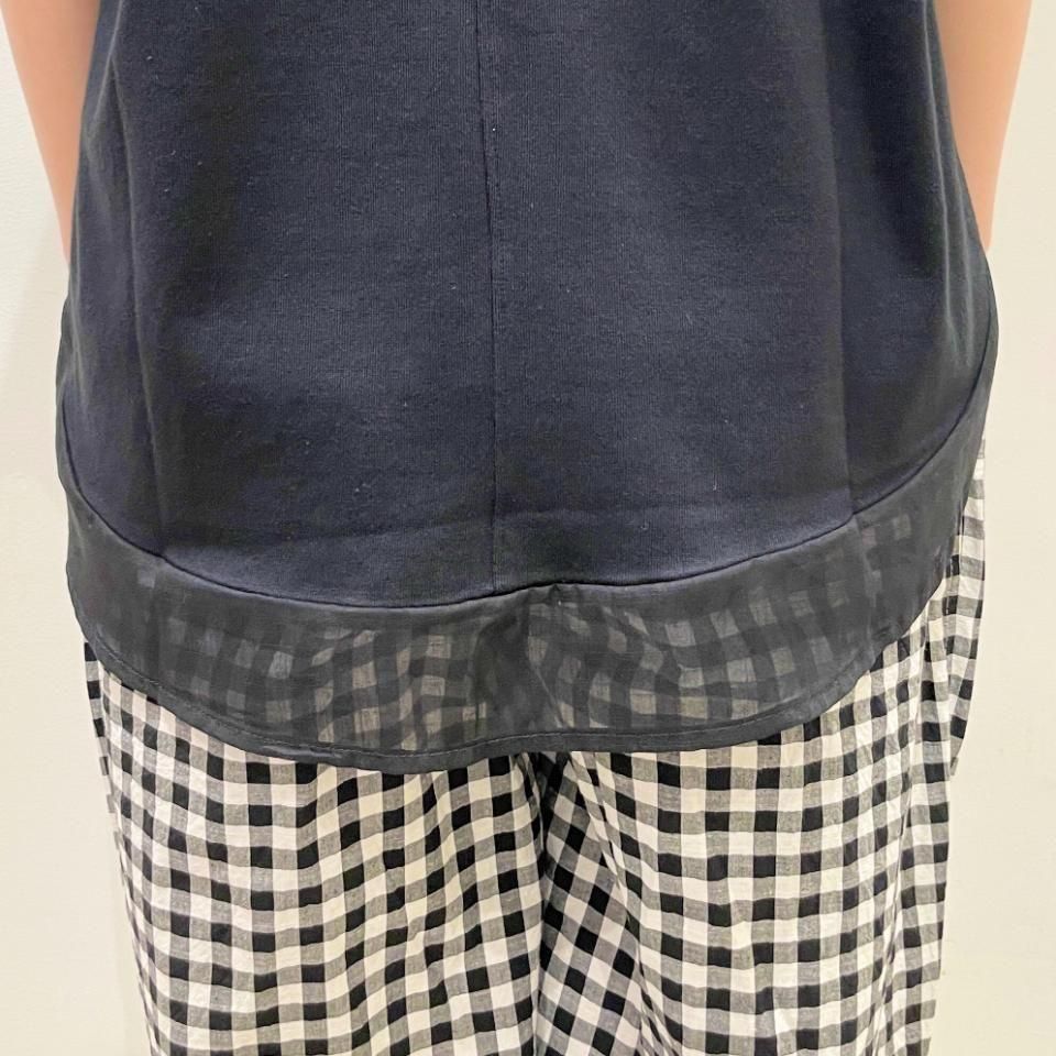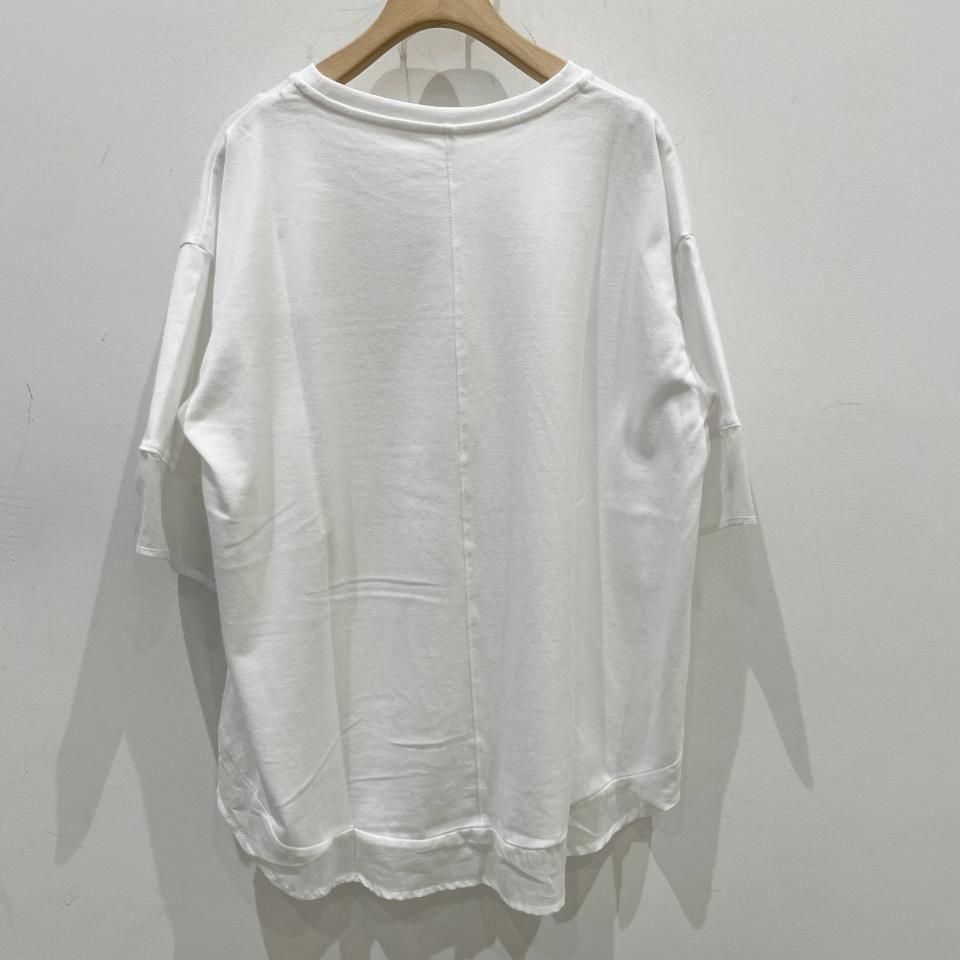袖と裾にポリエステルオーガンジーを使用した異素材切替Tシャツ。