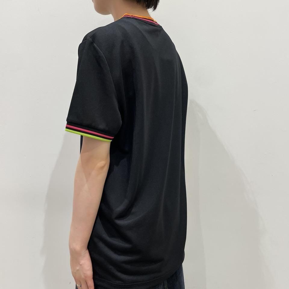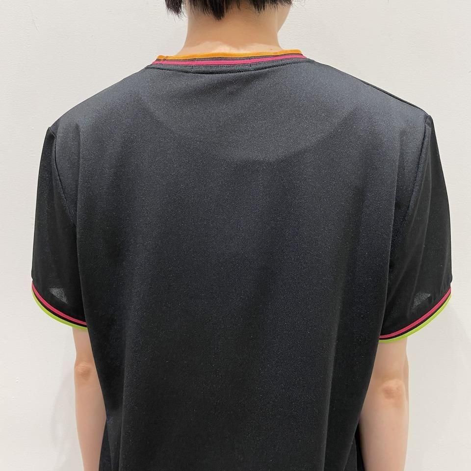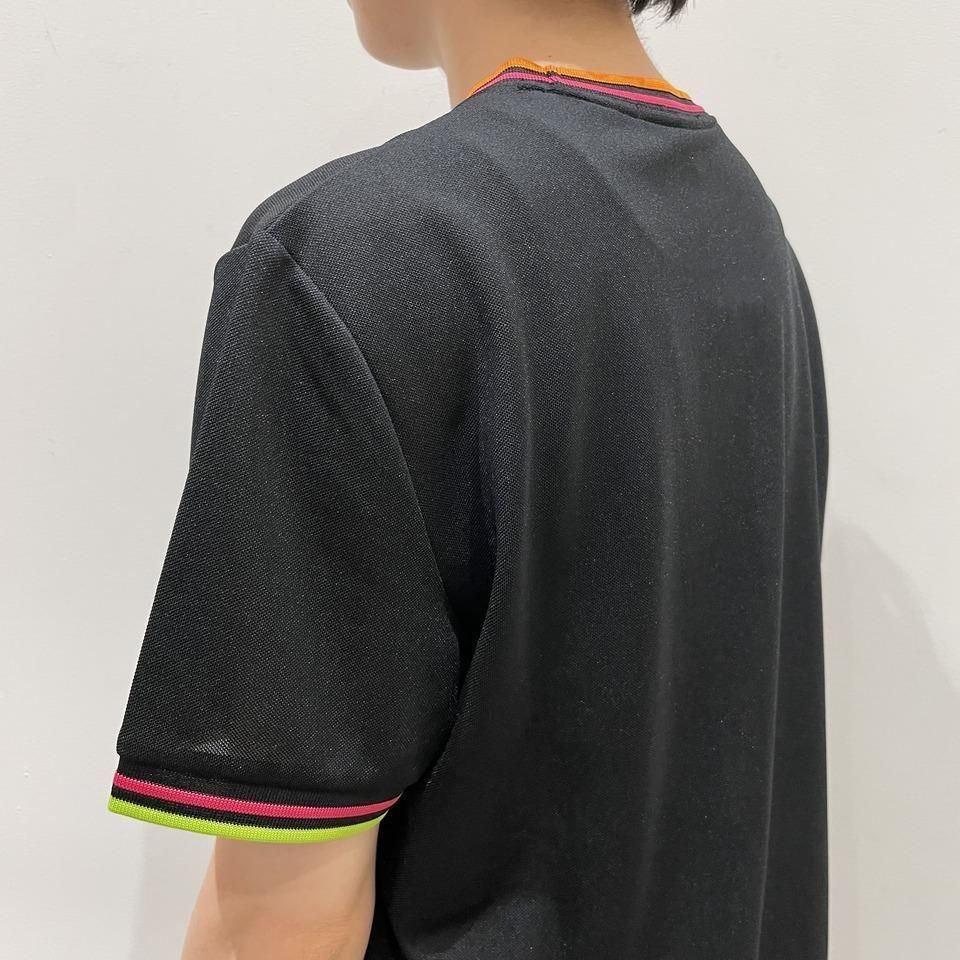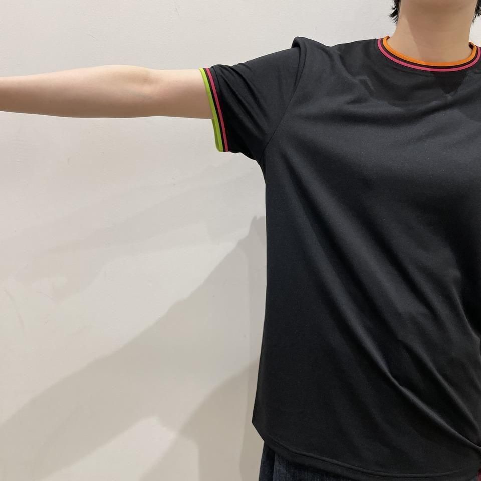 ネックはオレンジとピンク、袖リブにはピンクとイエローのラインが入っています。