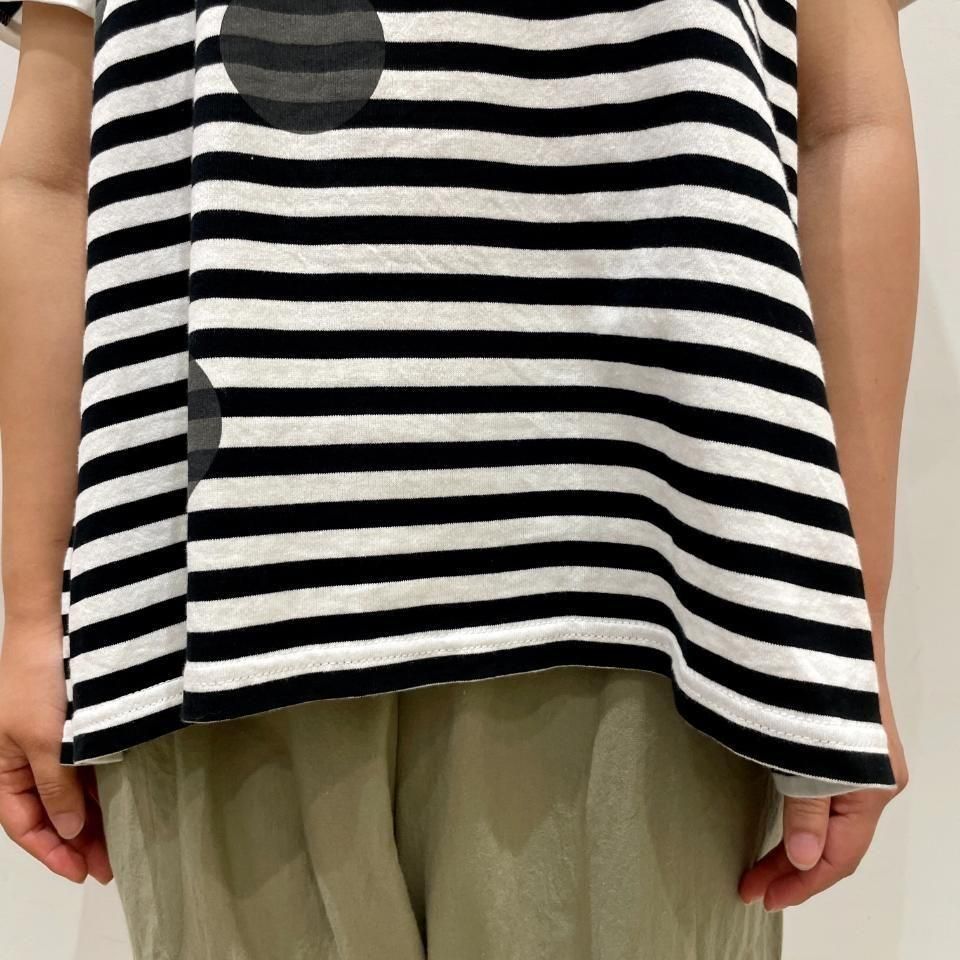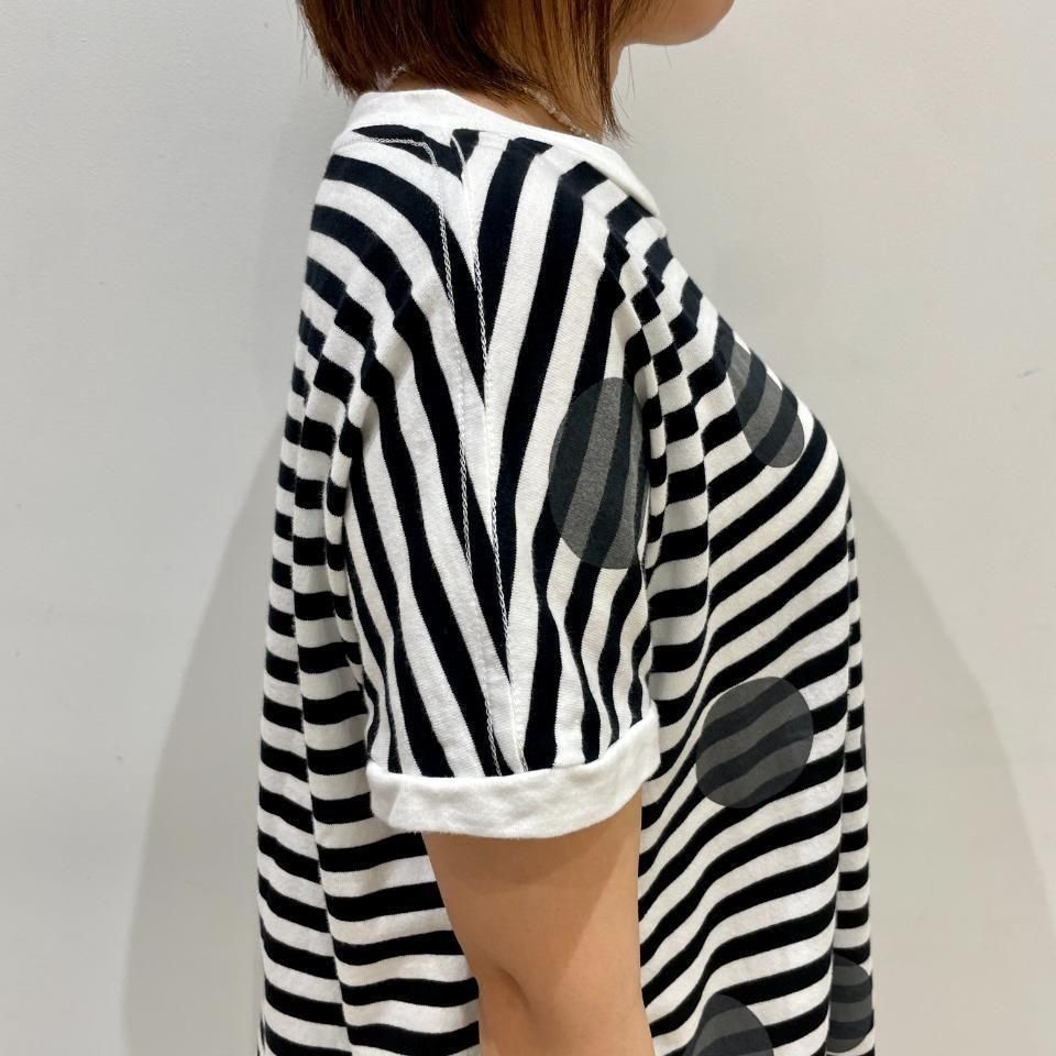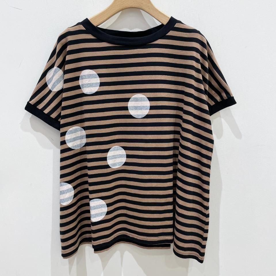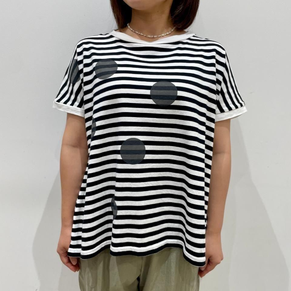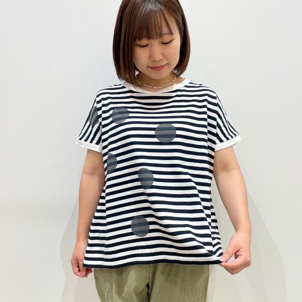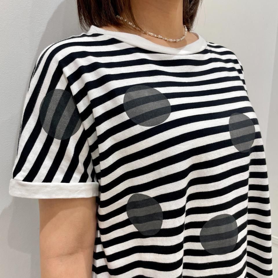 ボーダーにランダムに重ねた大きな水玉が目を惹くTシャツ。