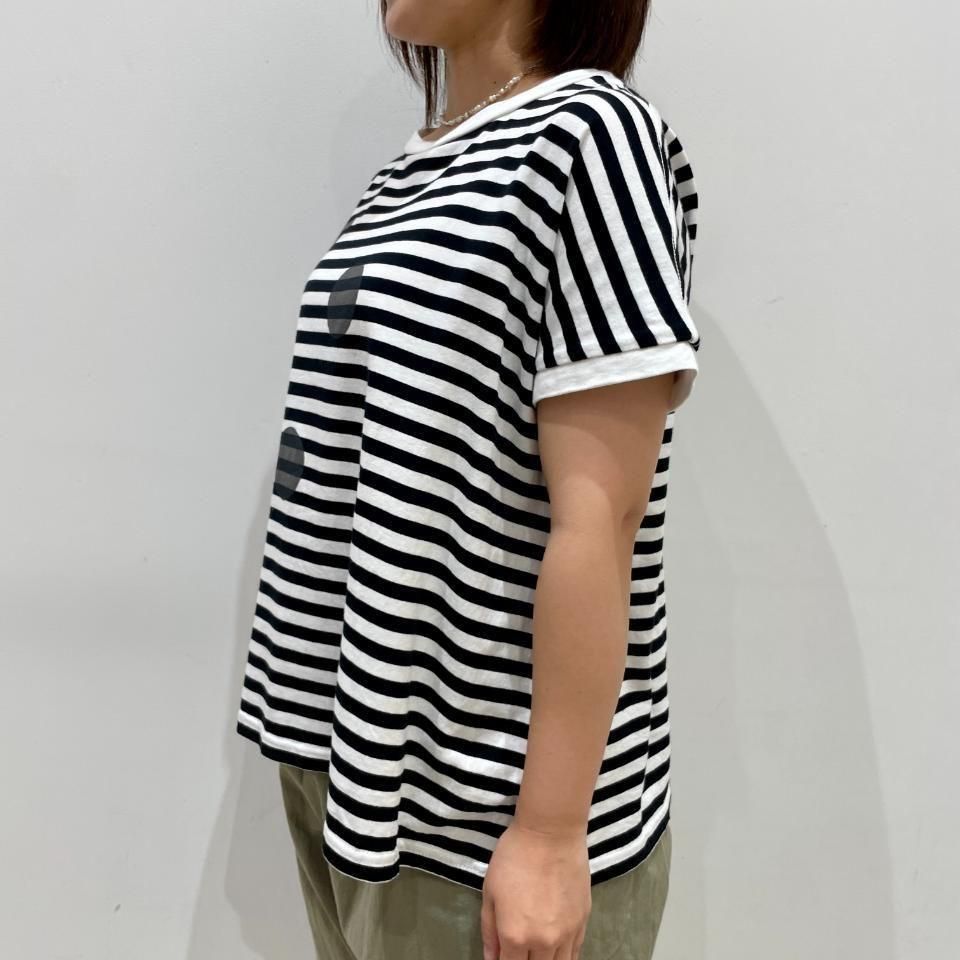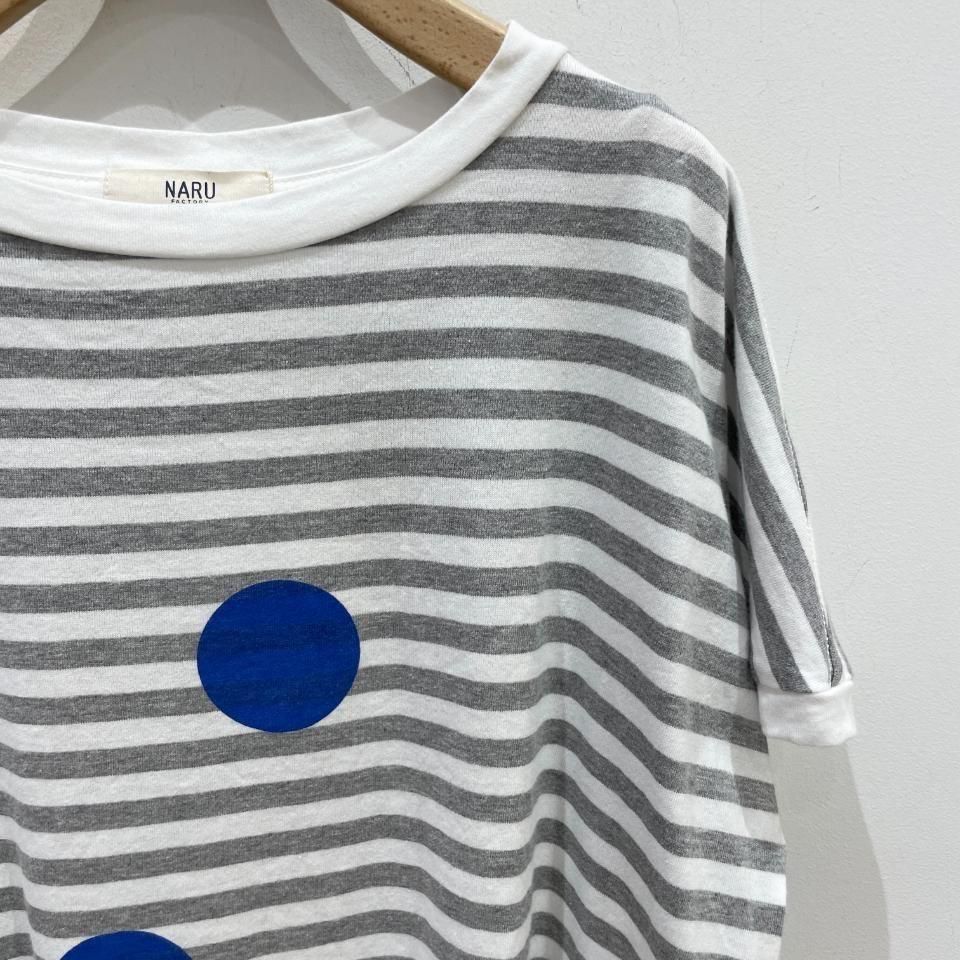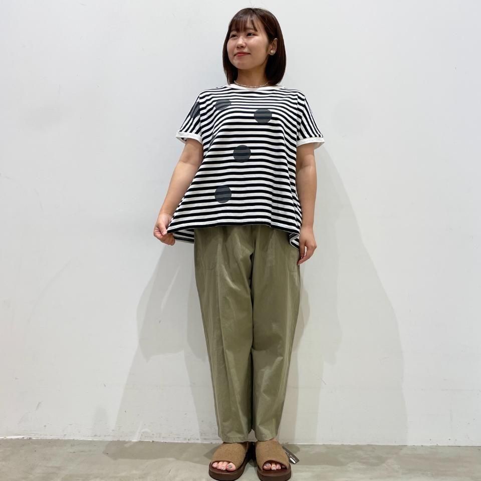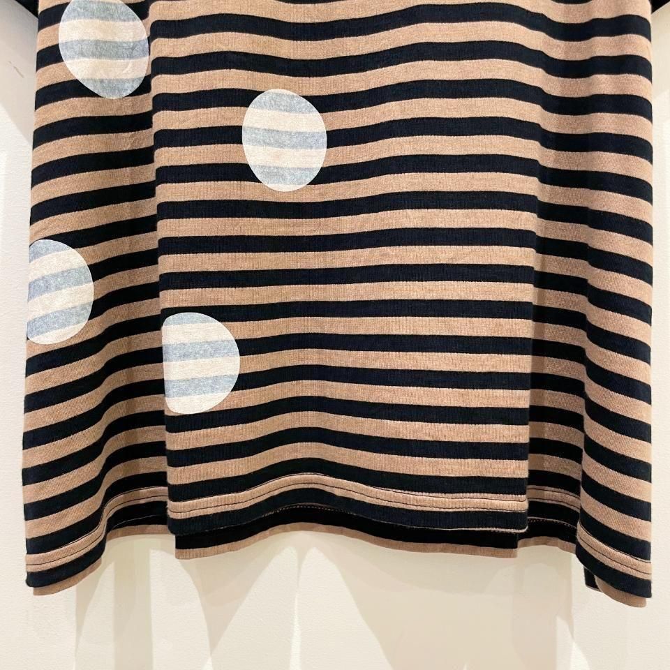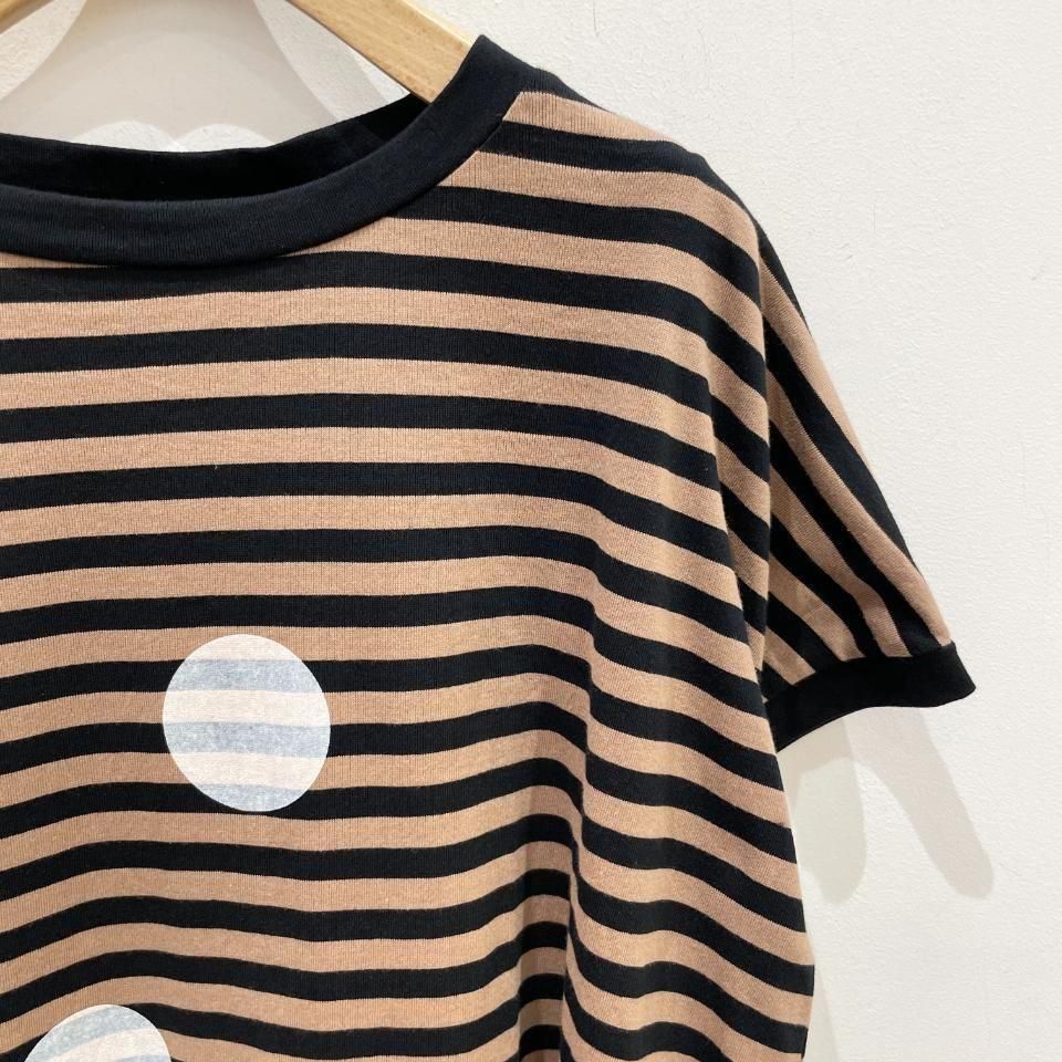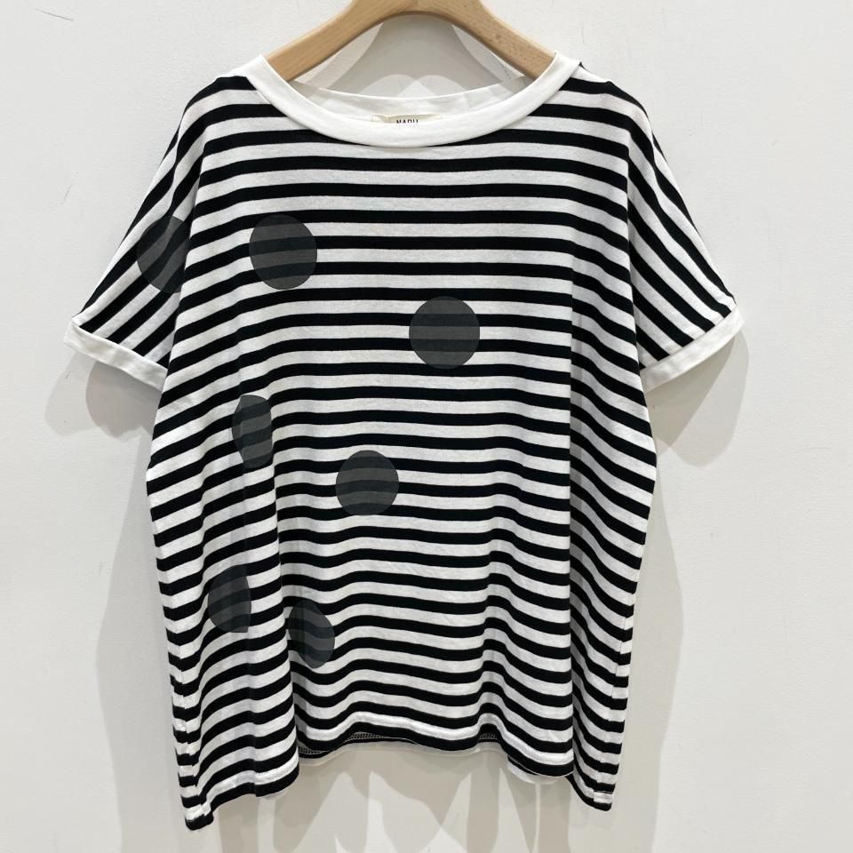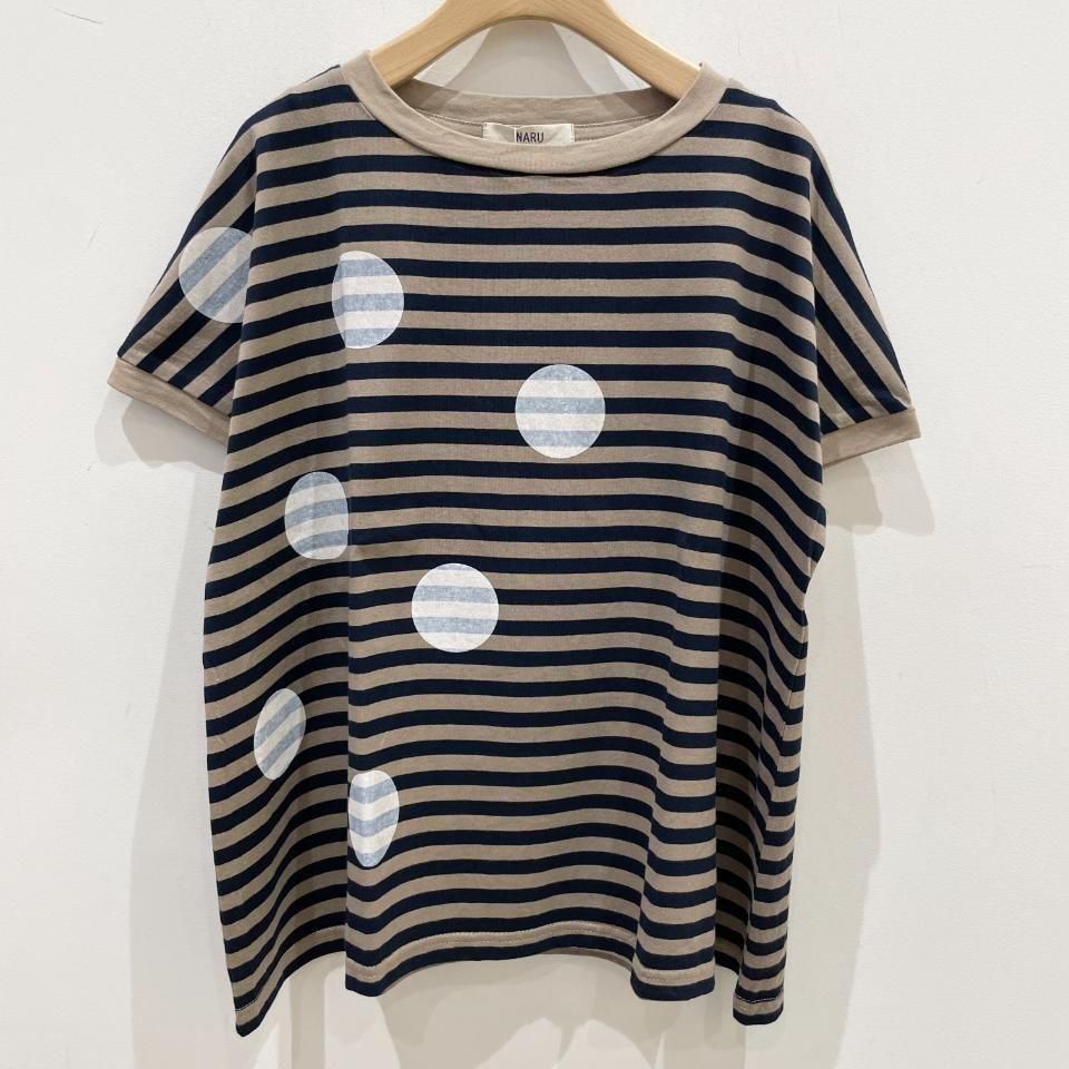 ボーダーにランダムに重ねた大きな水玉が目を惹くTシャツ。
