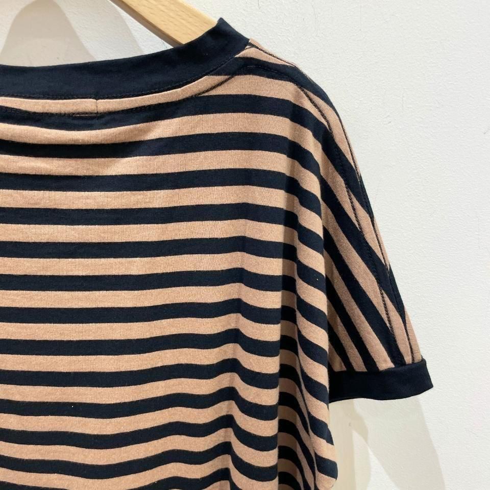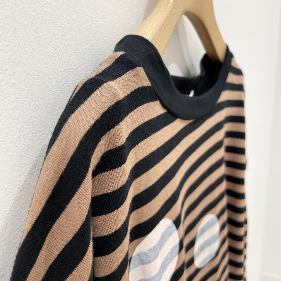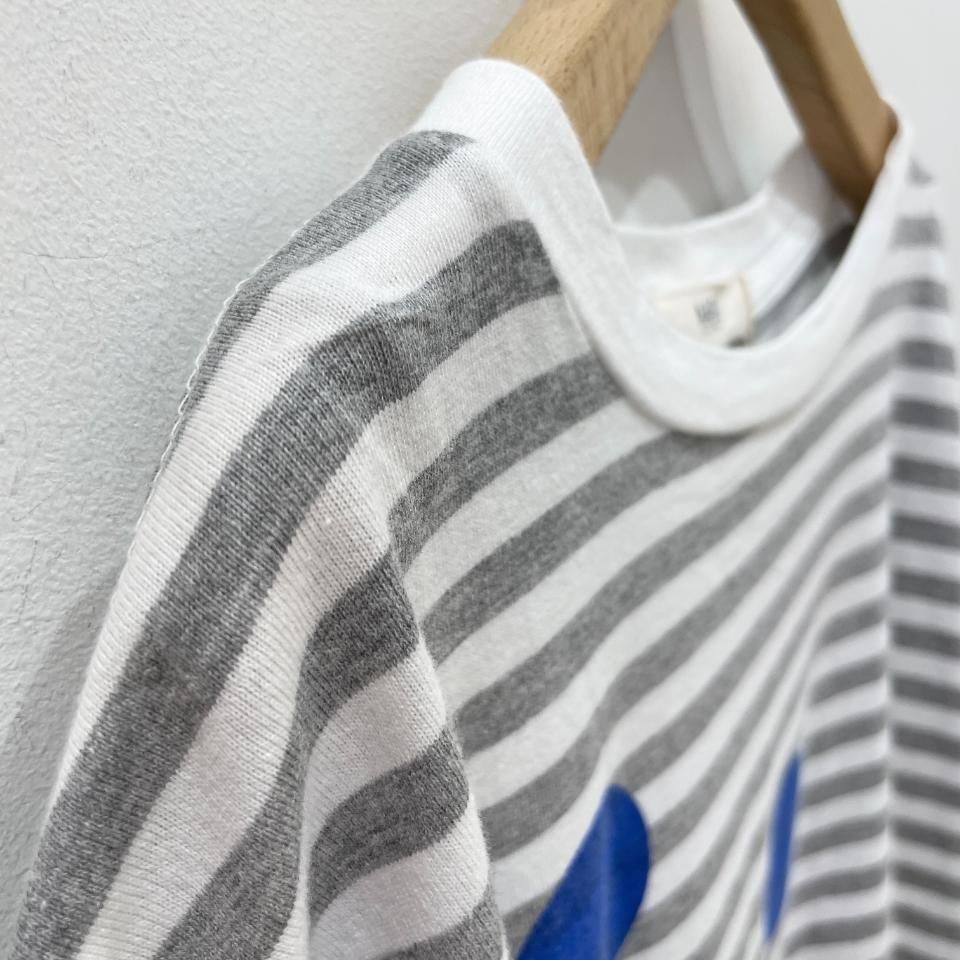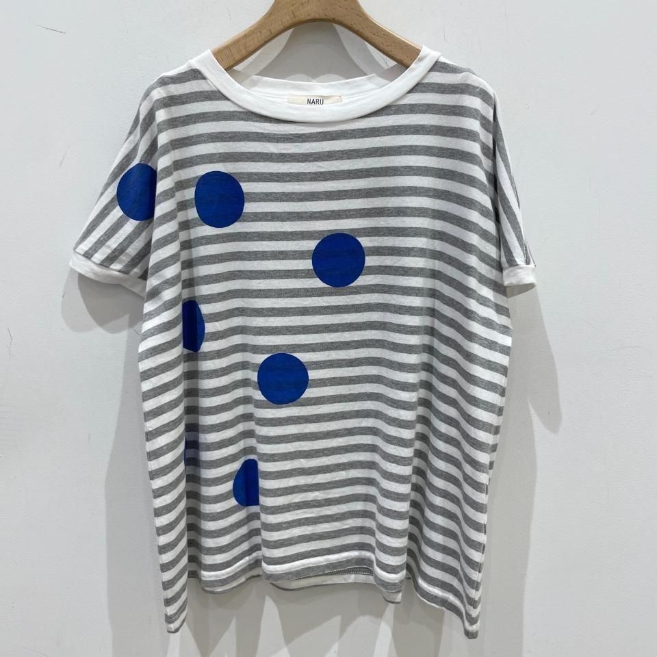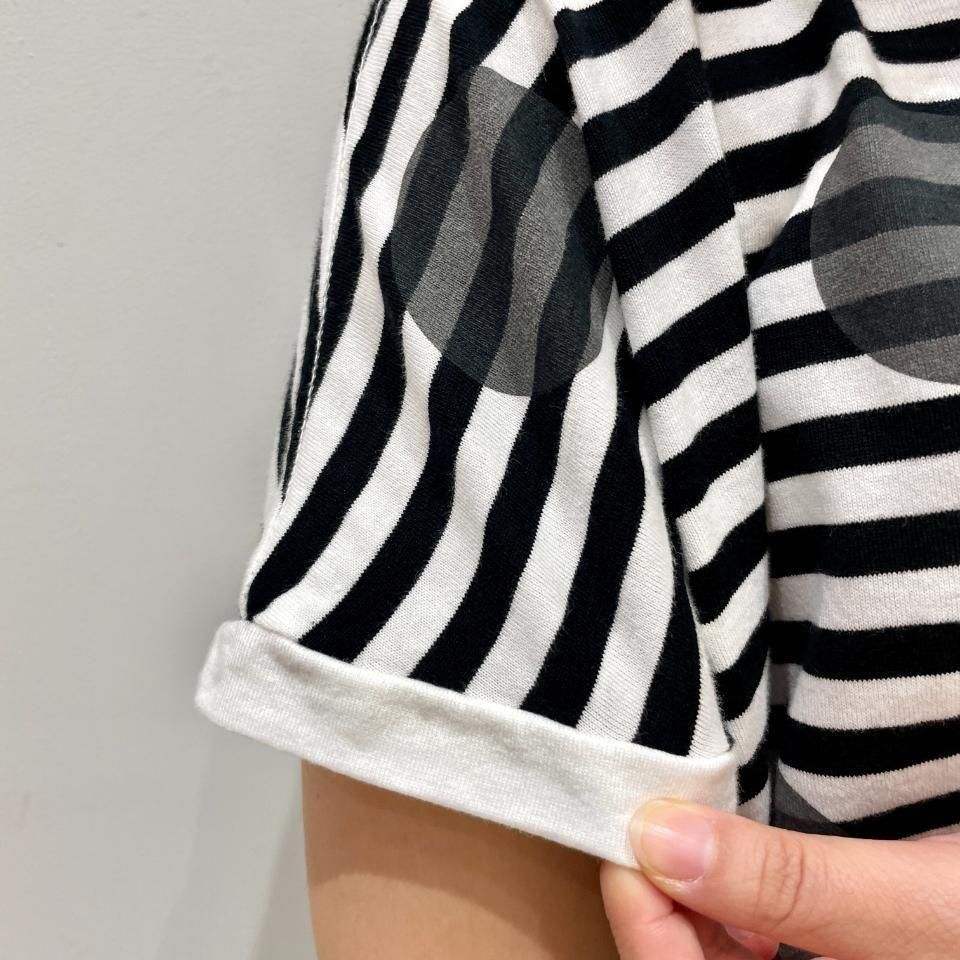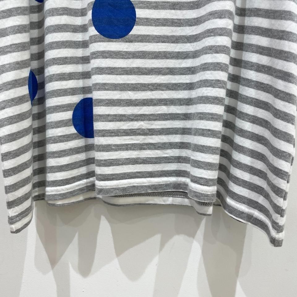 ボーダーにランダムに重ねた大きな水玉が目を惹くTシャツ。