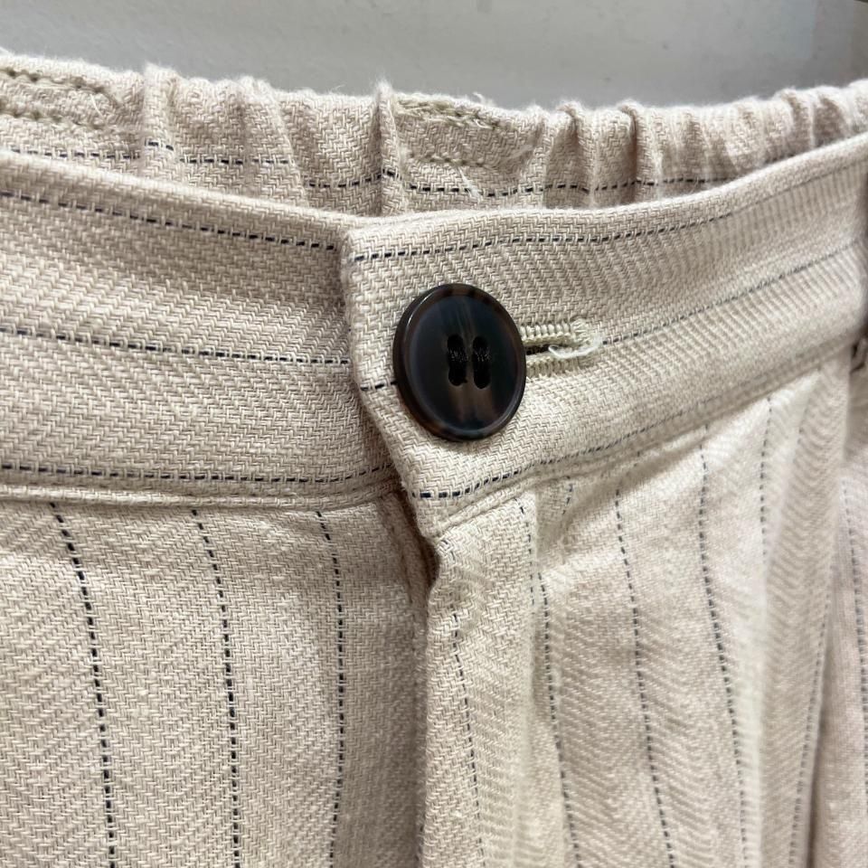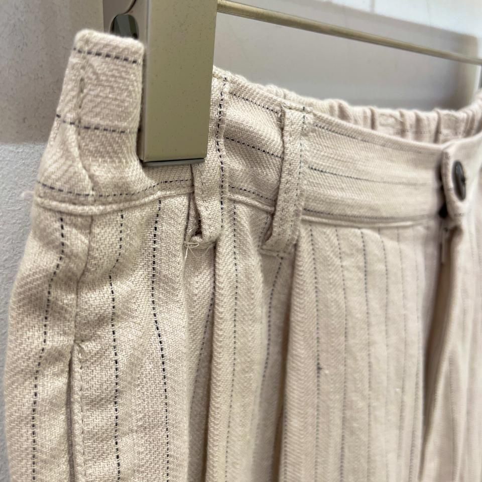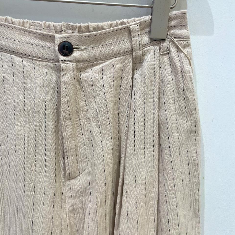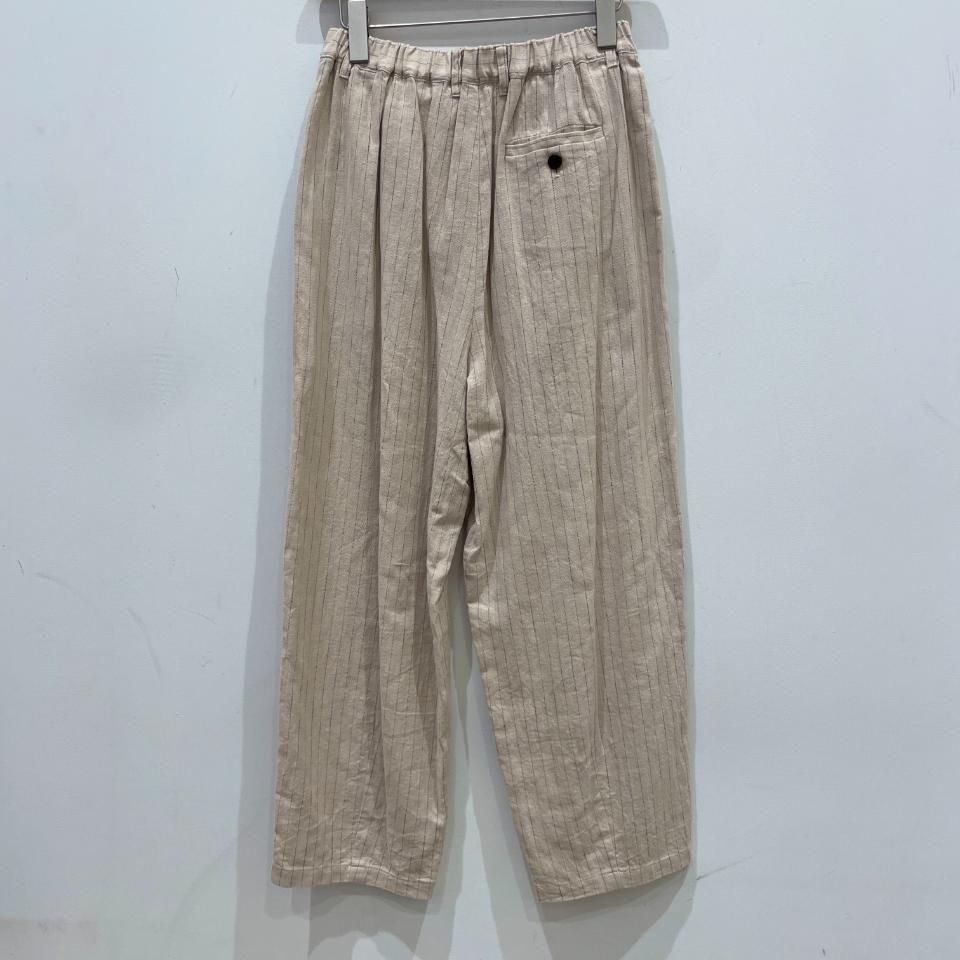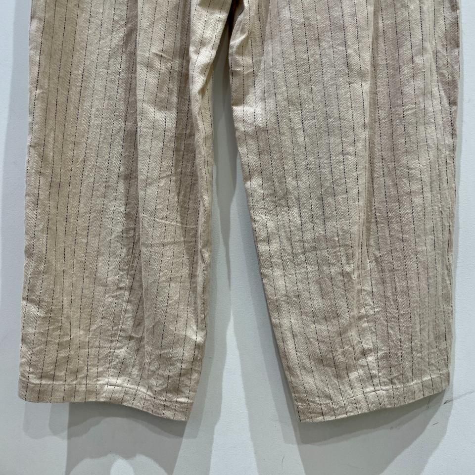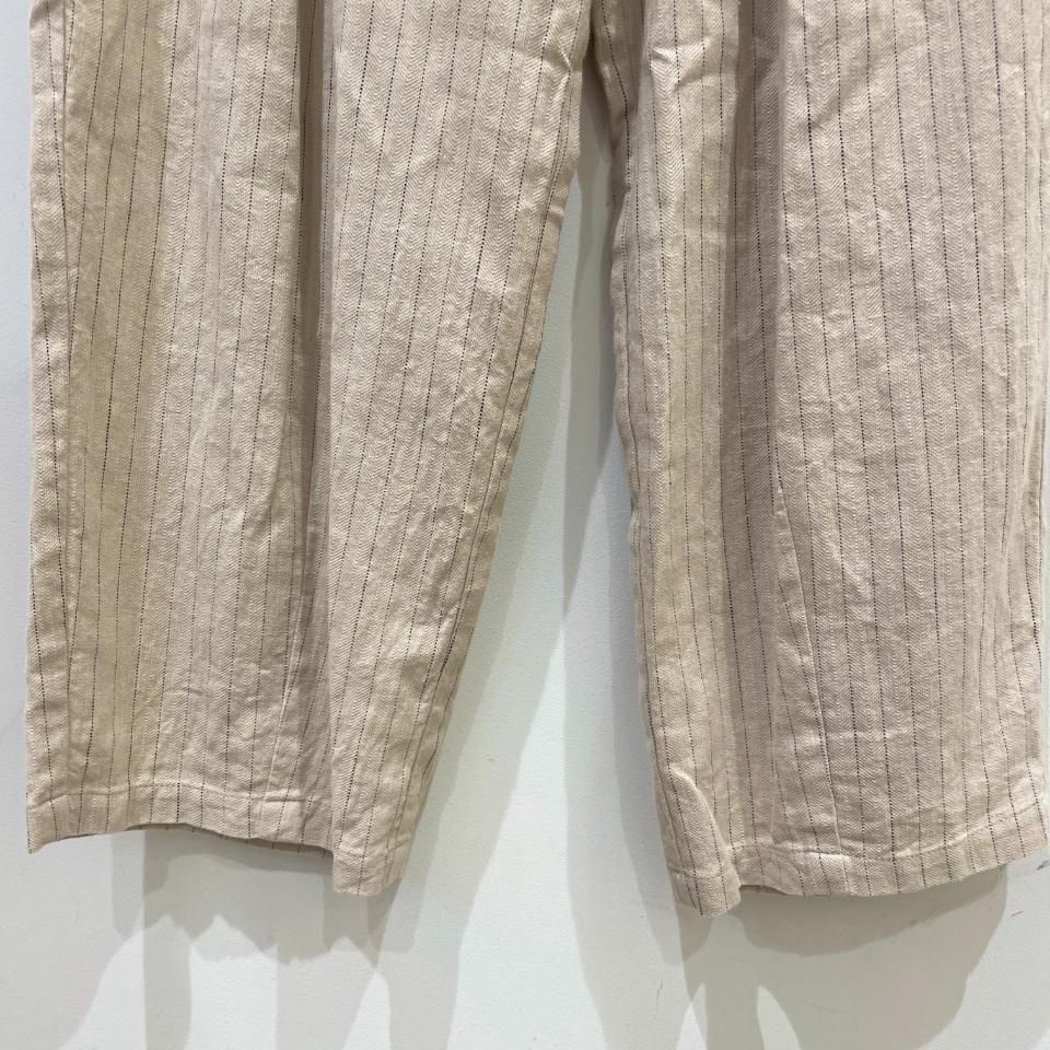 綿麻のナチュラルな風合いのストライプ柄裾タックパンツ。