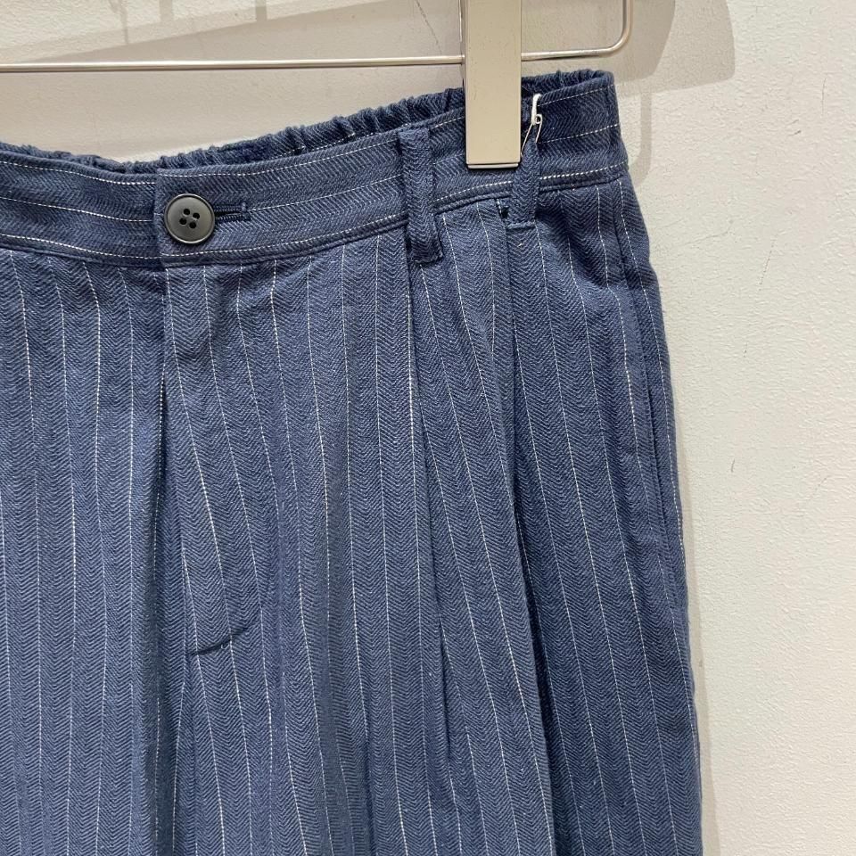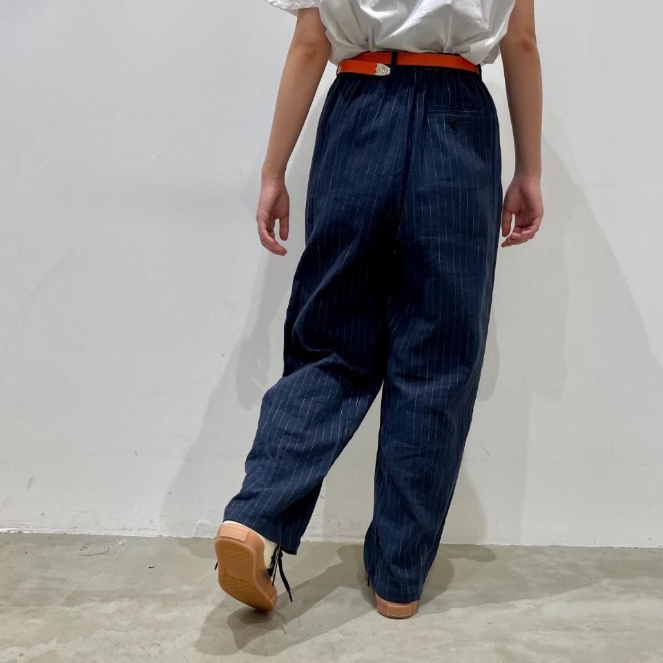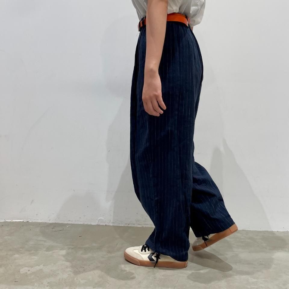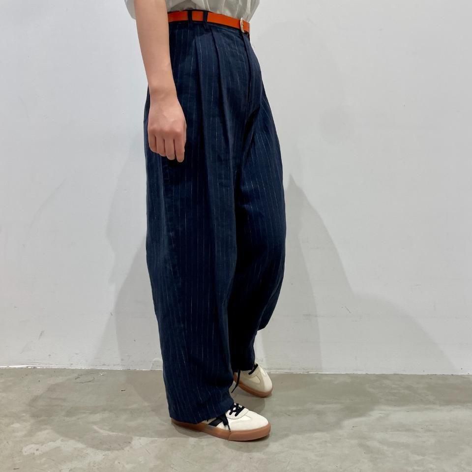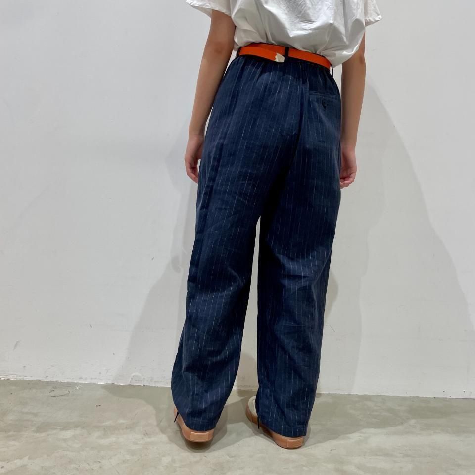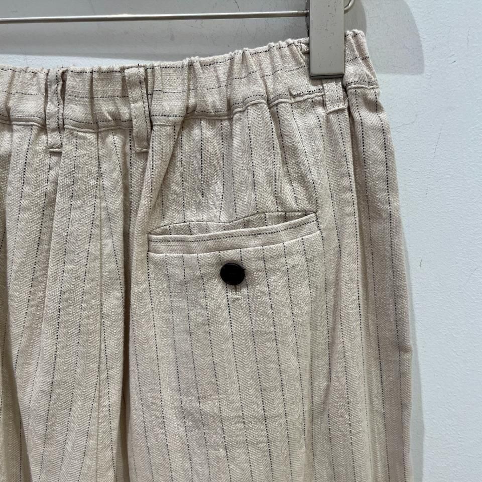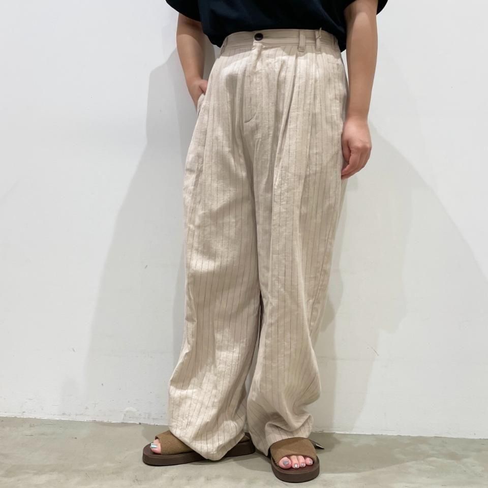 綿麻のナチュラルな風合いのストライプ柄裾タックパンツ。