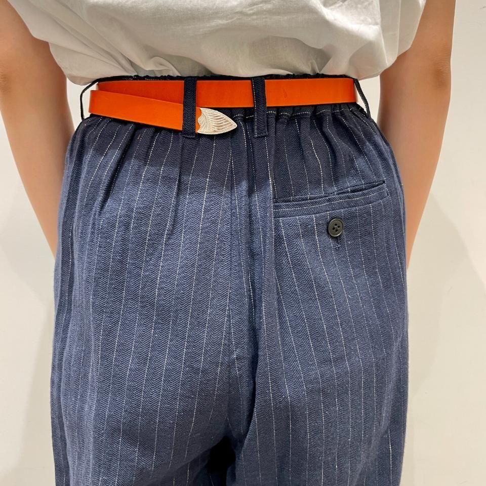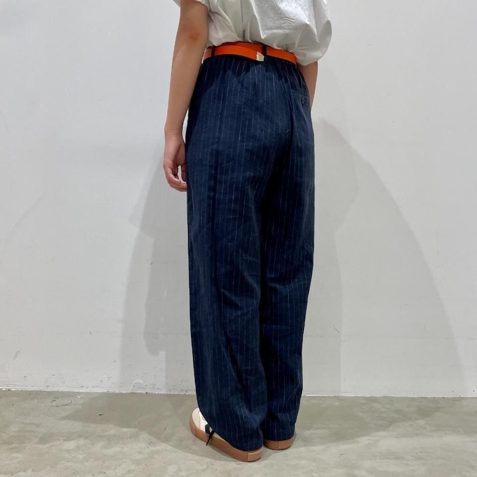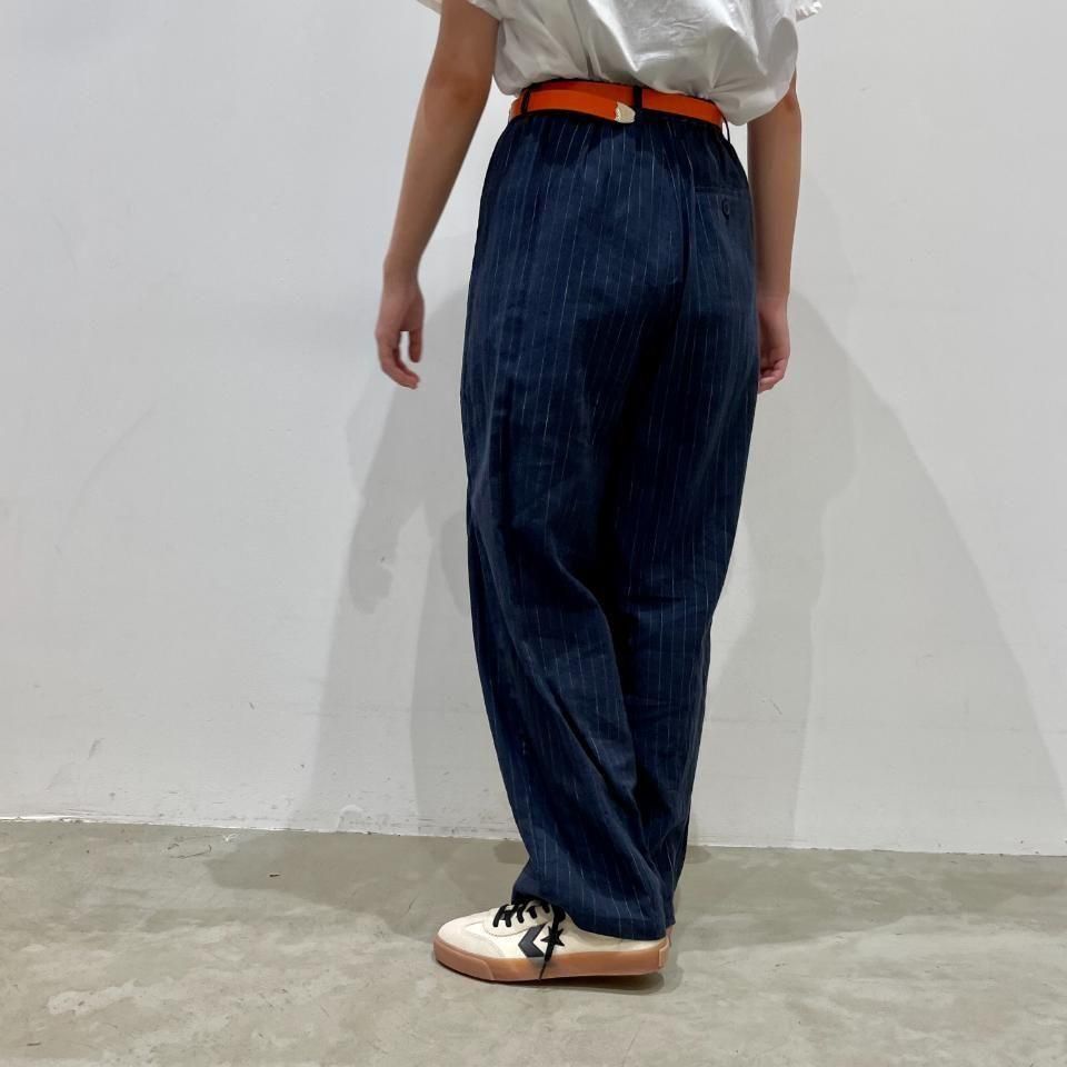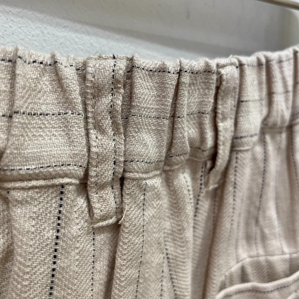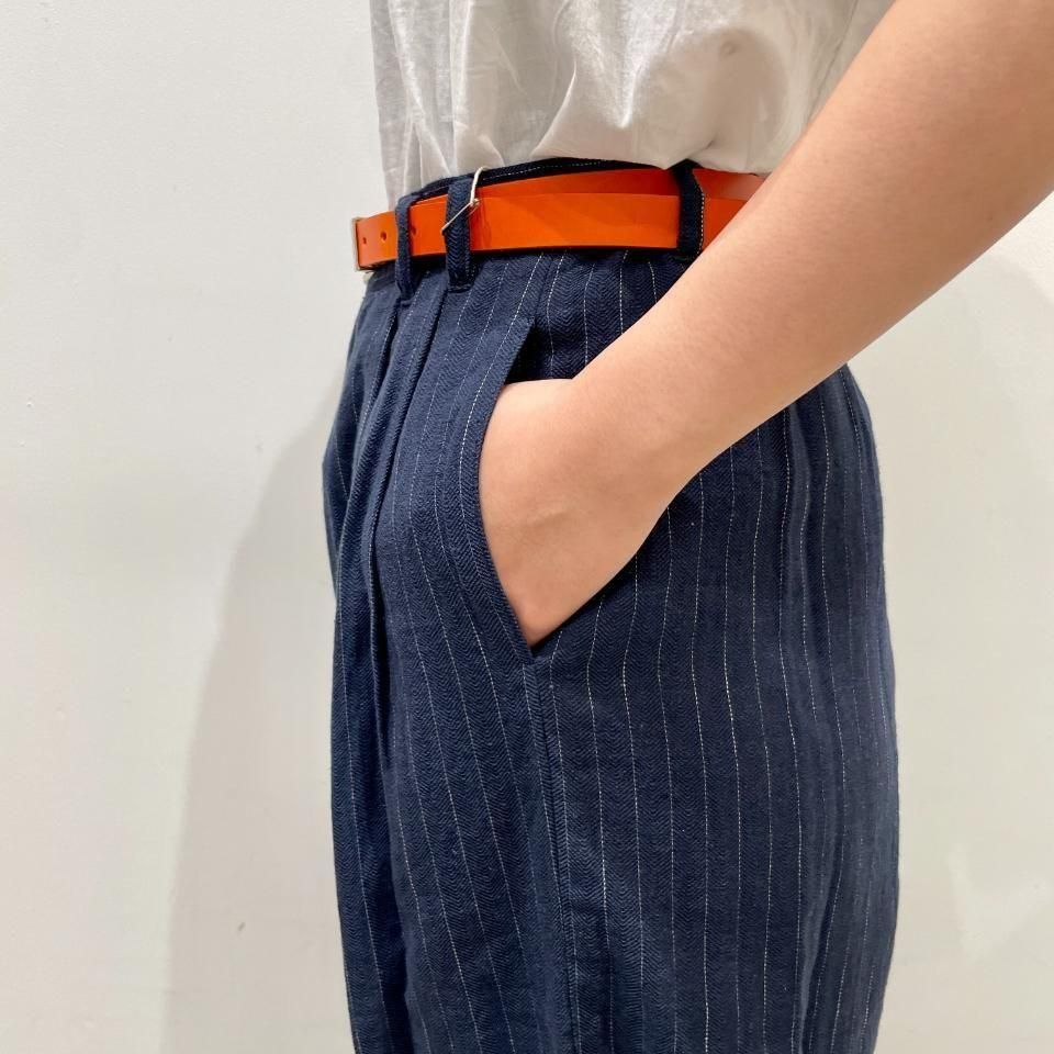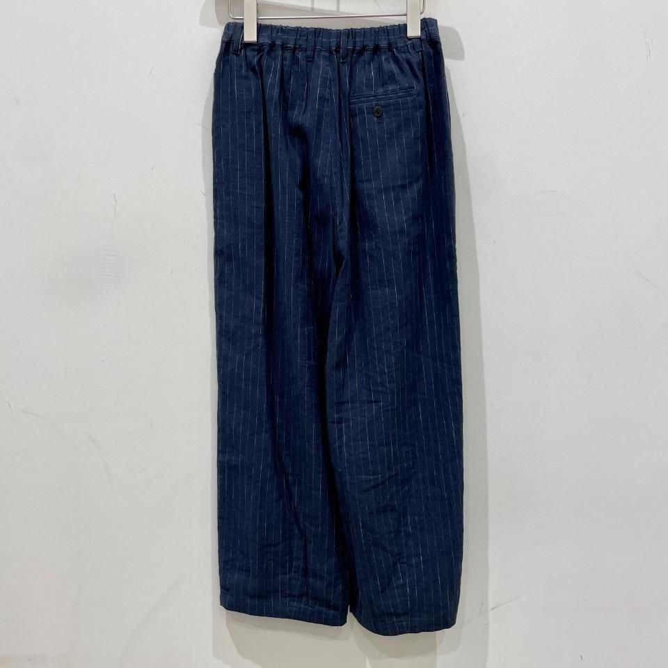 綿麻のナチュラルな風合いのストライプ柄裾タックパンツ。