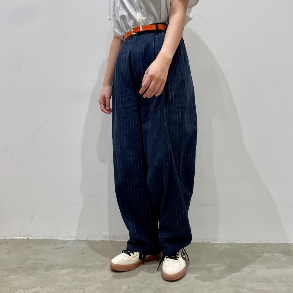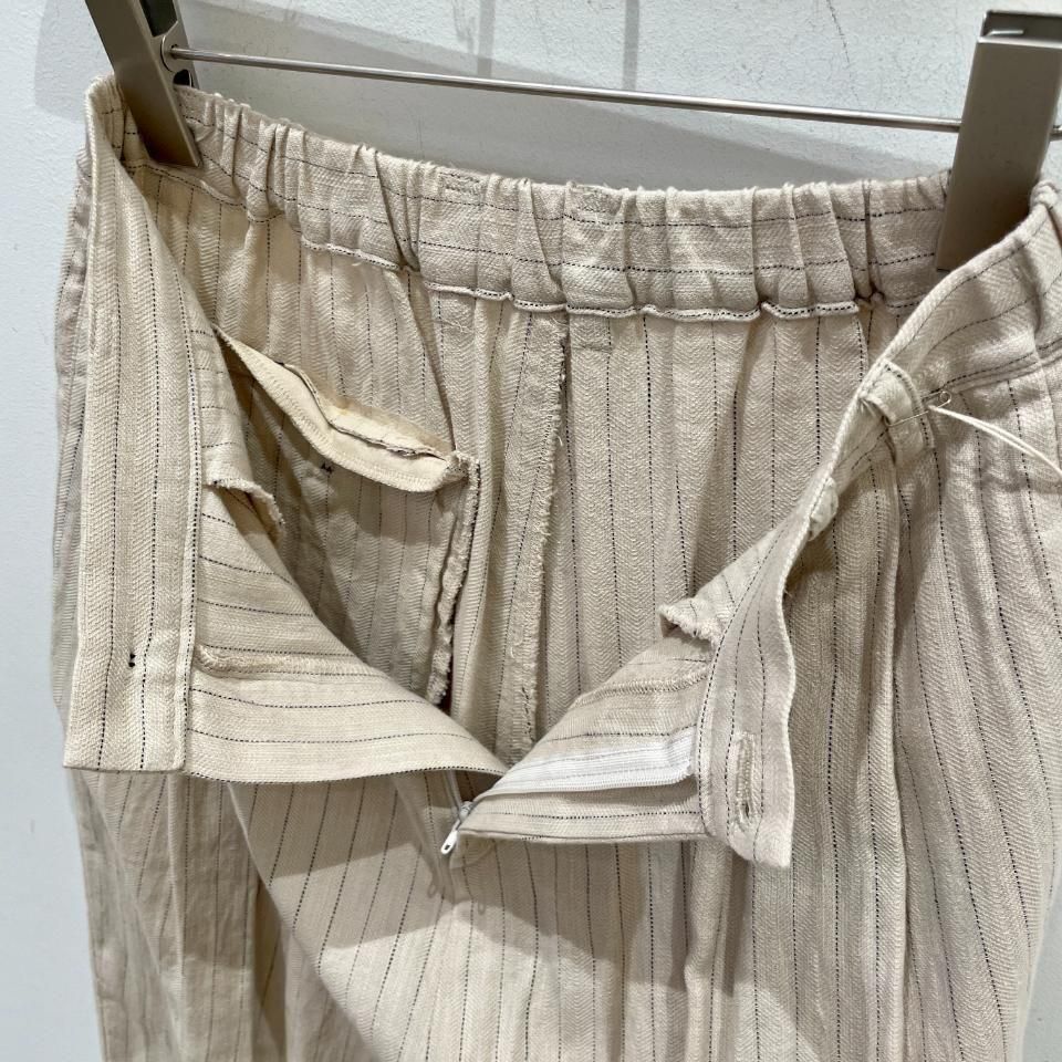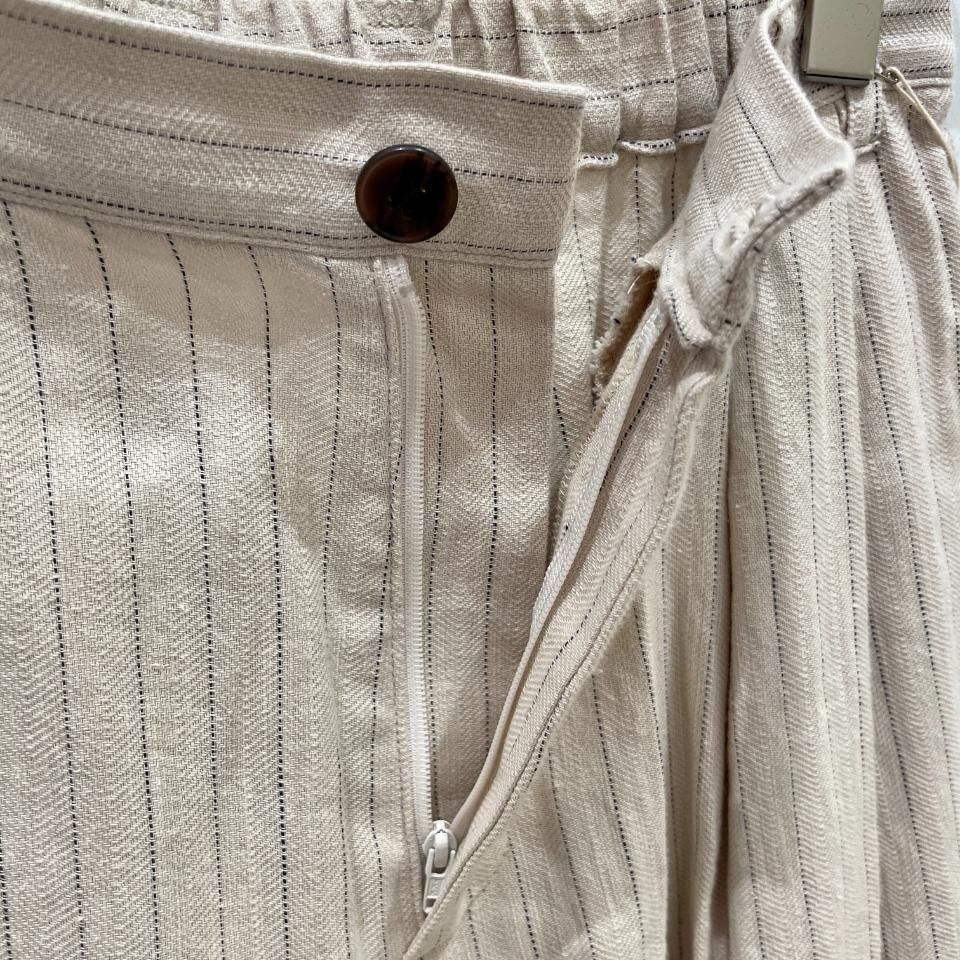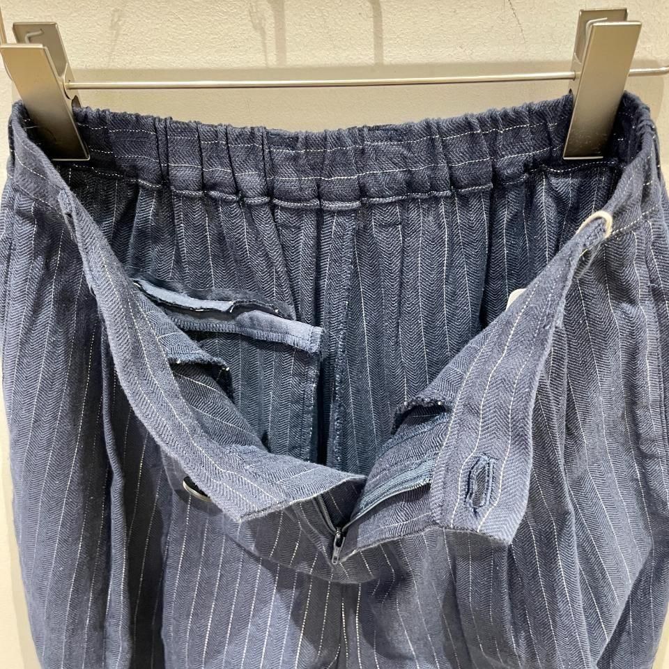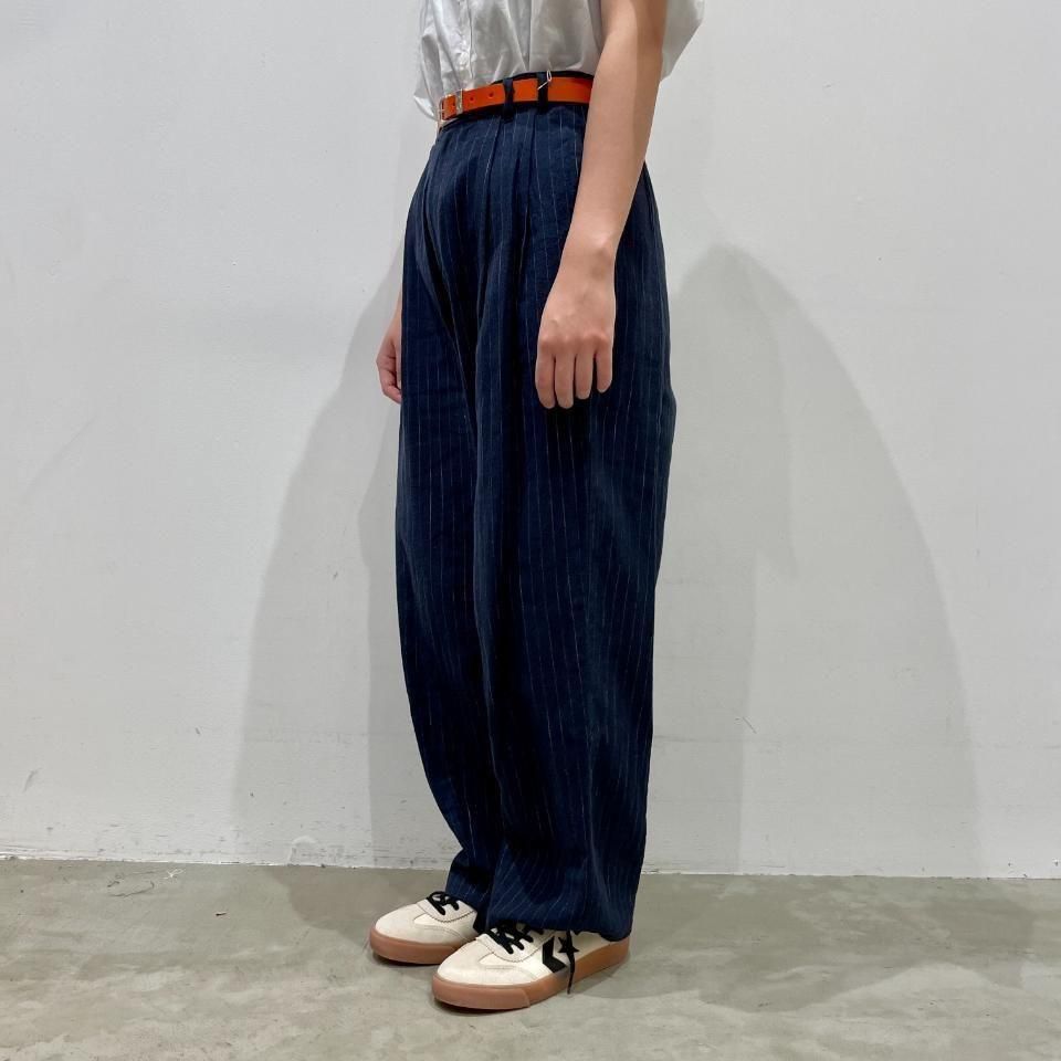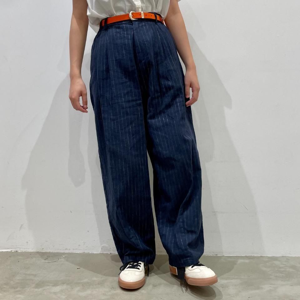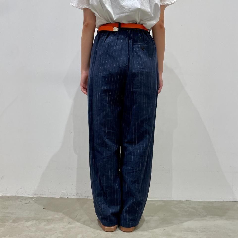 綿麻のナチュラルな風合いのストライプ柄裾タックパンツ。