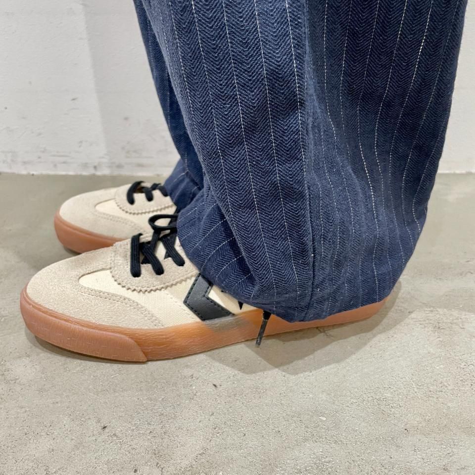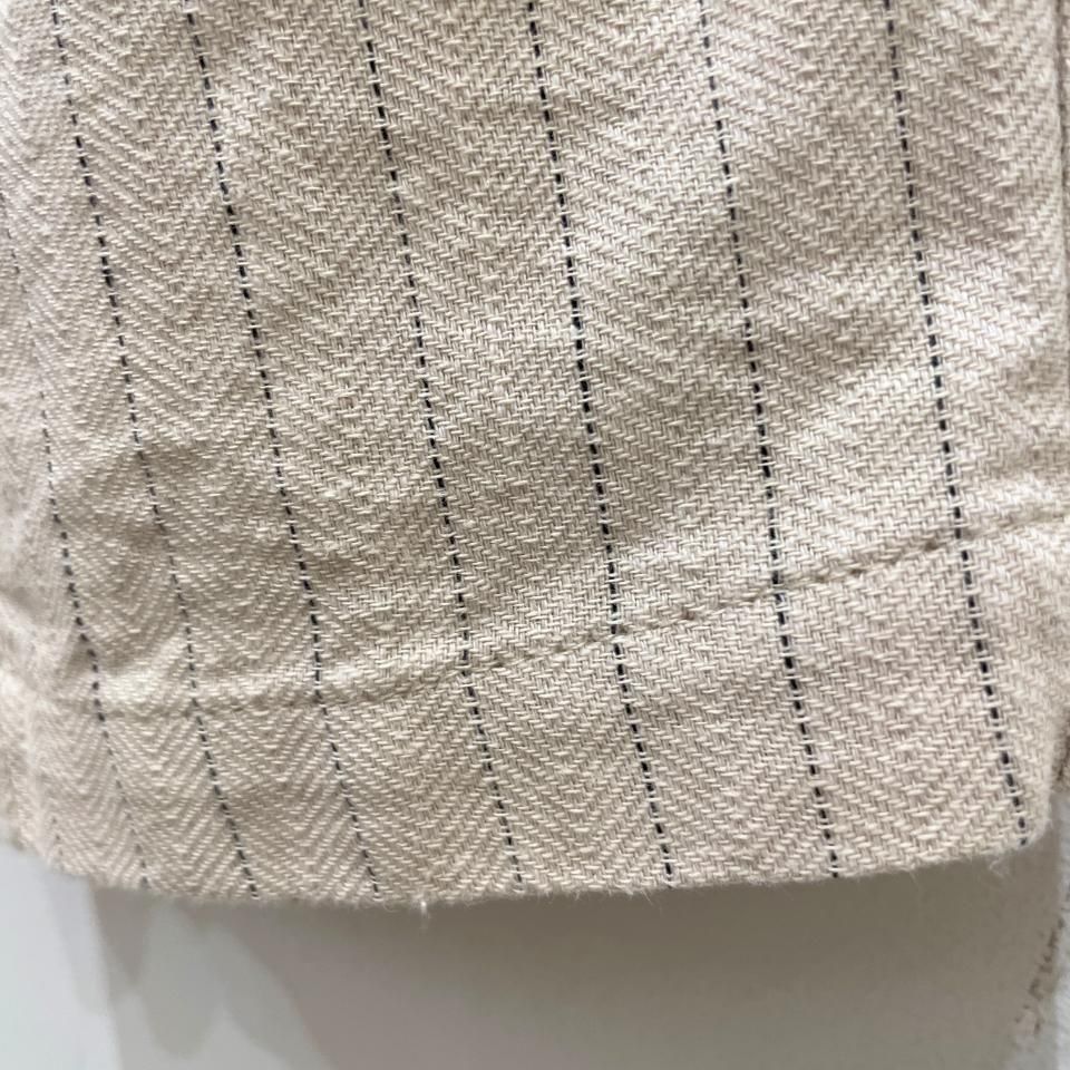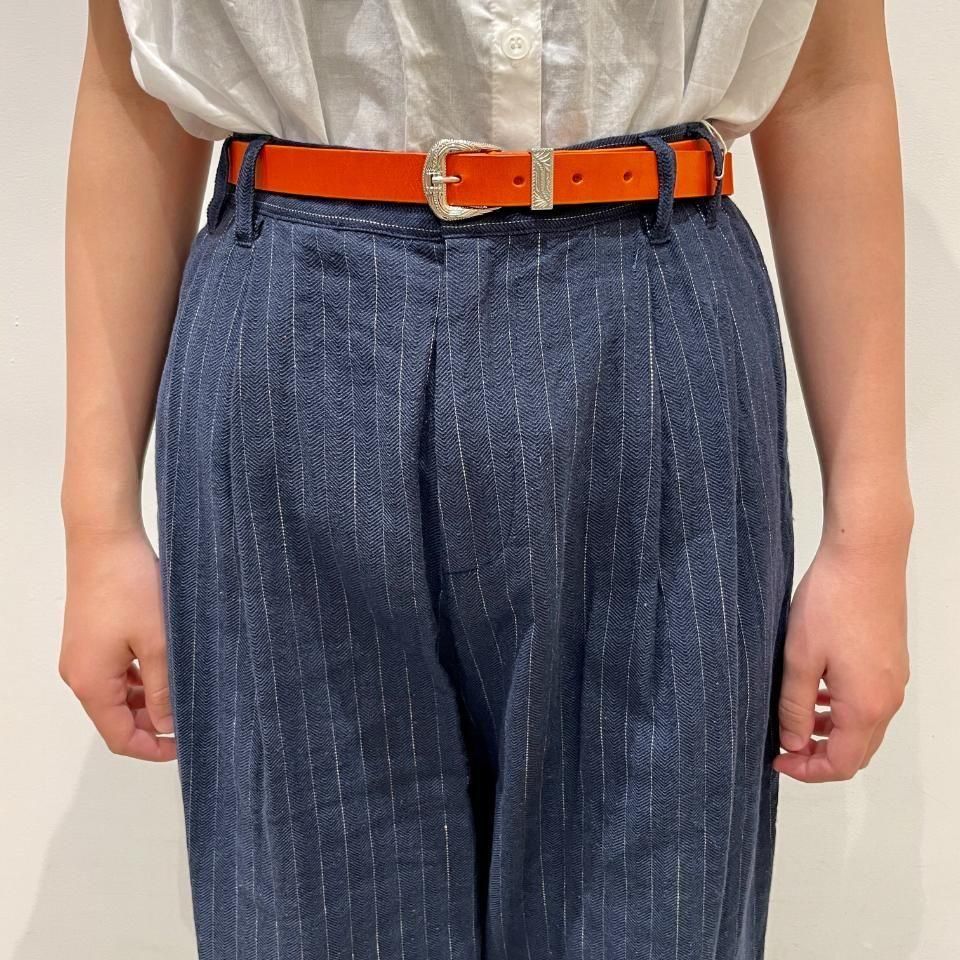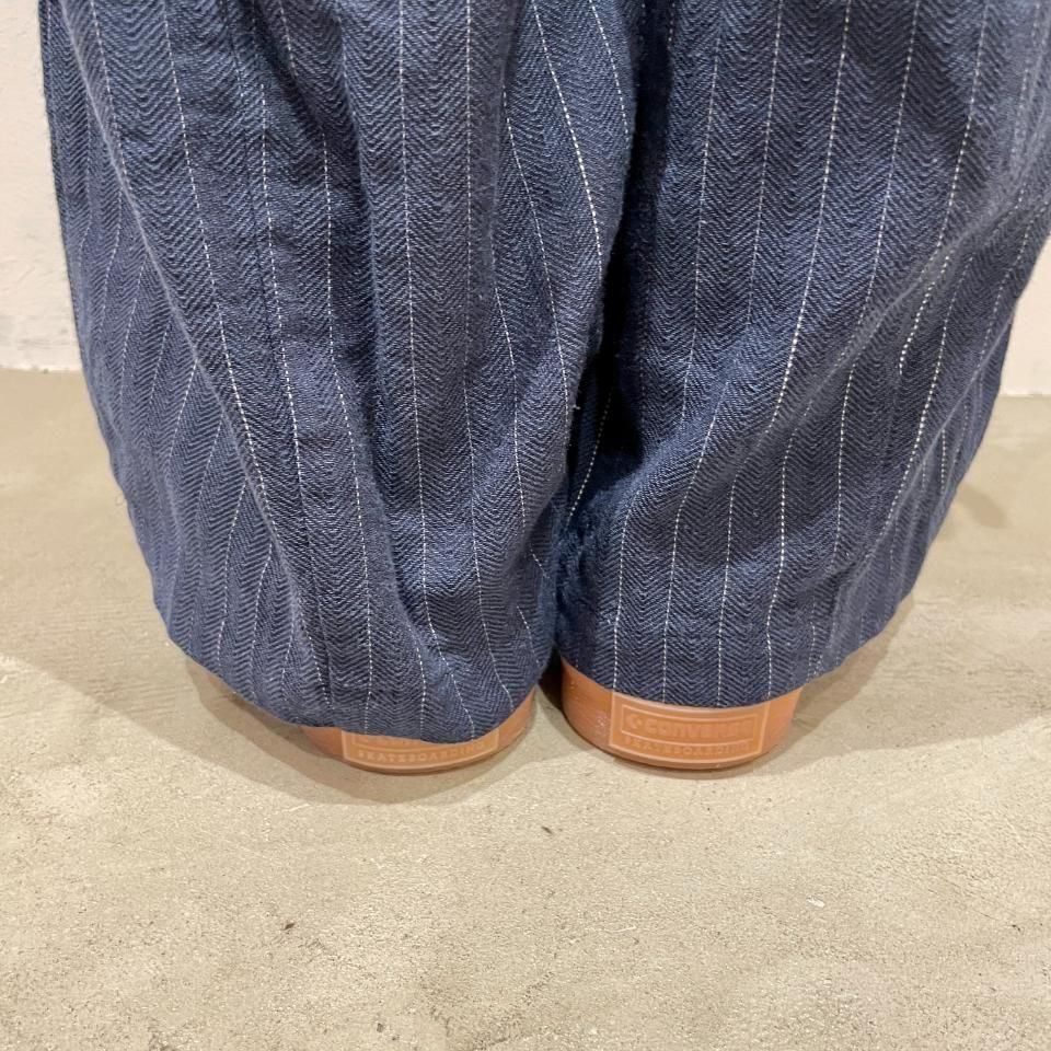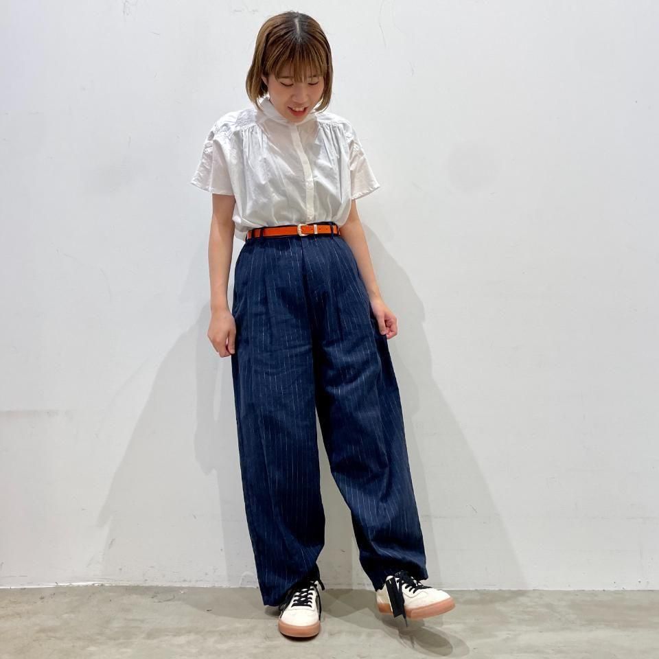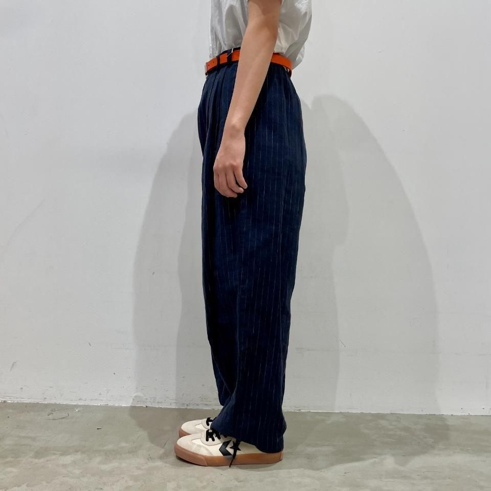 綿麻のナチュラルな風合いのストライプ柄裾タックパンツ。