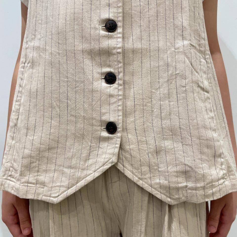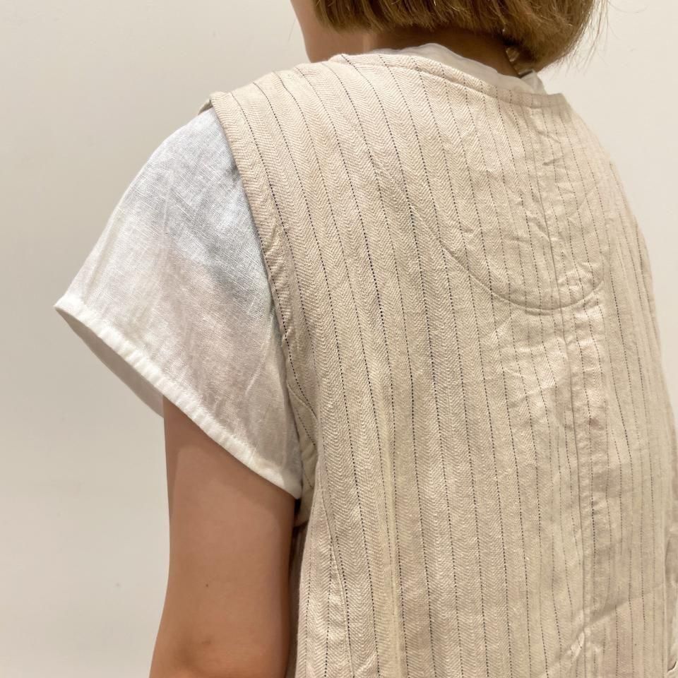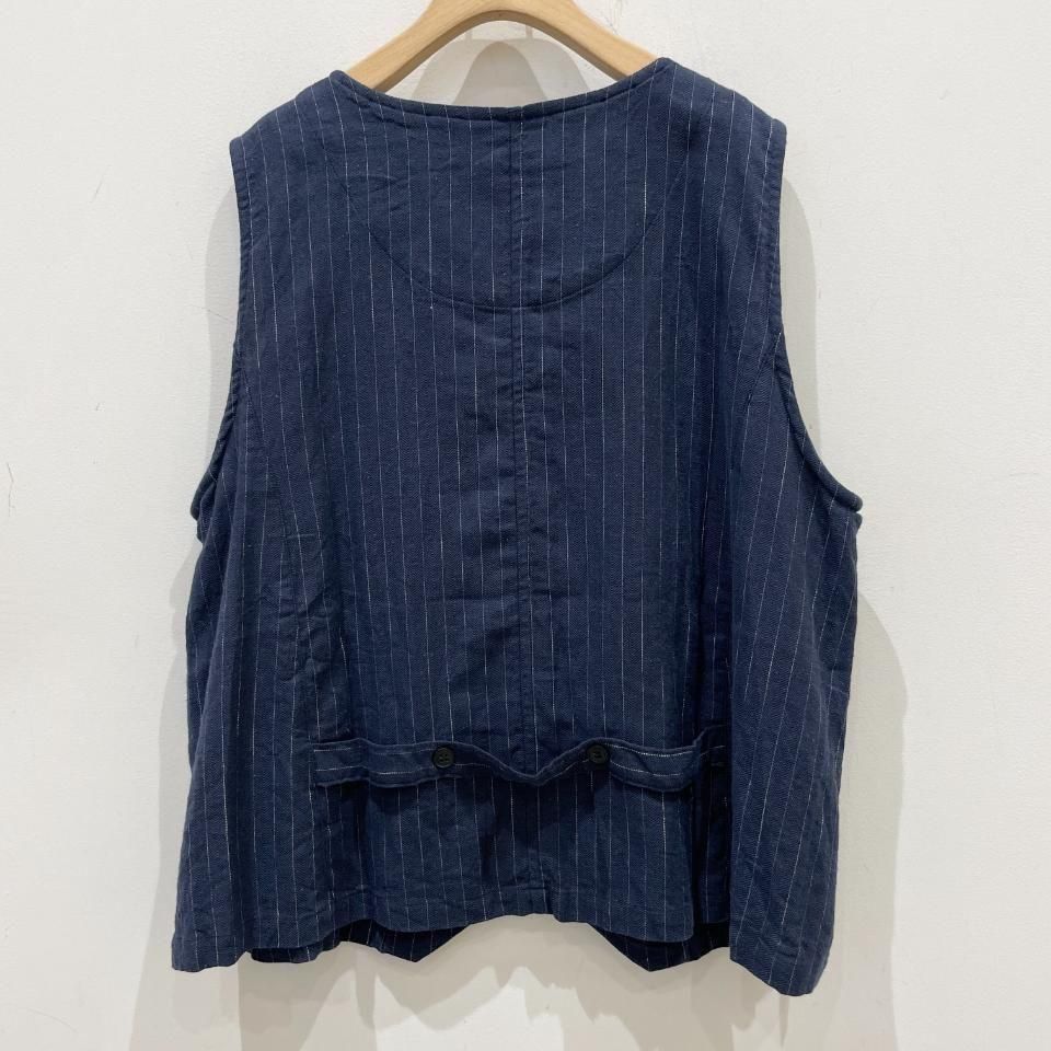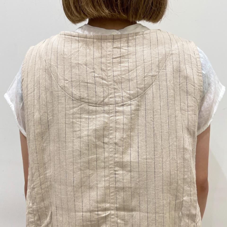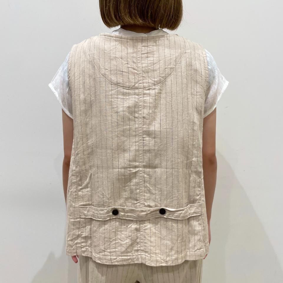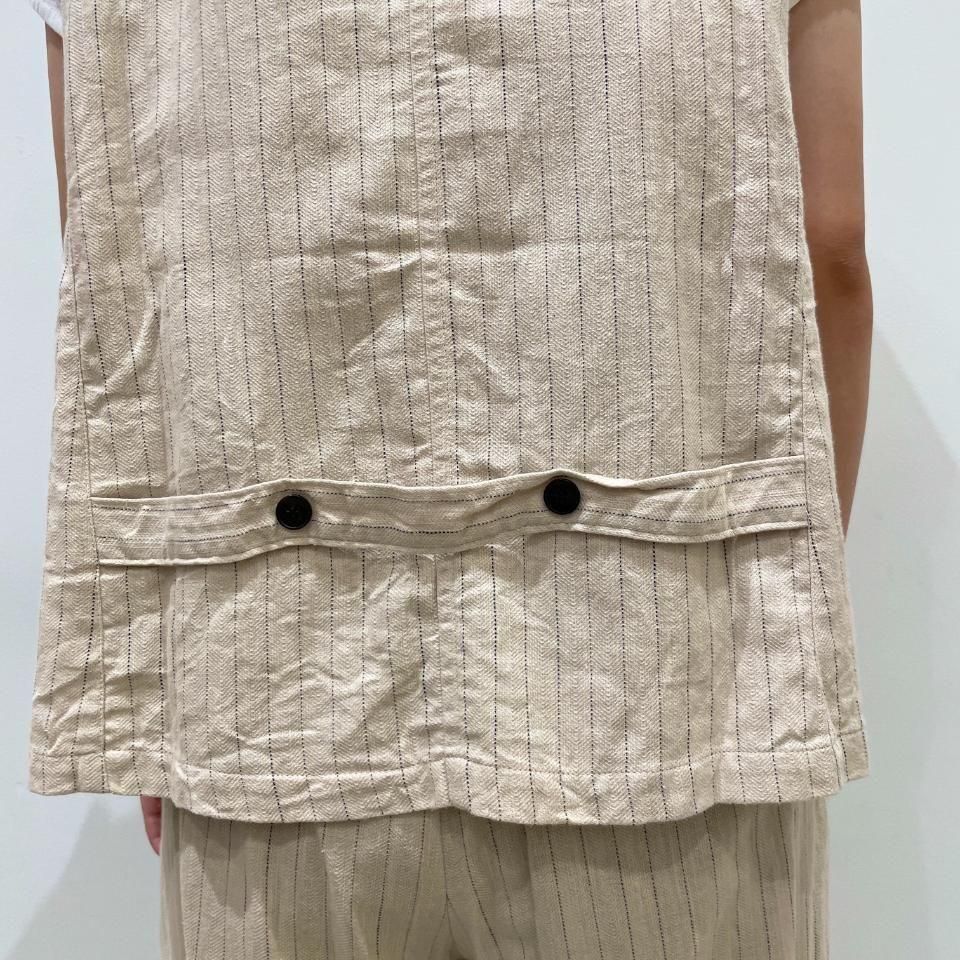 コーデにプラスしたい後ろベルト付きのストライプベスト。