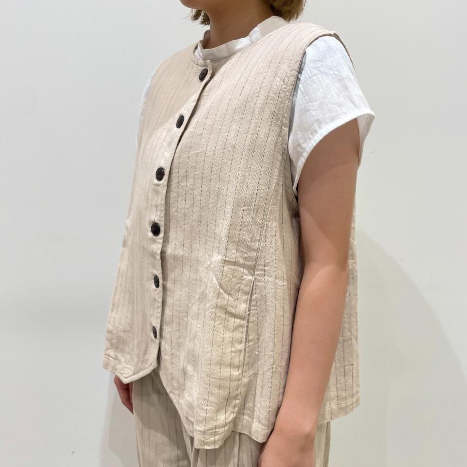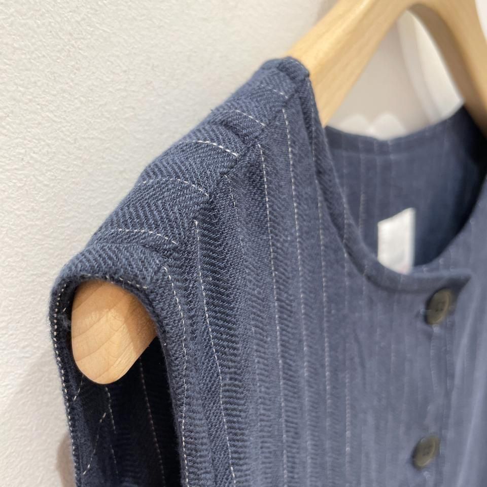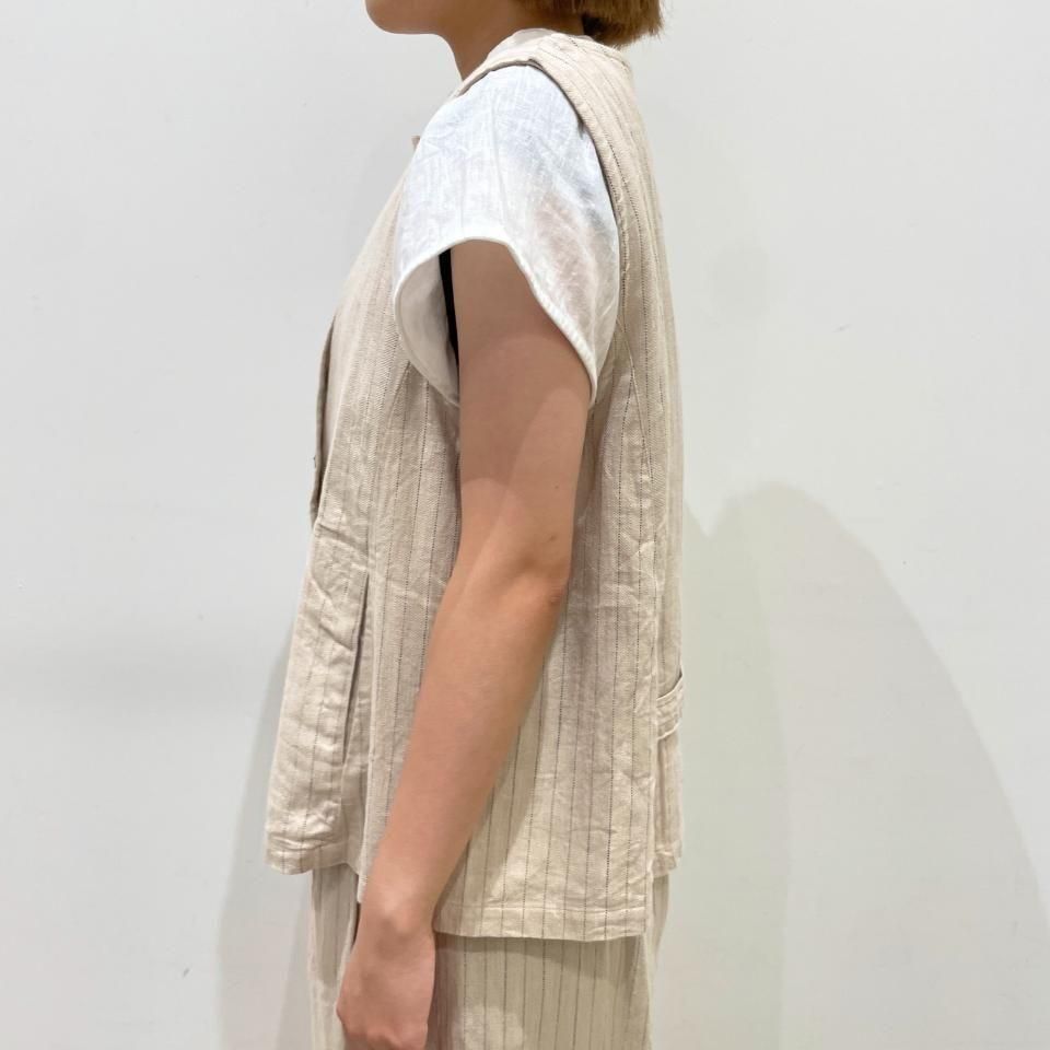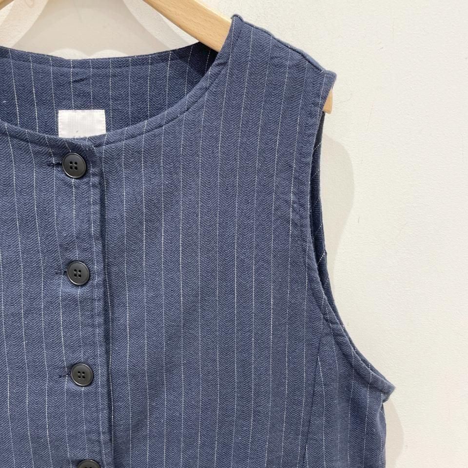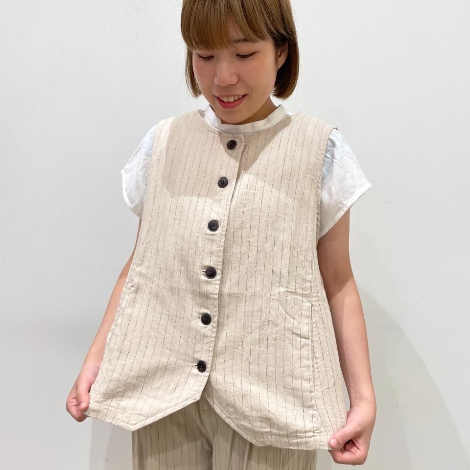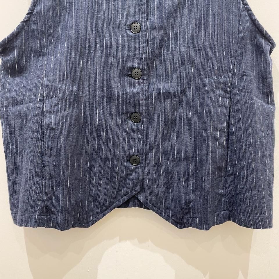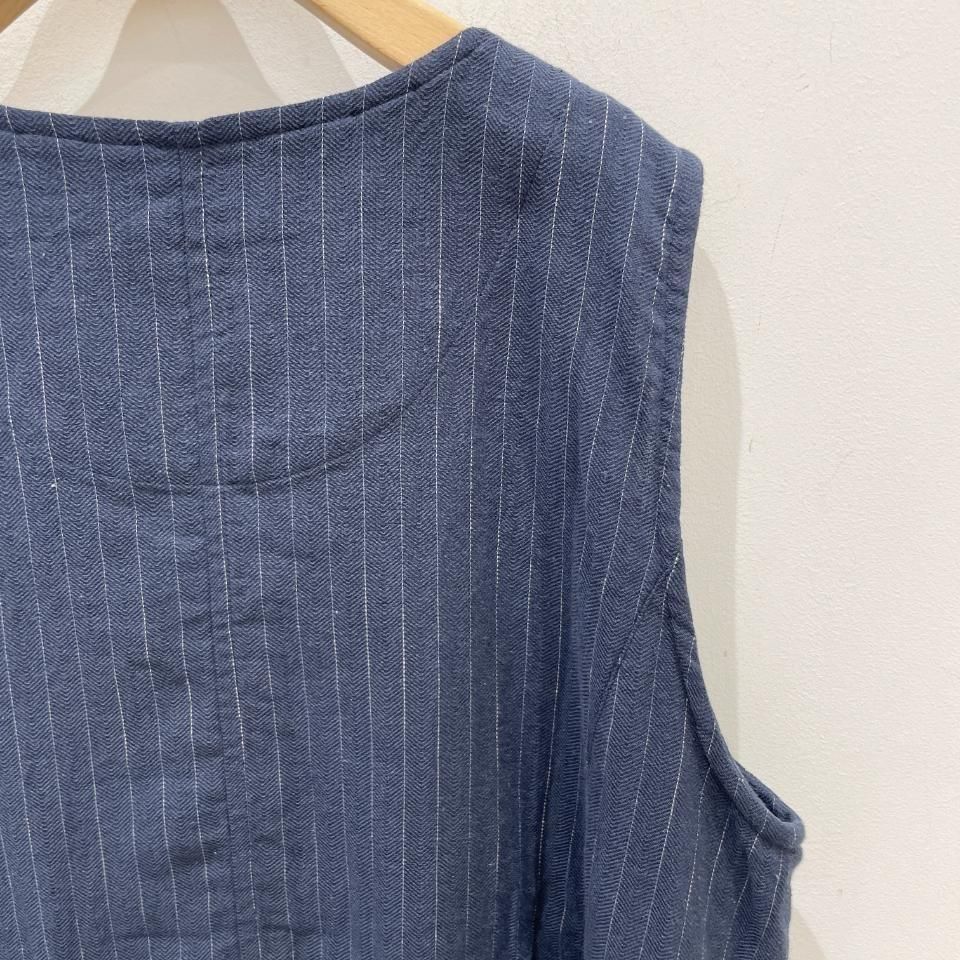 コーデにプラスしたい後ろベルト付きのストライプベスト。